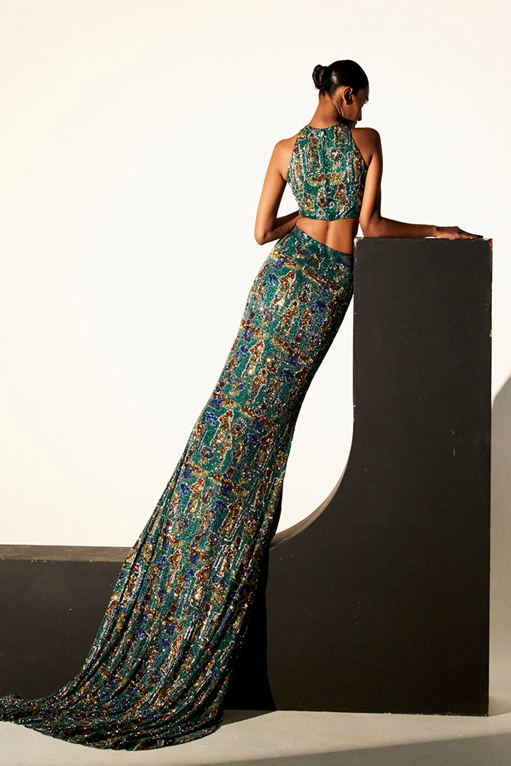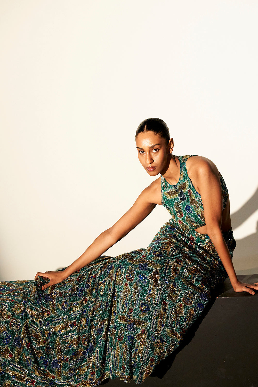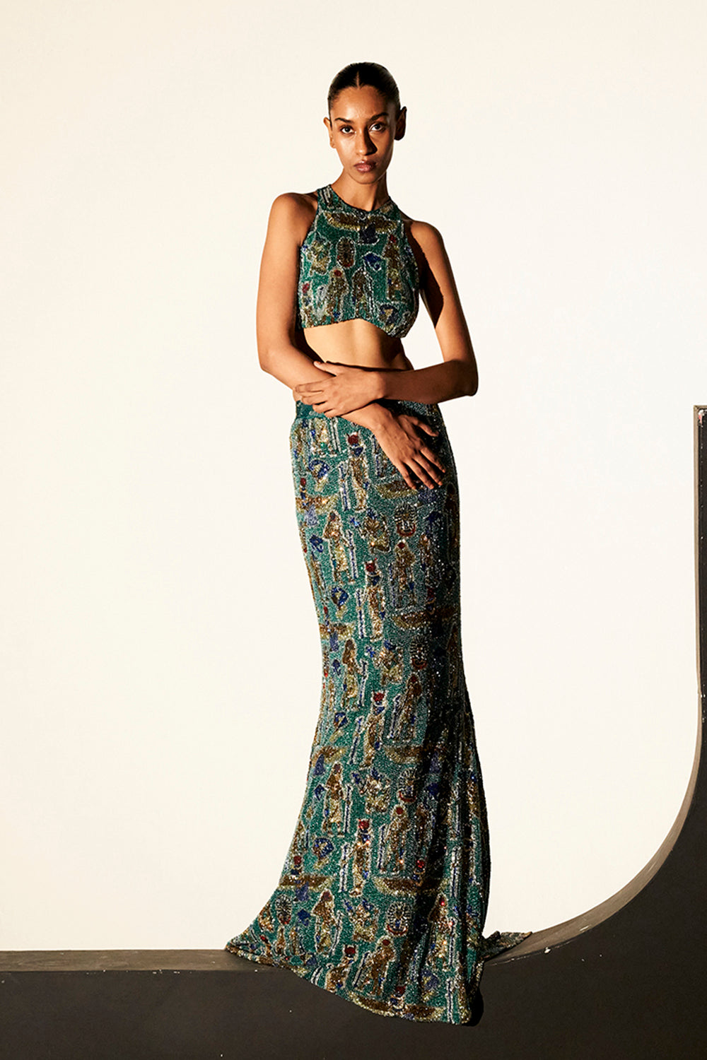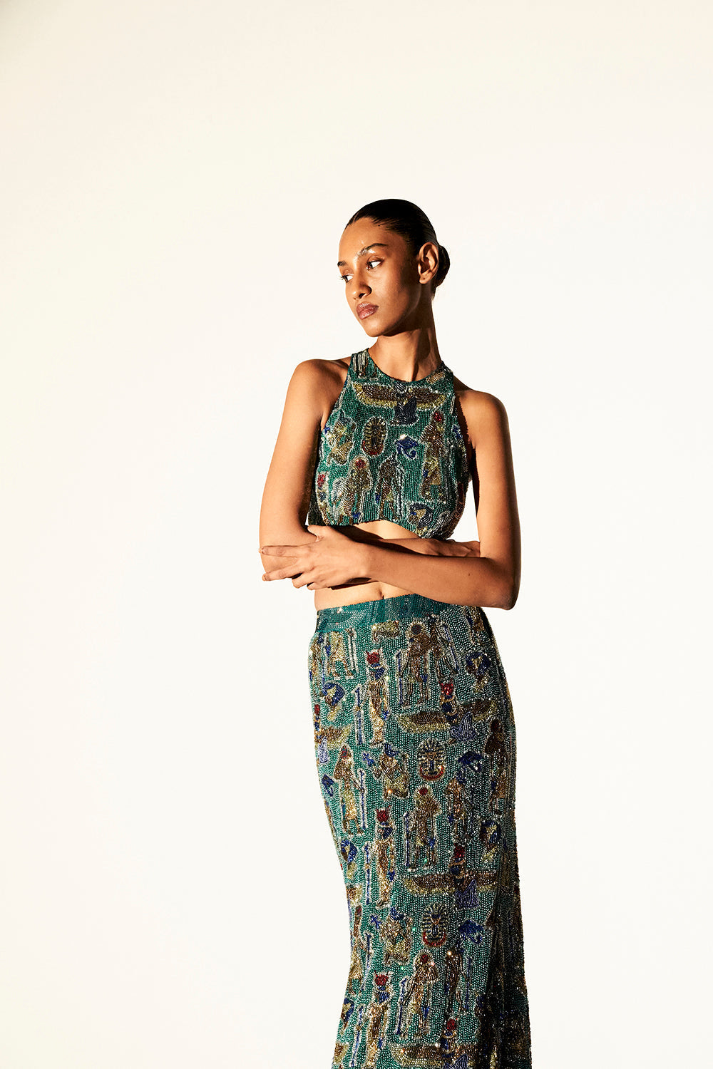 This captivating green top and skirt set is meticulously e,broidered all over, showcasing intricately beaded hand embroidery details inspired by ancient egyptian motifs.
