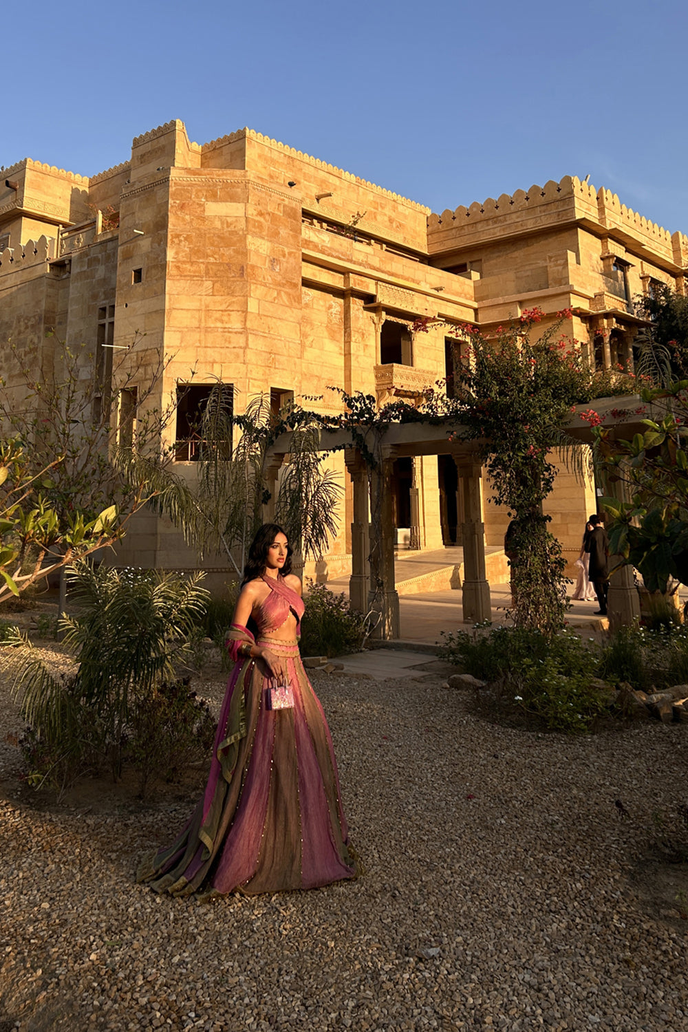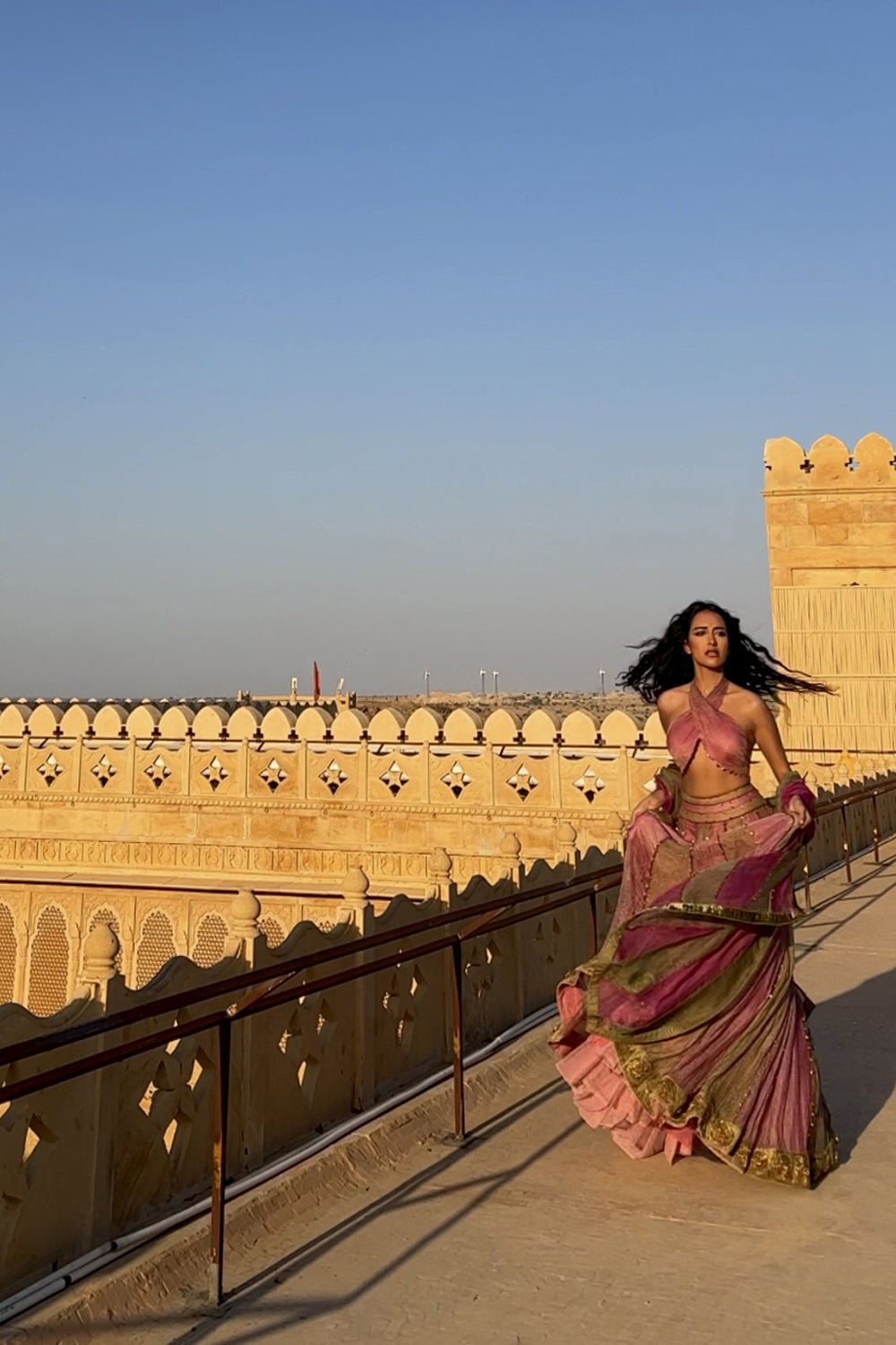 Halter blouse intricated with ghunghroo finishing paired with vertical color blocked lehenga, with dot embellished border which is further paired with organza double tone dupatta.