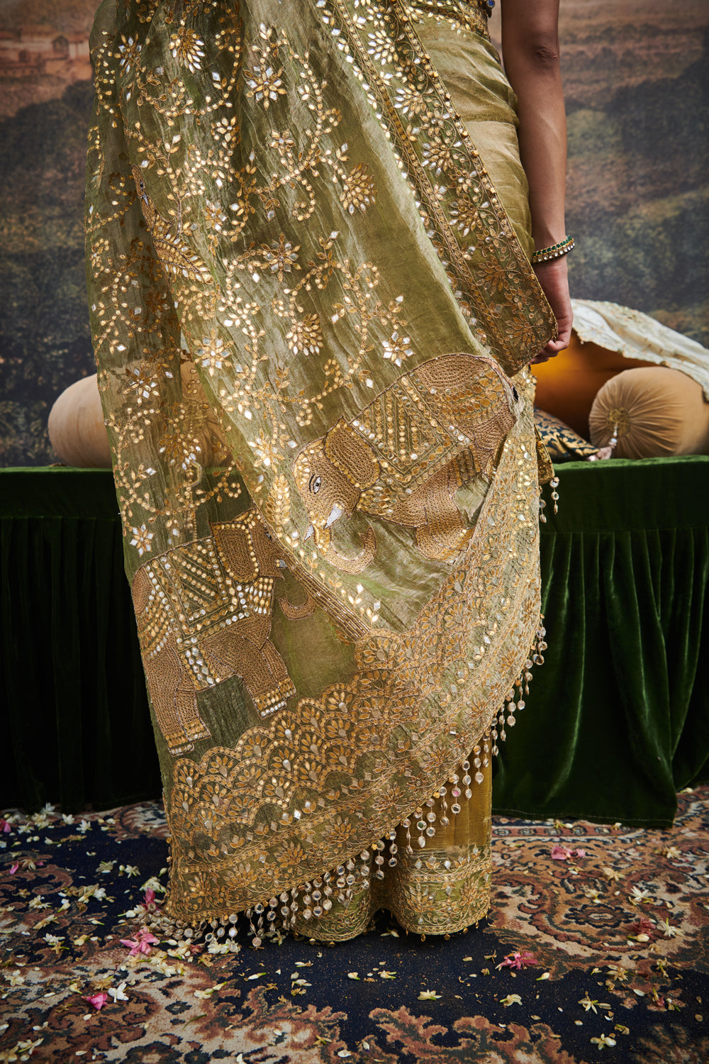 Tissue saree with dabka work gotta patti boder with ghumroos ,styled with a chanderi silk blouse with mirror work.