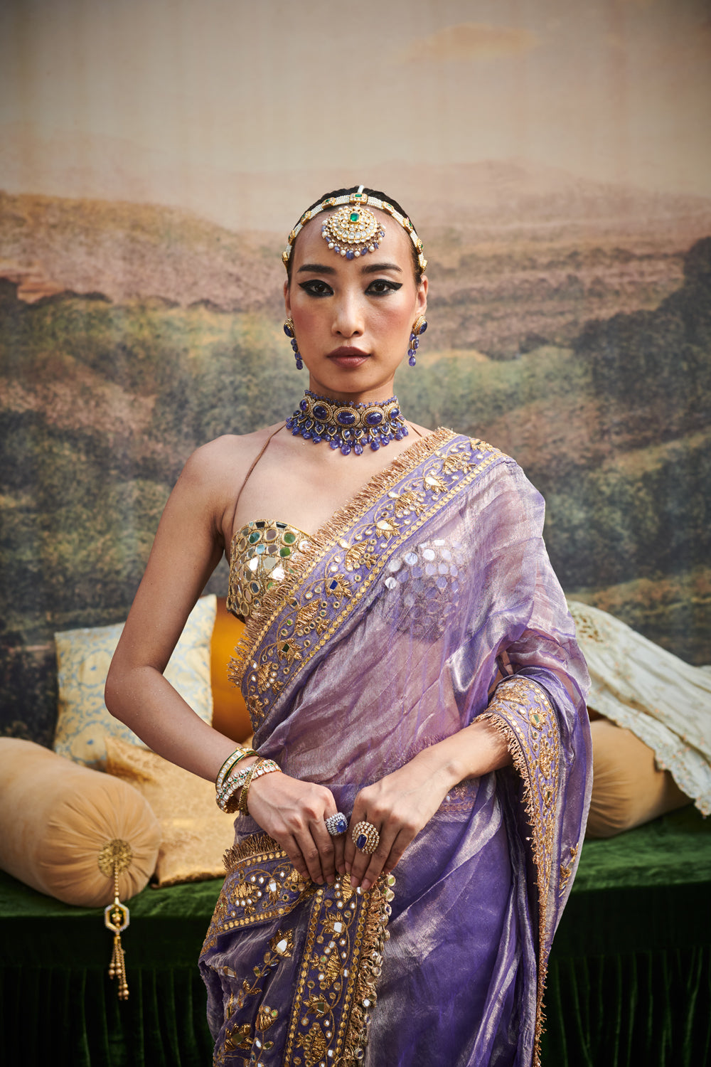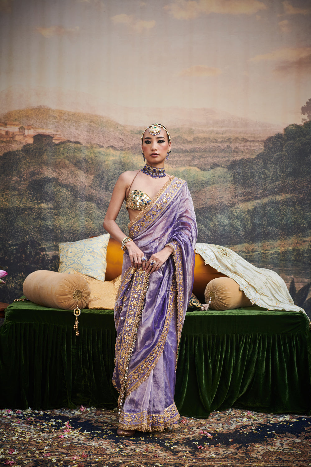 The saree features a delicate tissue fabric with ghumroo embellishmensts with intricate mirror work on chanderi silk blouse and details on border with gota patti and mirrors .