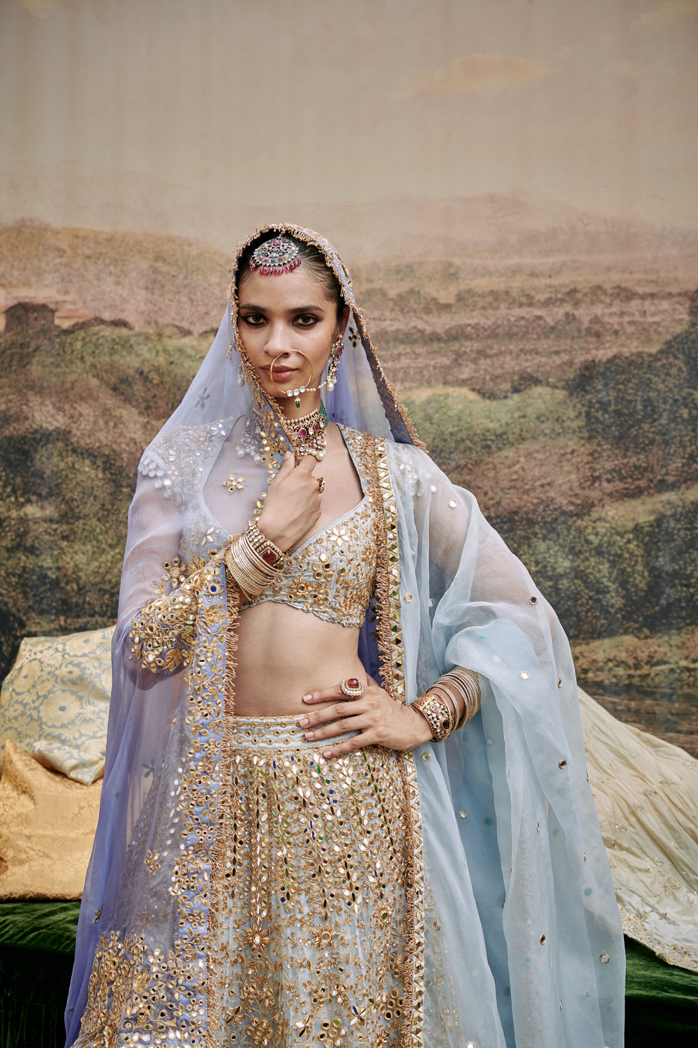 Powder blue organza lehenga with mirror work emroidery and gota detailed boder, paired with a organza blouse and dupatta , the blouse has mirror tassels attached to the cap sleeves in addition to dupatta the lehenga has a veil to complete the look.
