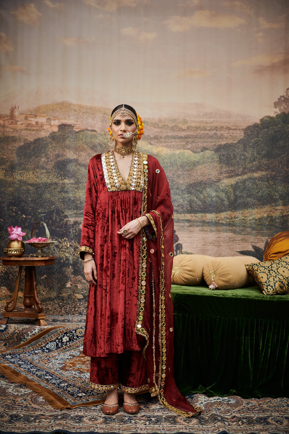 Red velevt kurta is adorned with mirror work neckline with a complementary bottom and organza dupatta with mirror work and hand-embellished ghungroos.