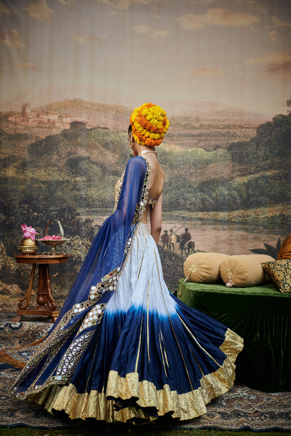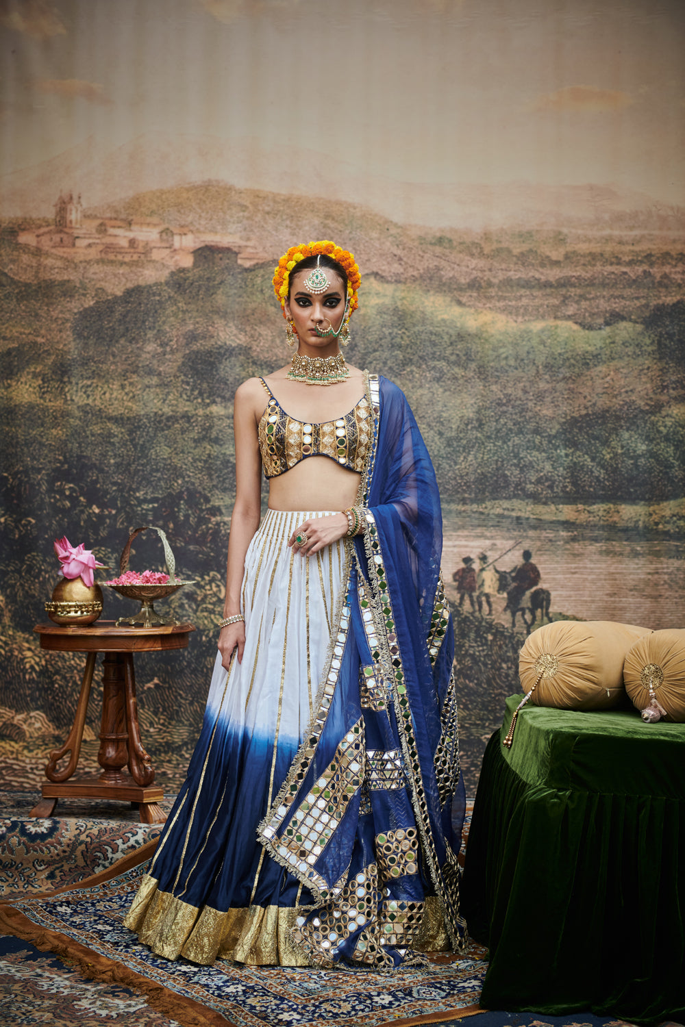 Ombre lehenga showcases a gradient effect, enhanced by a delicate gotta border and verticle gotta stripes,it is paired with a mirror work velvet blouses a soft organza dupatta with mirror work.