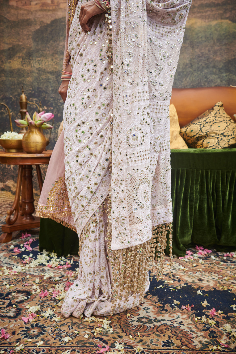 Pink lucknowi saree,adorned with intricate hand-embroidery and small mirror tassels attached to boder and palla is paired with a mirror work blouse.