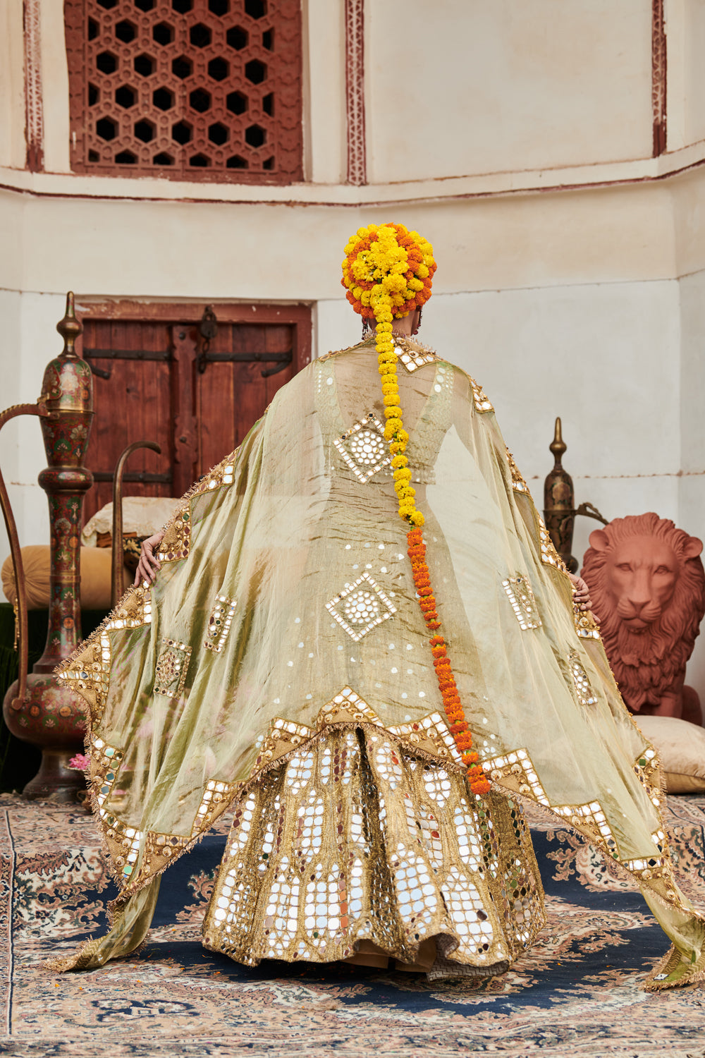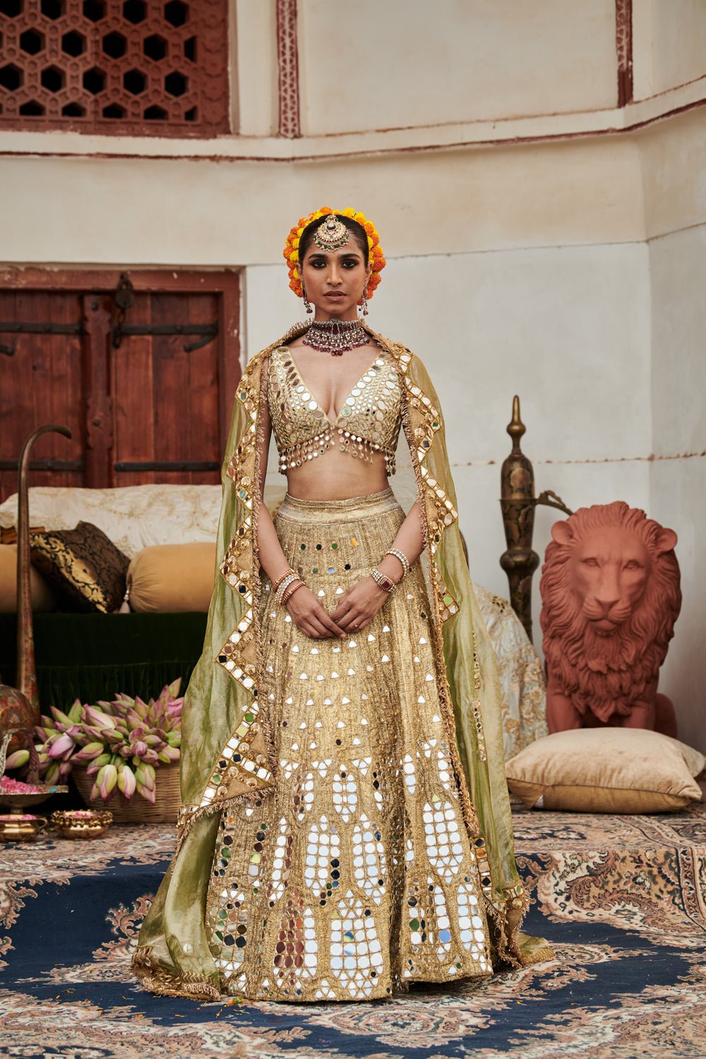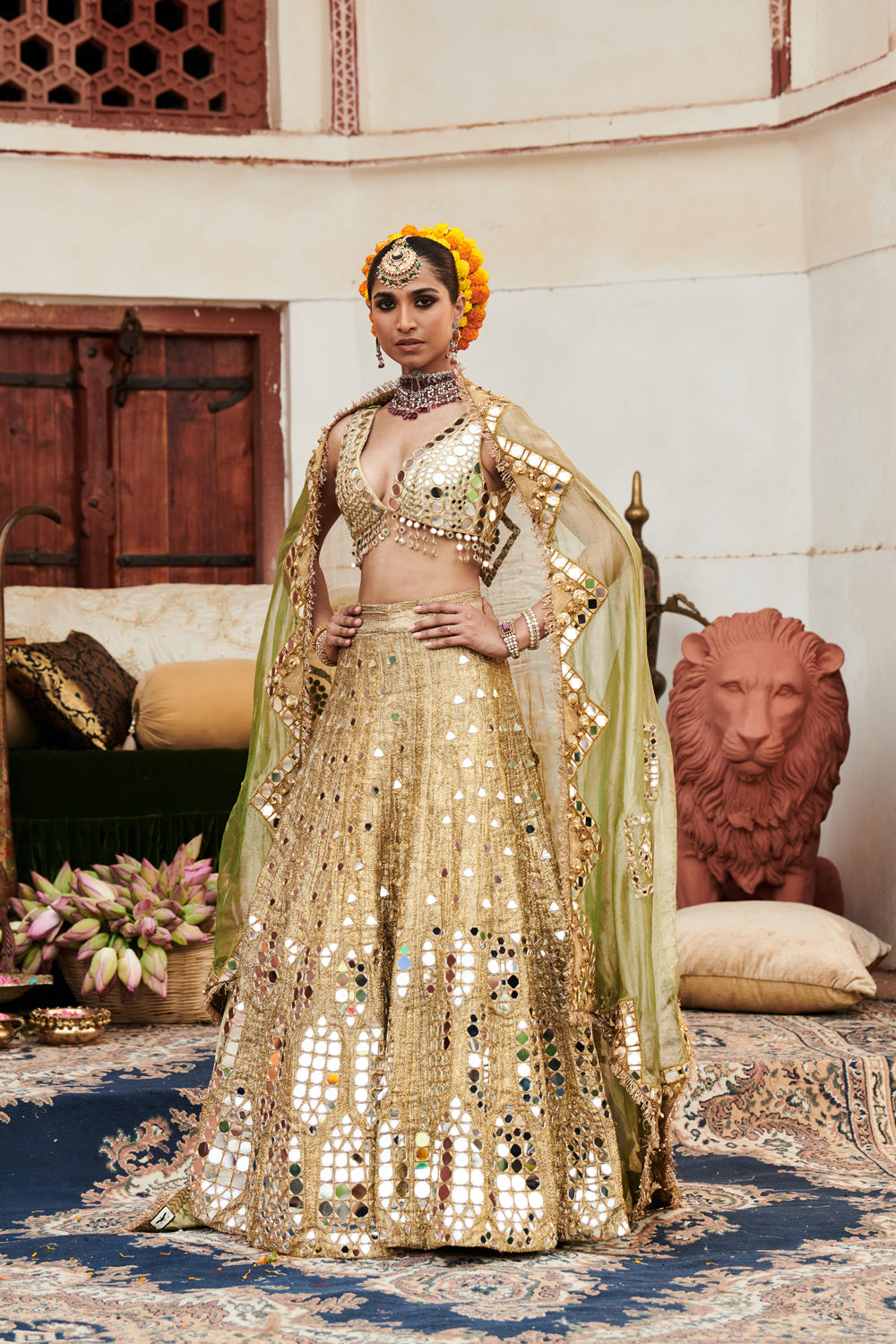 Golden chanderi lehenga adorned with intricately placed mirrors and matching blouse paired with a tissue dupatta with fine kiran.