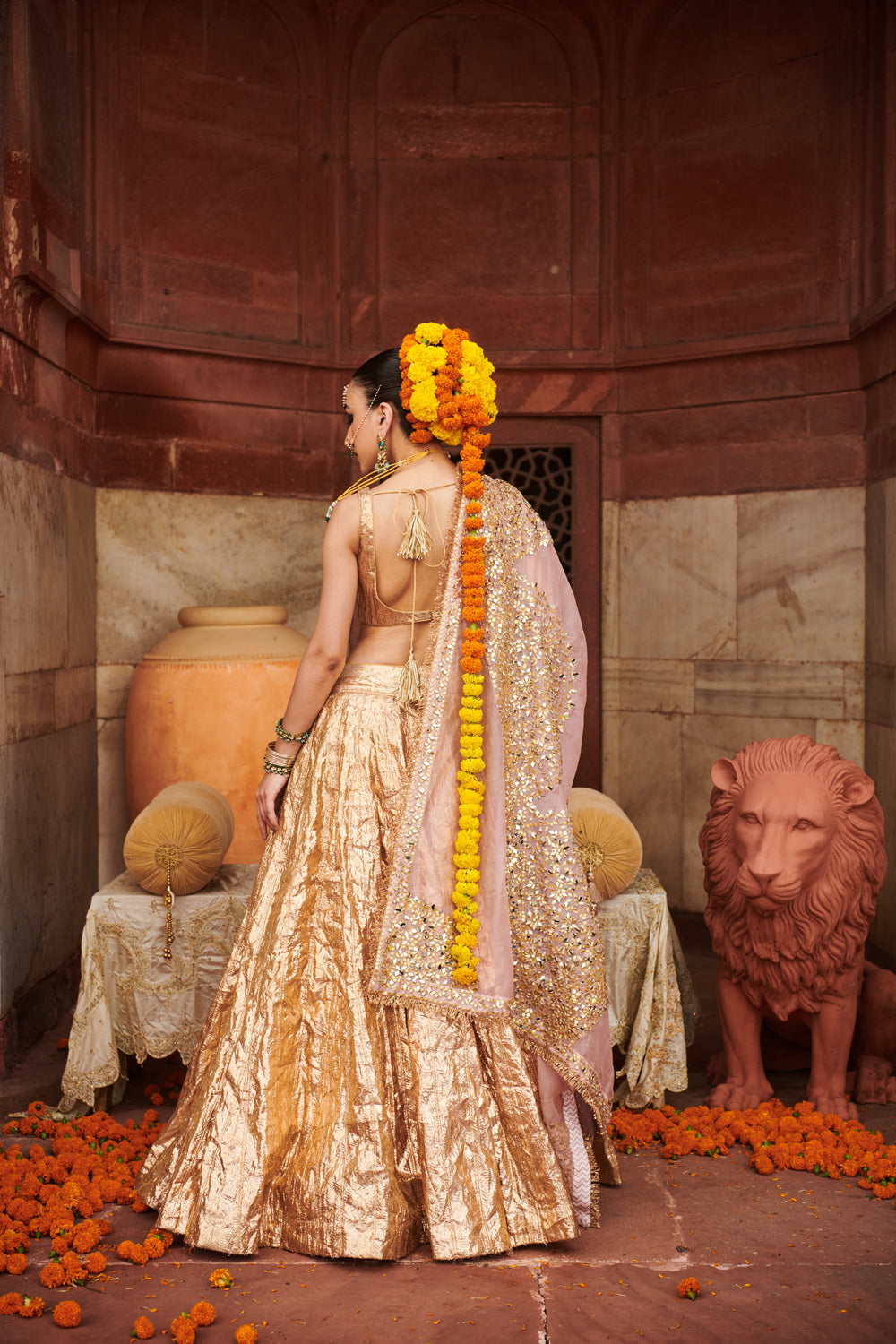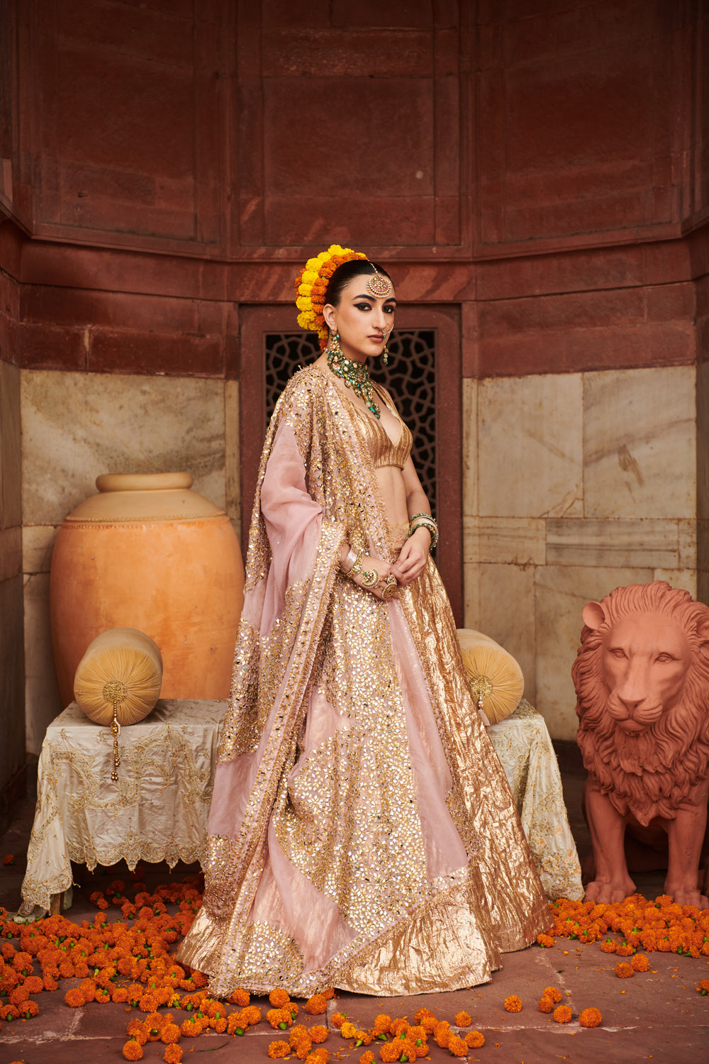 Full rose gold lampi lehenga paired with a sleevless blouse and highlighted with pink dupatta.