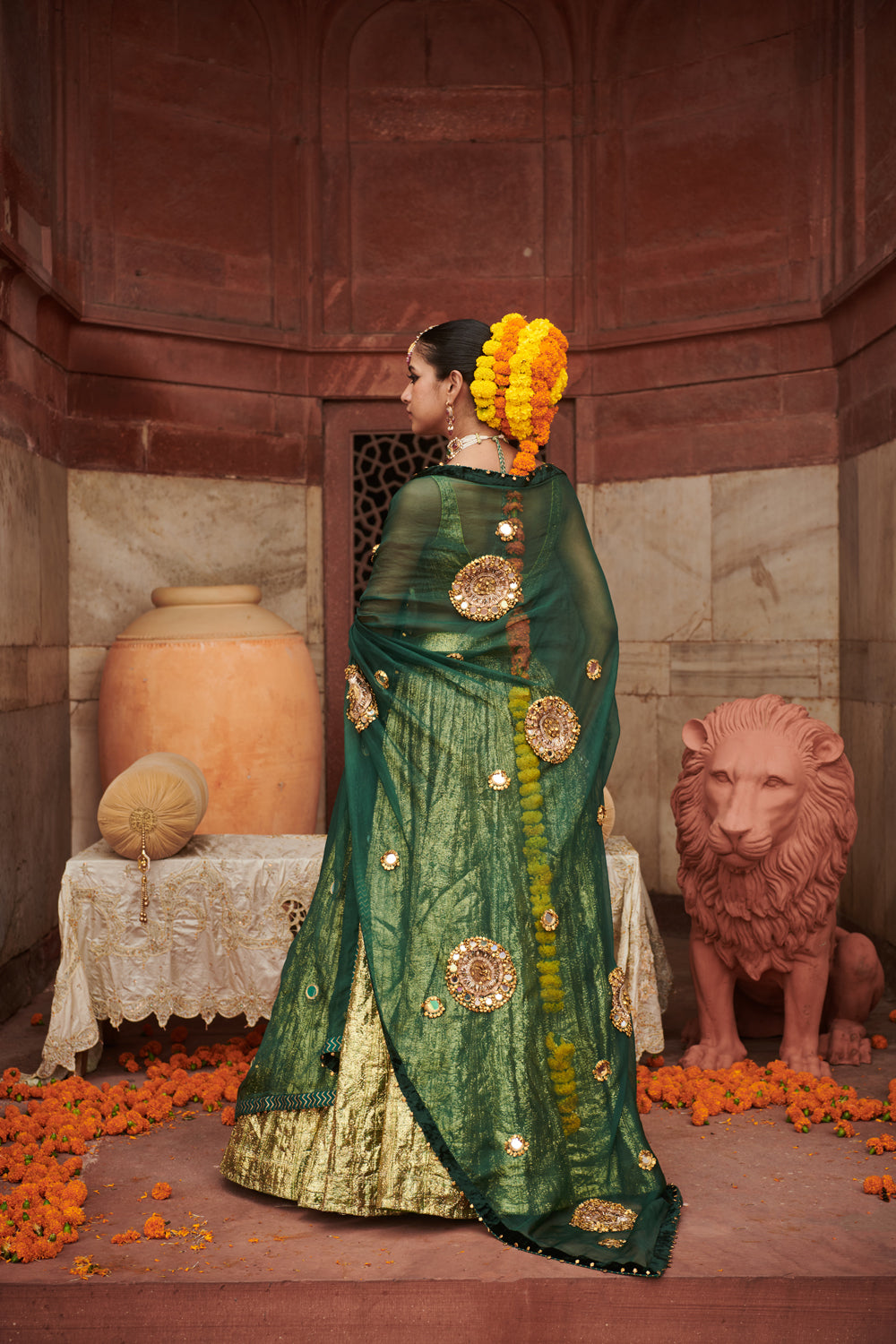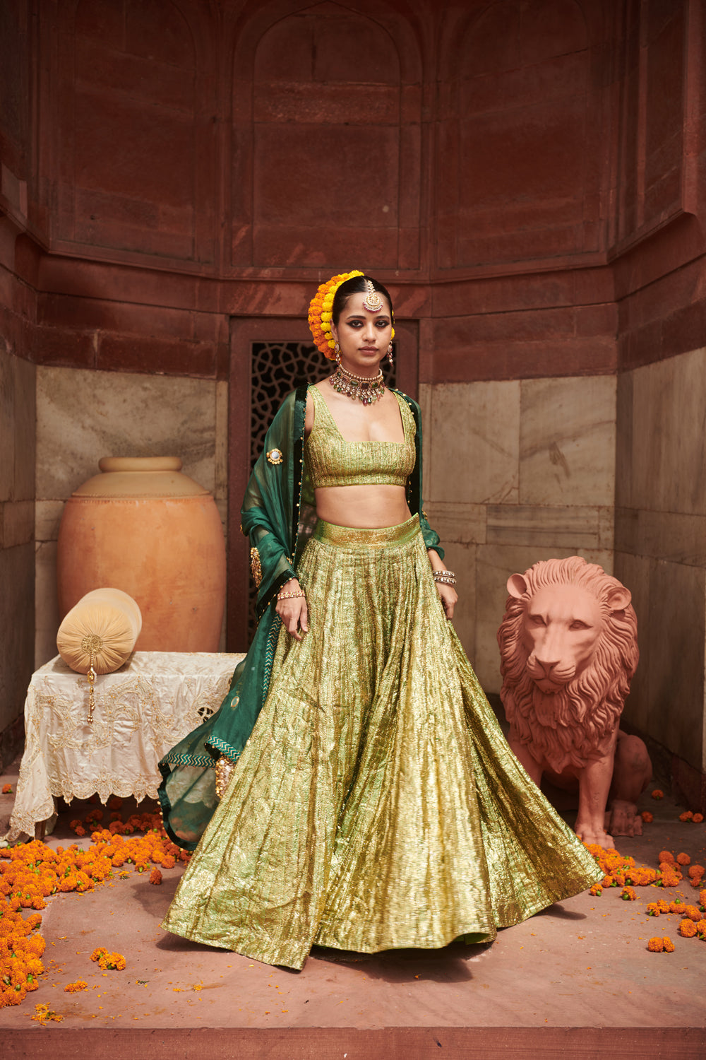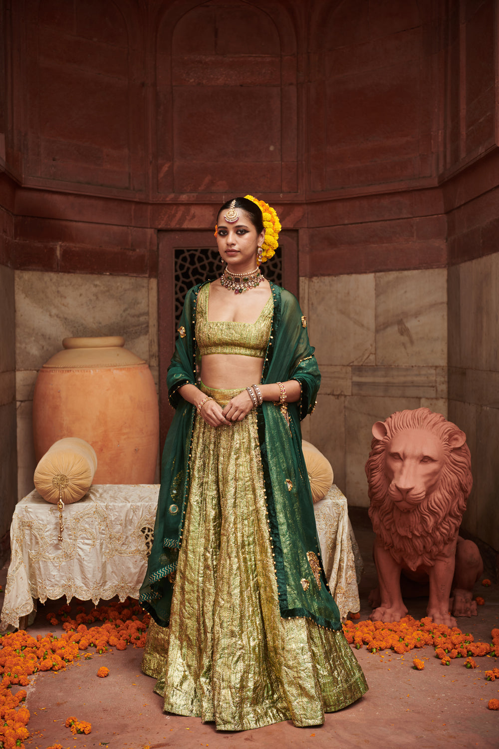 Full green lampi lehenga paired with a matching sqaure neck sleevless blouse and highlighted with dark green dupatta.