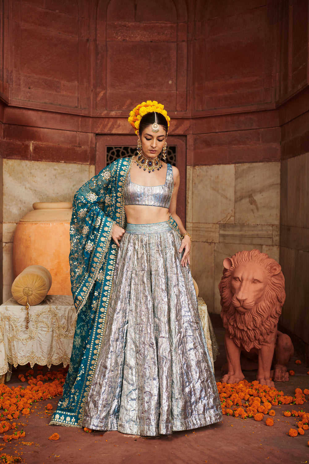 Full powder blue lampi lehenga paired with a matching saqure neck blouse and highlighted with orgnza dupatta with fine kiran.