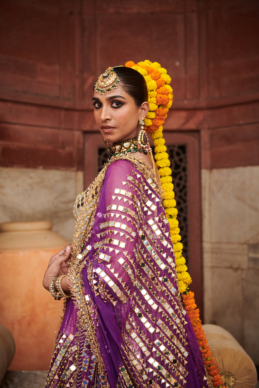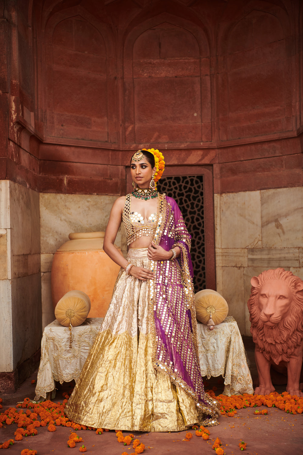 The skirt features a unique design split into two contrasting halves, silver and gold. paired with a mirror work sleeveles blouse and pop of colour is added with a purple organza dupatta.