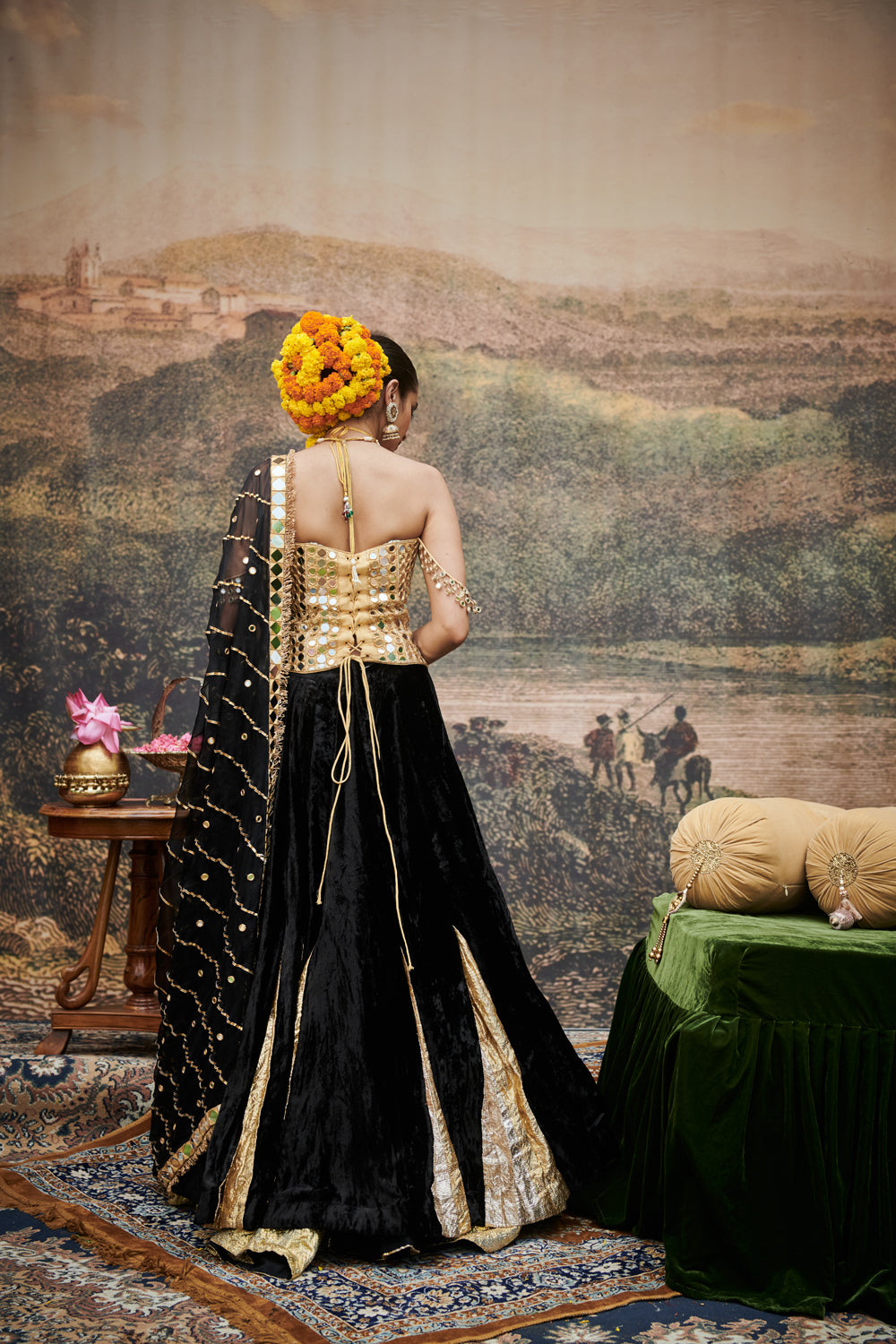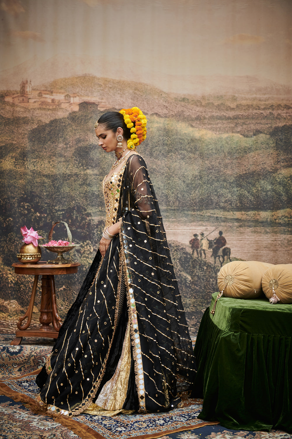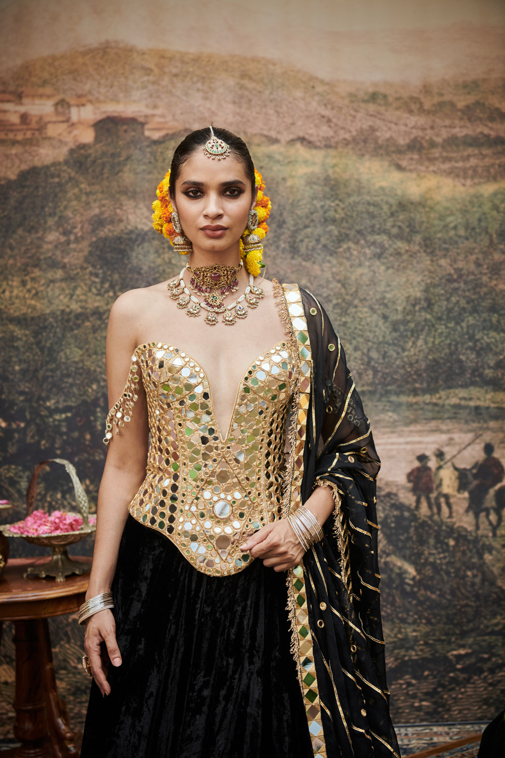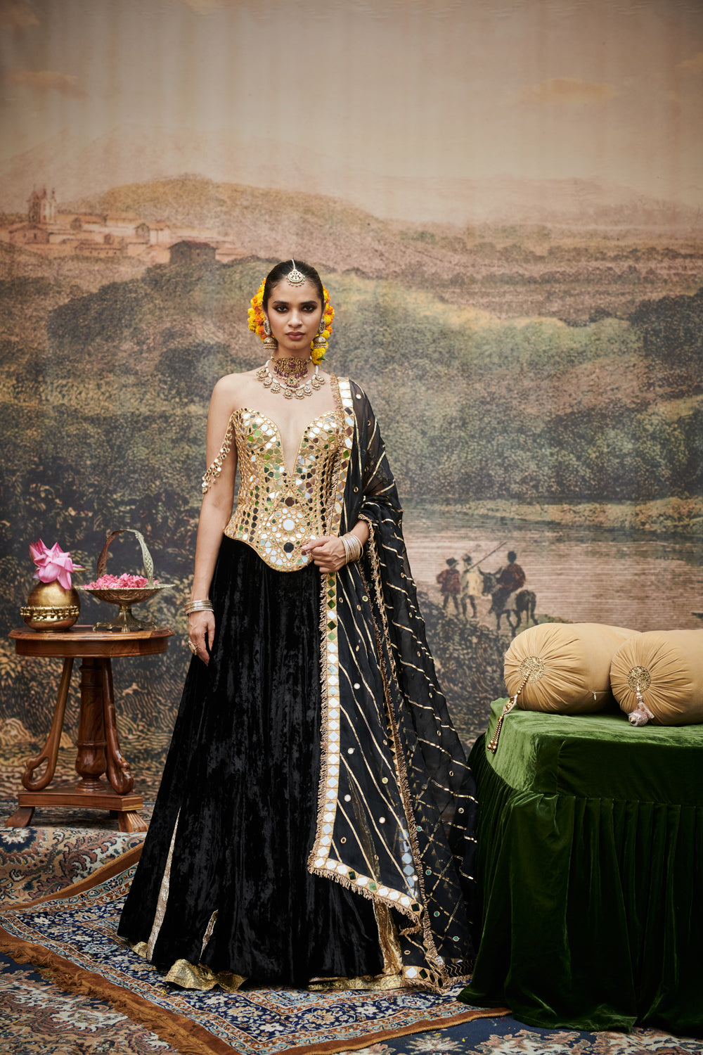 Black linen lehenga is featuring a sprinkling on all over and gota stripes on lehenga and dupatta, styled with a intricate mirror work corset.