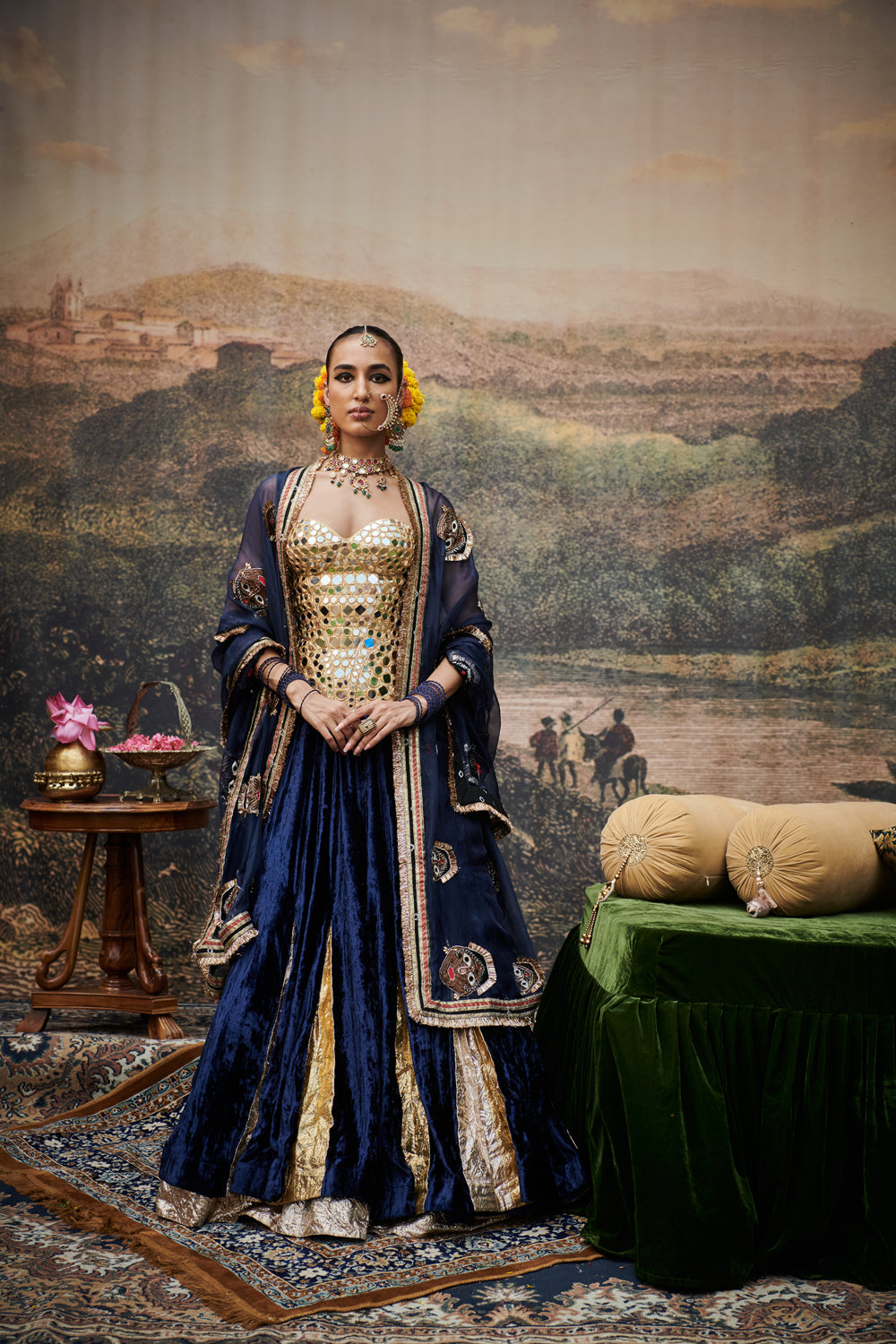 This velvet lehenga with alternating lampi kalis the styled with the mirror work corset and a matching blue dupatta emroideired with big face motifs on it.