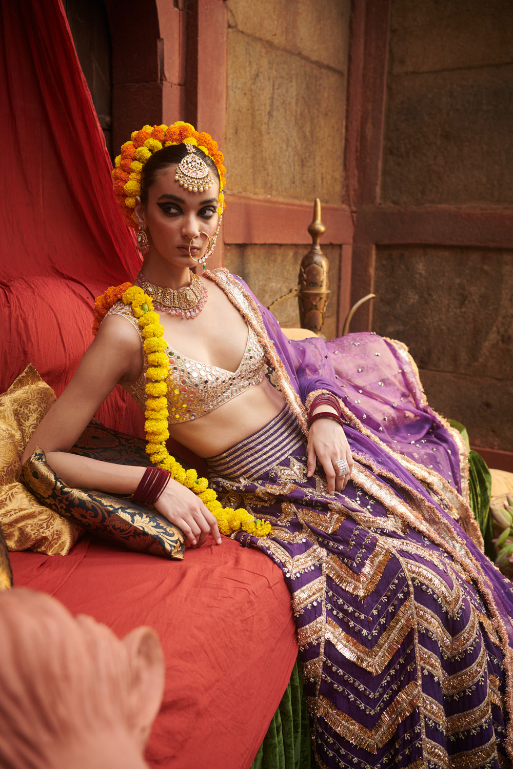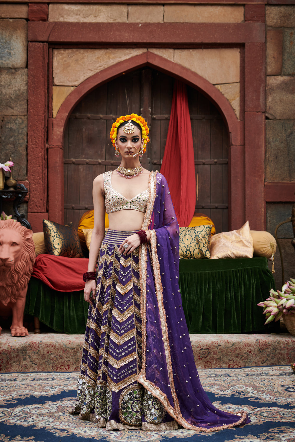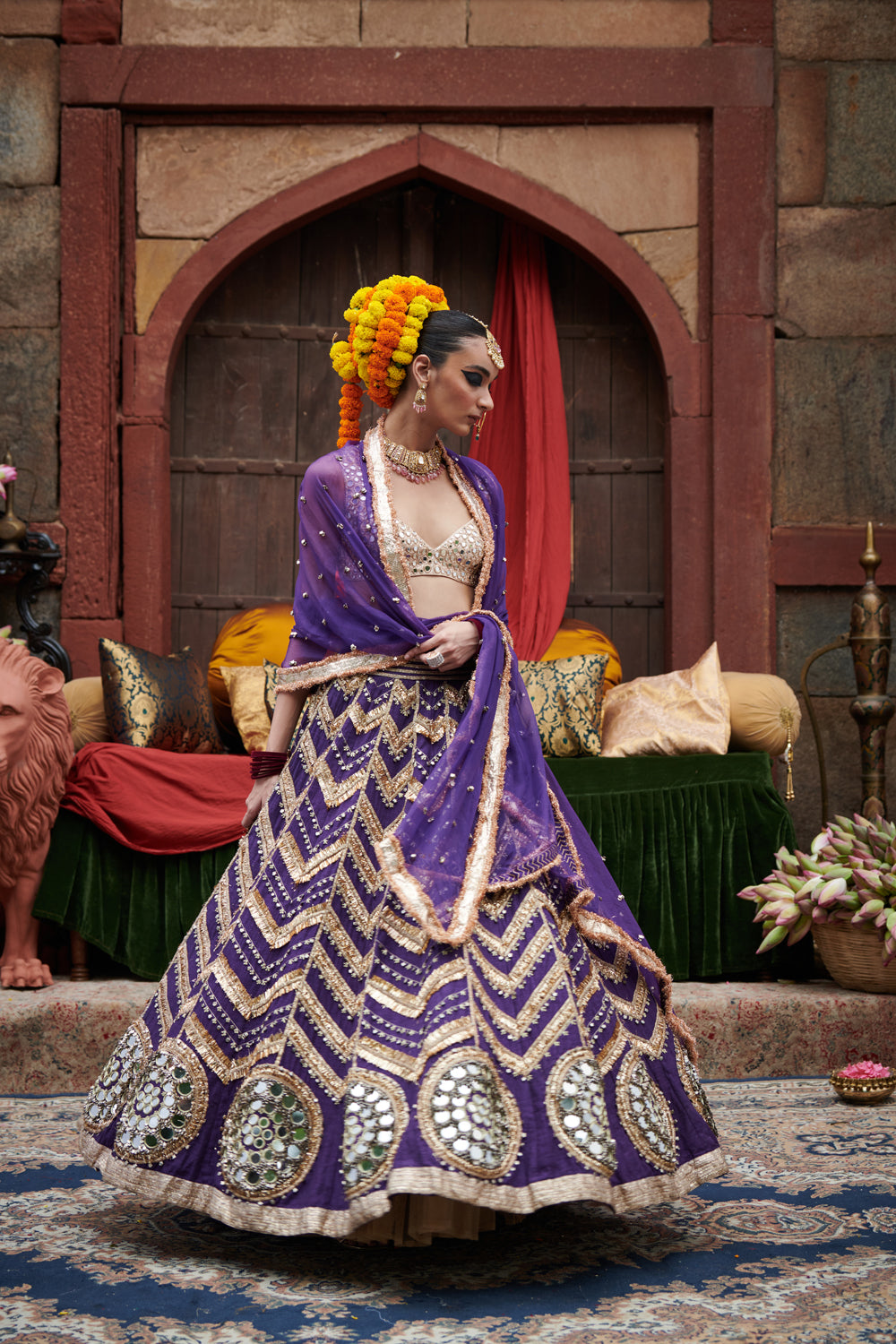 Purple linen lehenga features a chic chevron print is paired with mirror work blouse and matching organza dupatta with gota boder.