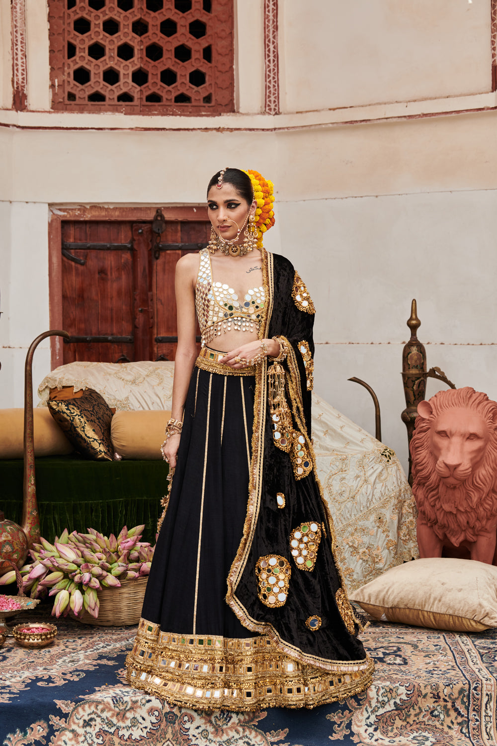 Black linen lehenga , featuring a sprinkling all over and gota stripes and mirror work on boder of lehenga and velvet dupatta, the lehenga is styled with a intricate mirror work blouse.