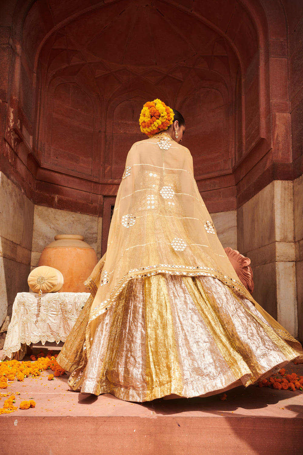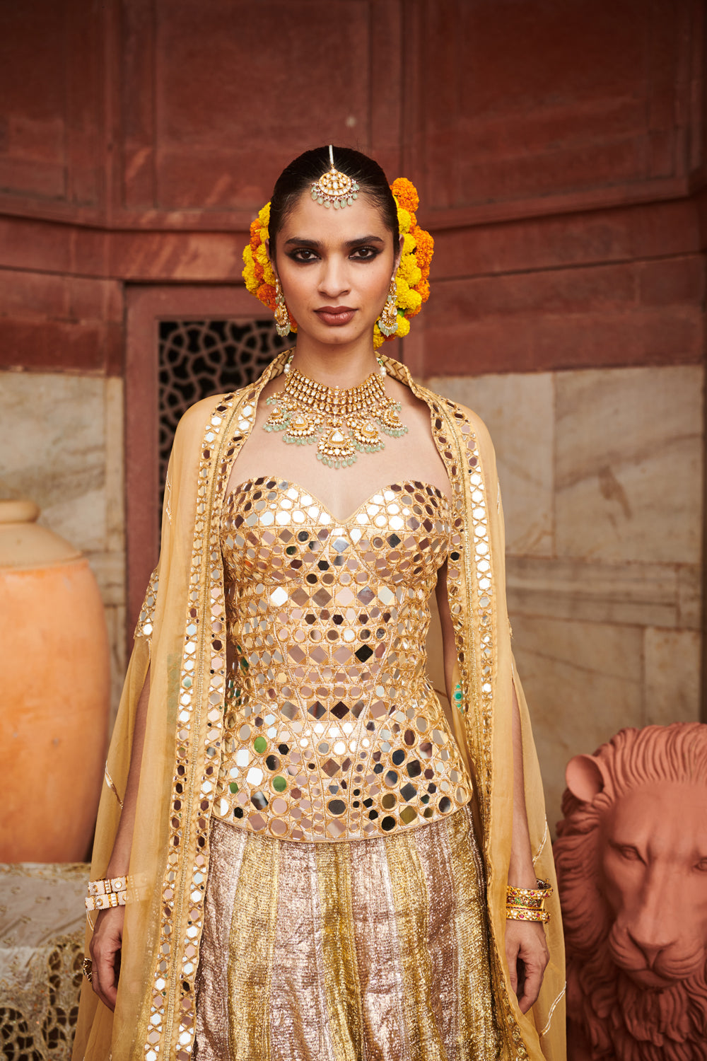 Silver and gold lehenga with alternate lampi kali all over, paired with a intricate mirror work corset, and a dupatta with mirror boder.