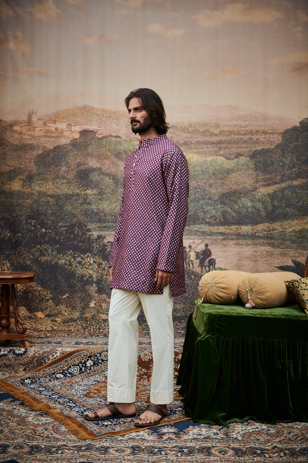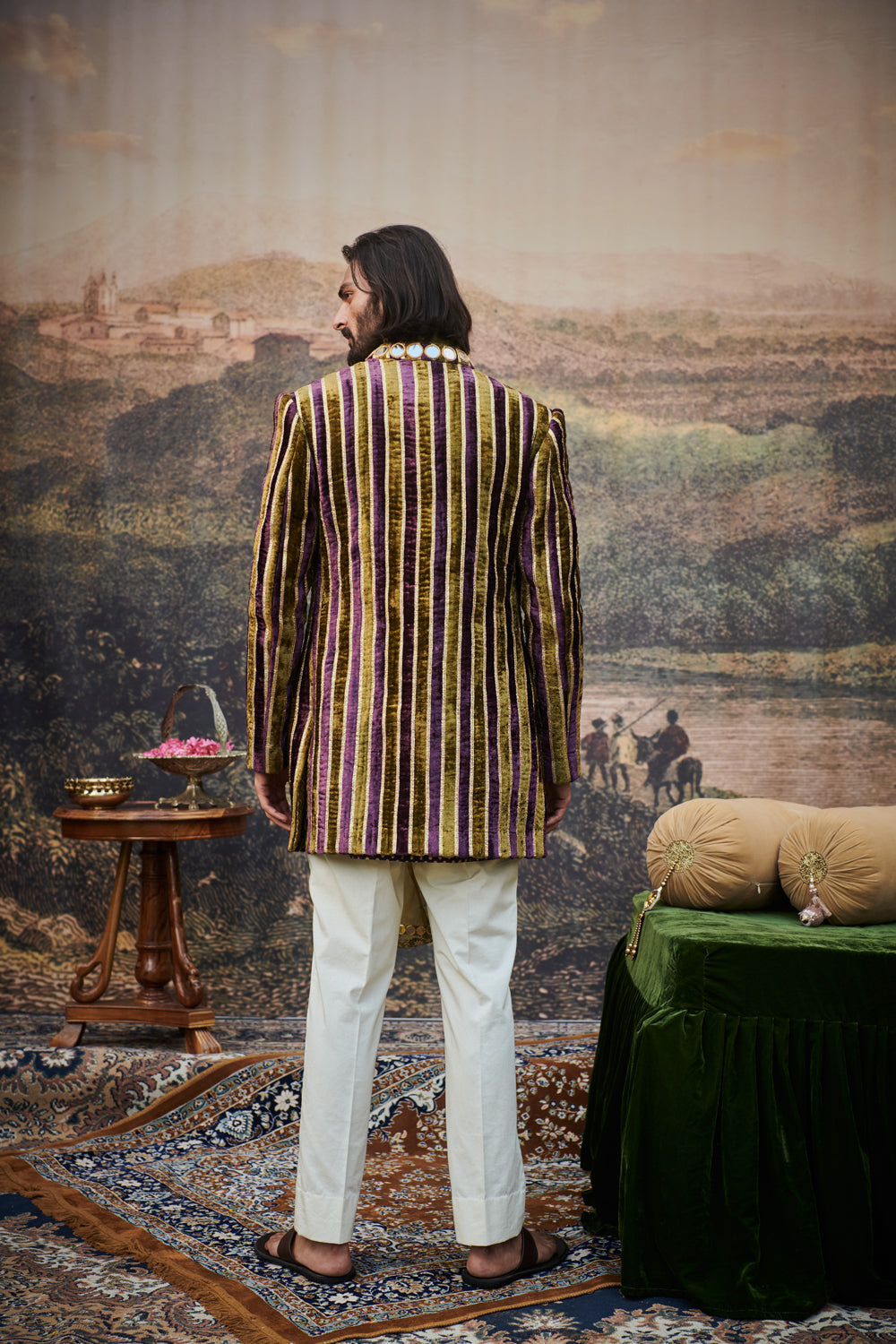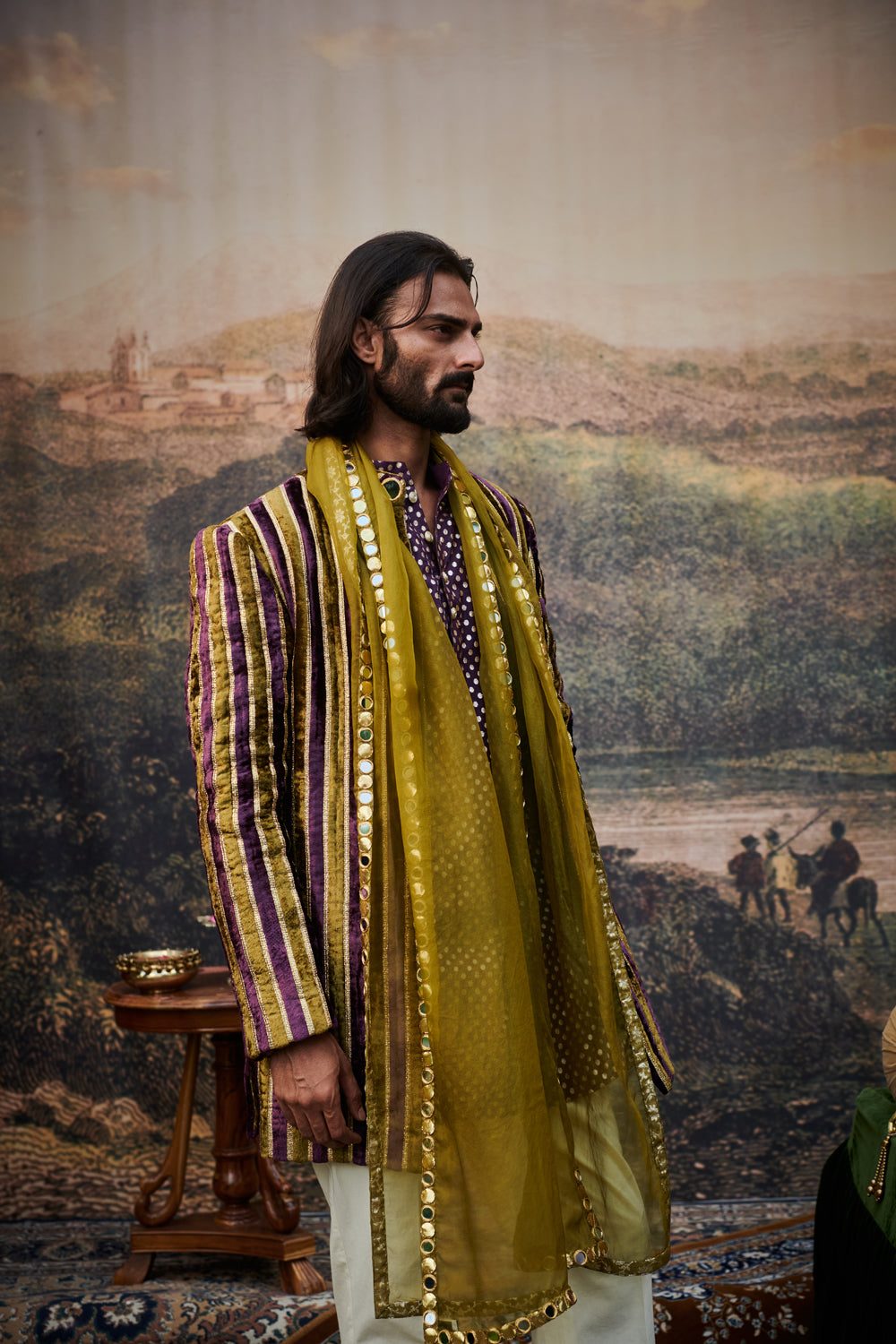 Olive jacket with gotta stripes with puple chanderi kurta and white pants and stole.