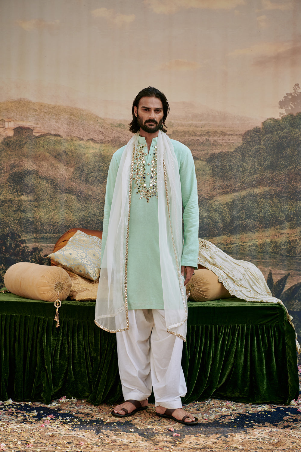 Blue linen kurta with mirror yoke , paired with a cotton pants and stole