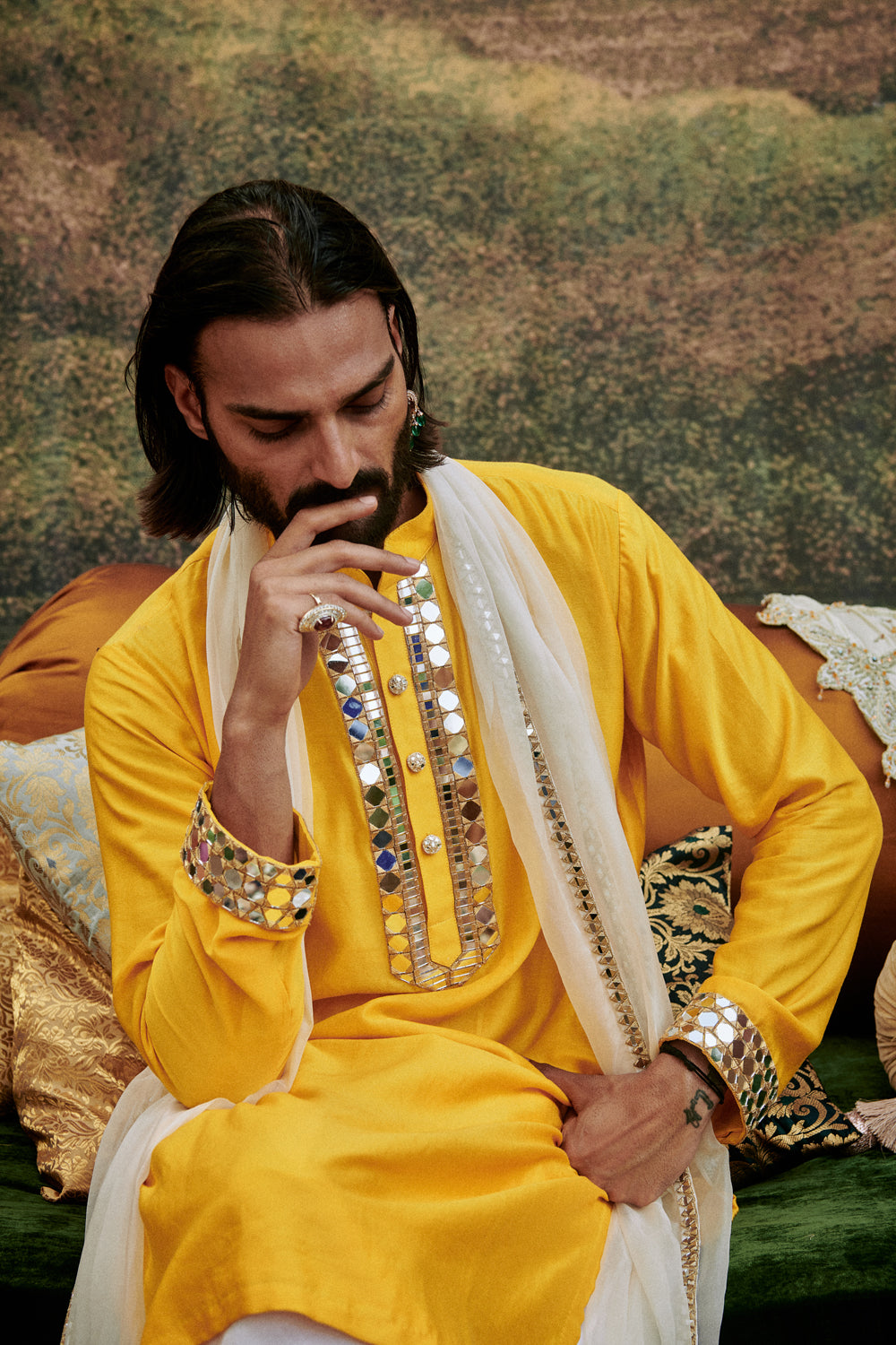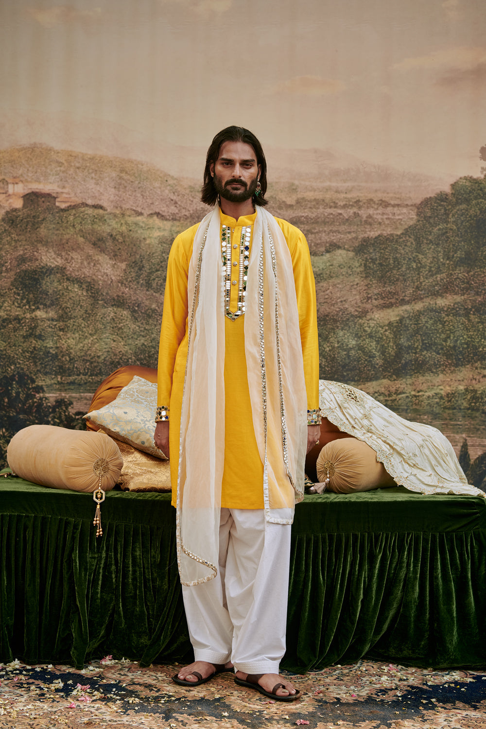 Yellow chanderi kurta with mirror work yoke paired with a cotton pants and organza white stole.
