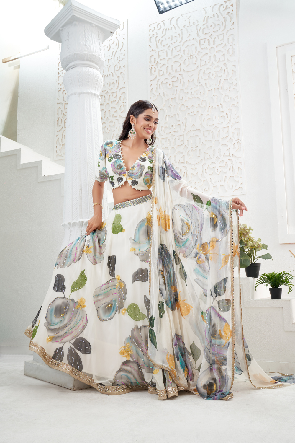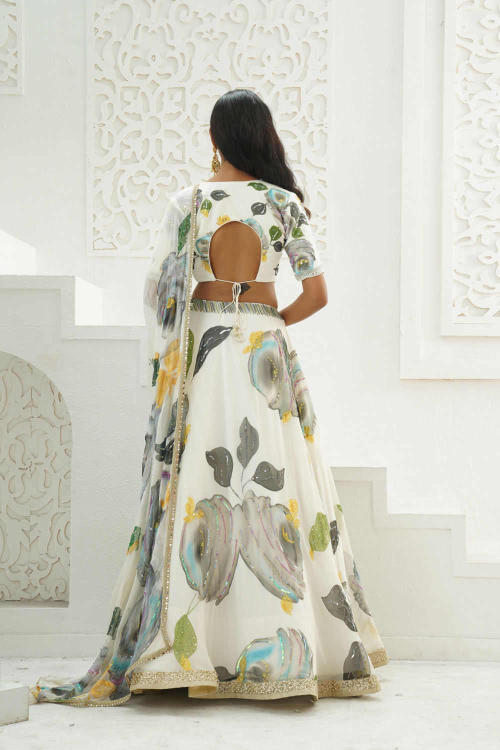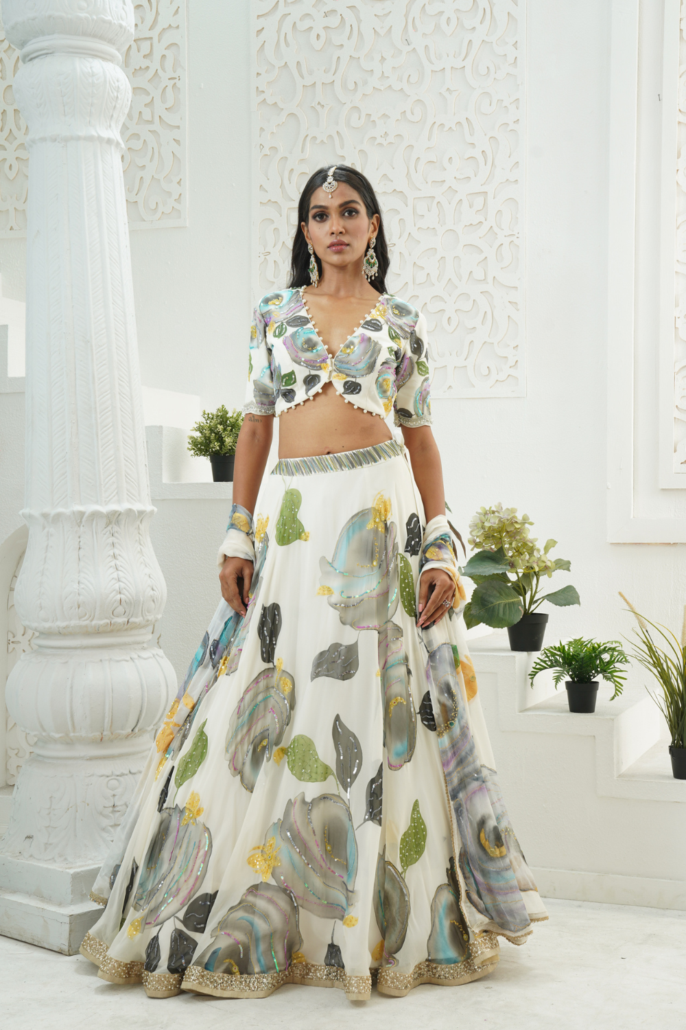 Ivory georgette hand painted and hand embroidered lehenga with Ivory hand embroidered blouse and dupatta set.