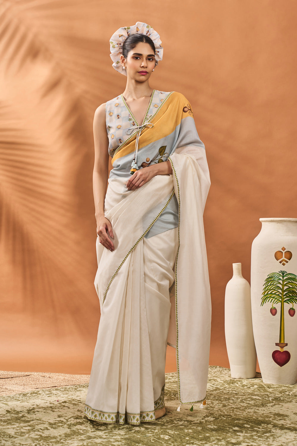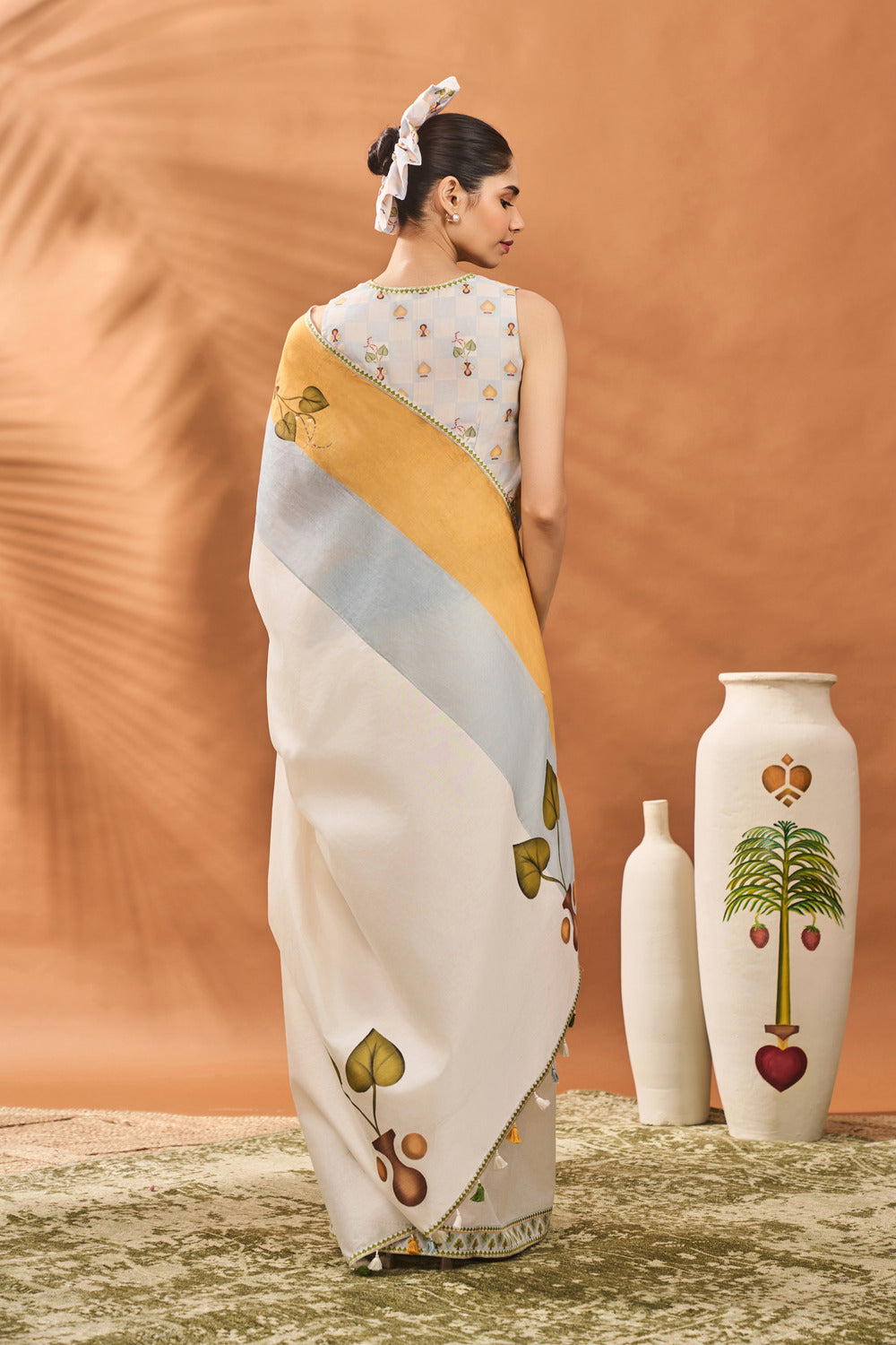 SAREE - Beautiful printed saree with yellow and blue stripes print at the palla | Pleats and palla adorned with printed borders | Palla is embellished with applique emboidery placement | Adorned with beautiful tassles