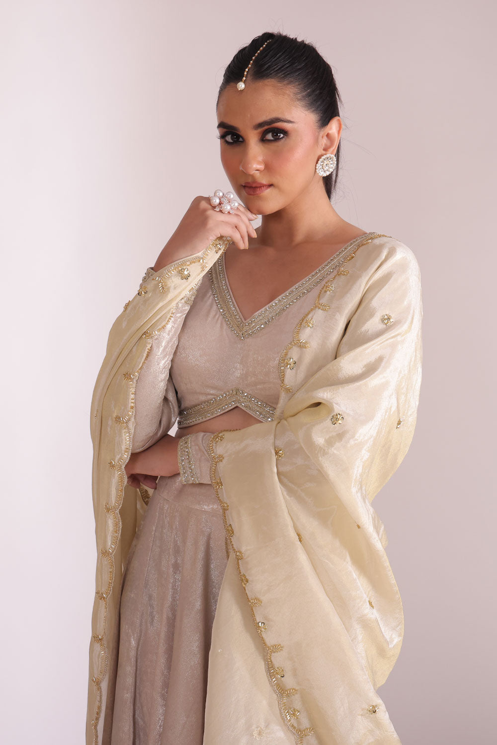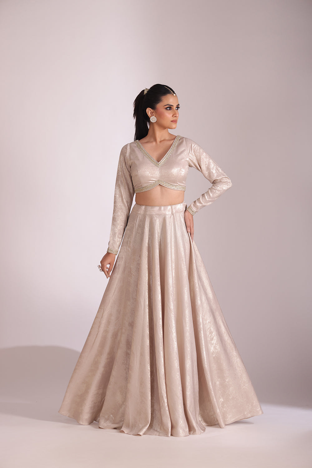 This set includes a Metallic Rose Gold Blouse, Full-Flare Lehenga, and Embroidered Tissue Dupatta.