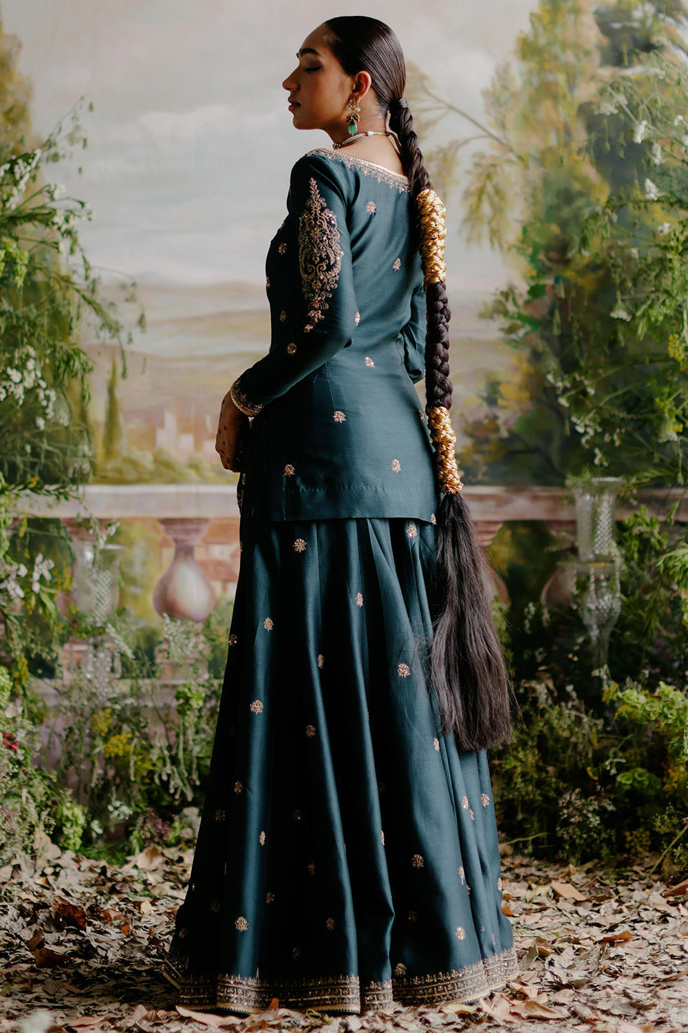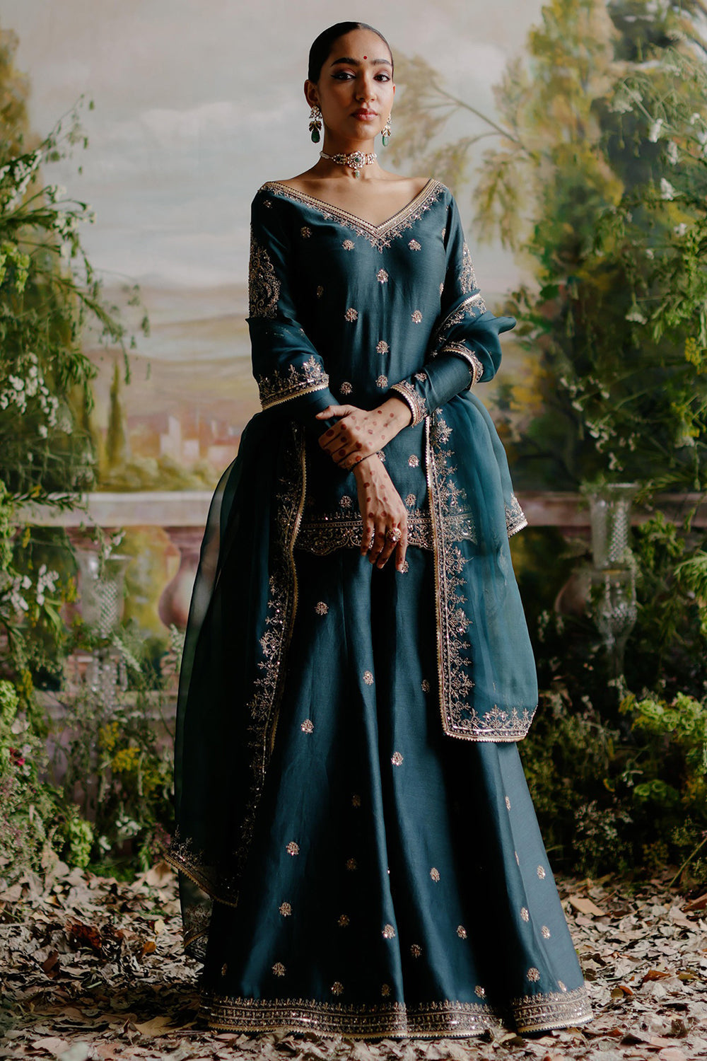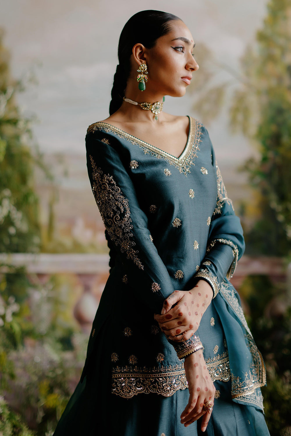 Featuring a dark green chanderi kurta sharara set paired with organza base dupatta with antique gold dori and aari embroidery.