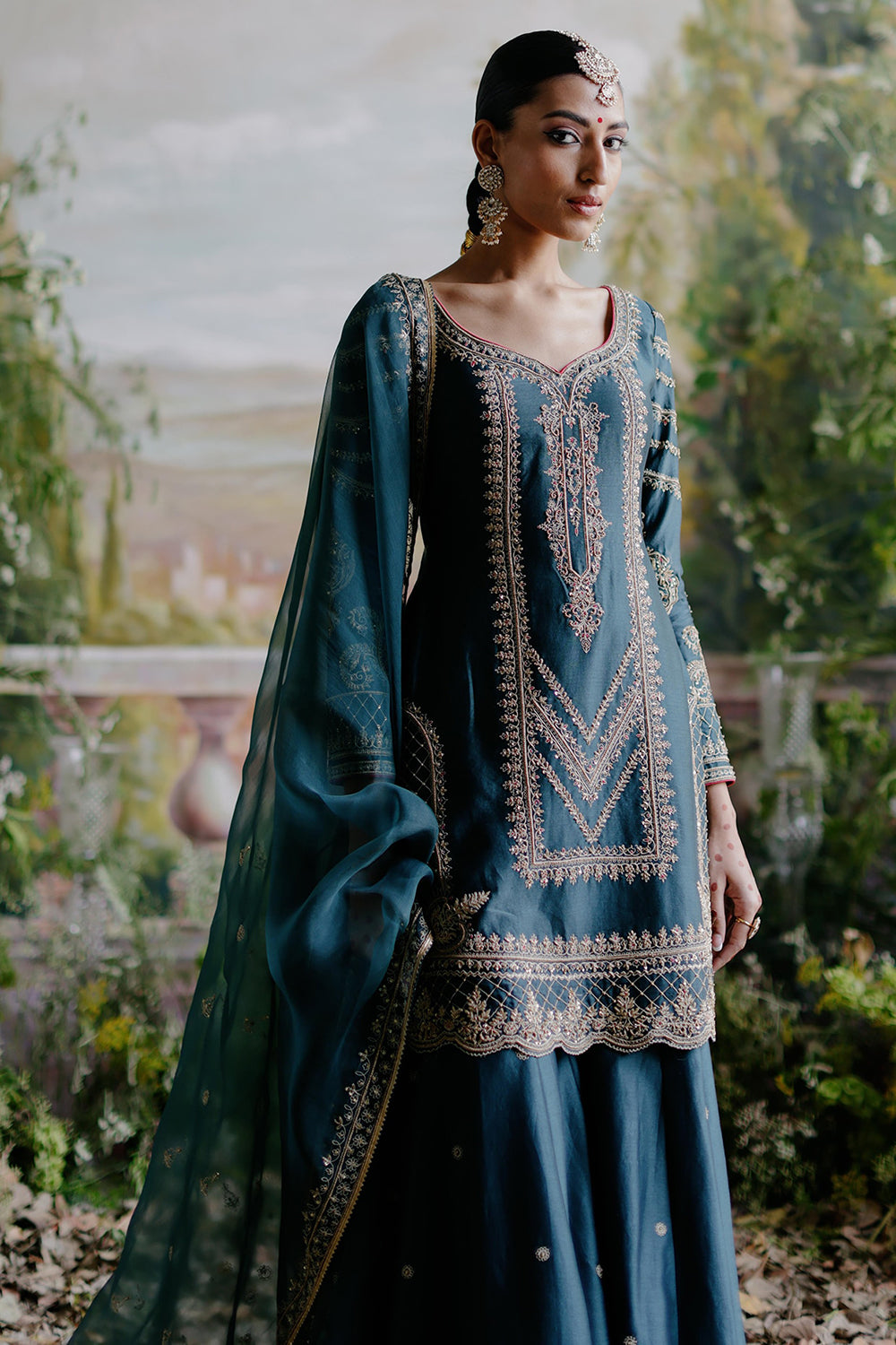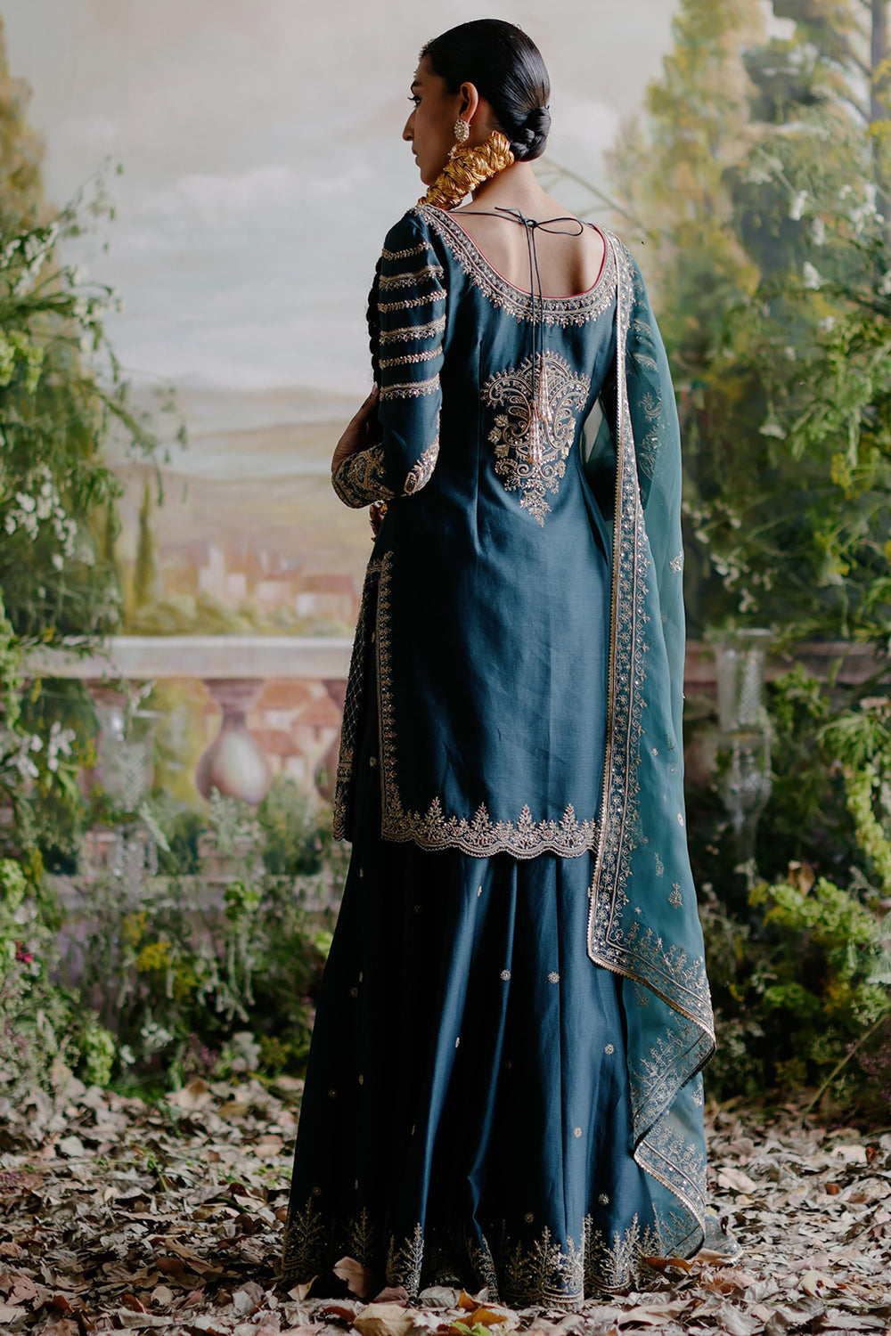 Featuring a dark green chanderi kurta sharara set paired with organza base dupatta with antique gold dori and aari embroidery.