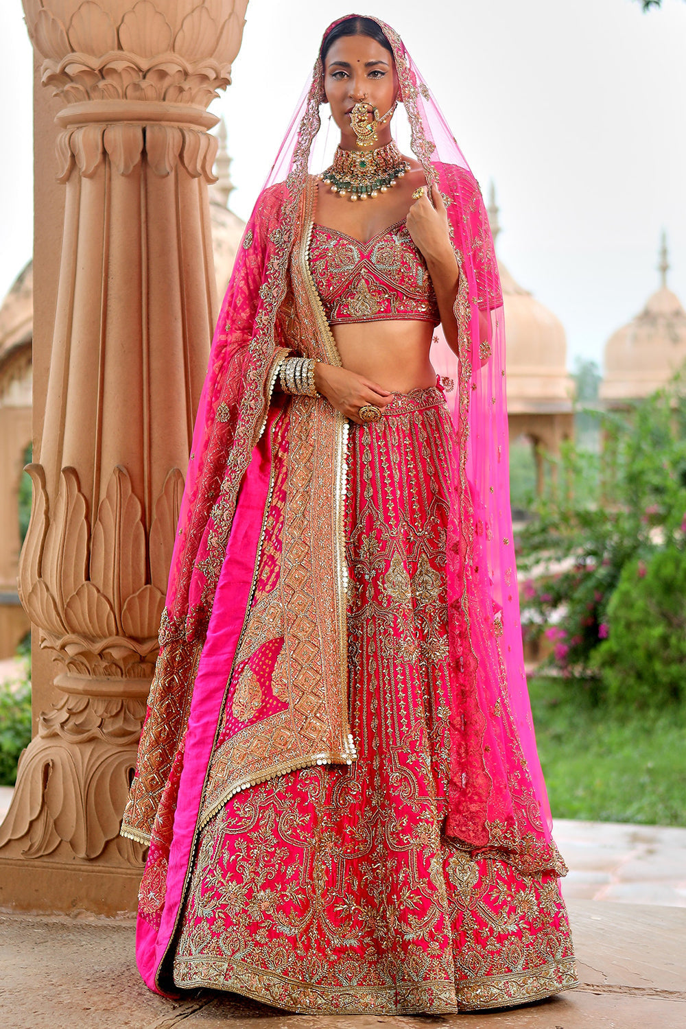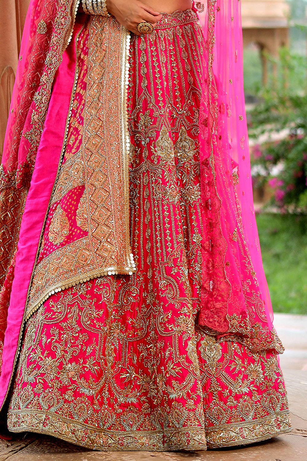 Featuring a cherry pink raw silk bridal lehenga set paired with butterfly net base dupatta and banarsi dupatta with rose gold zardosi & aari embroidery on it.