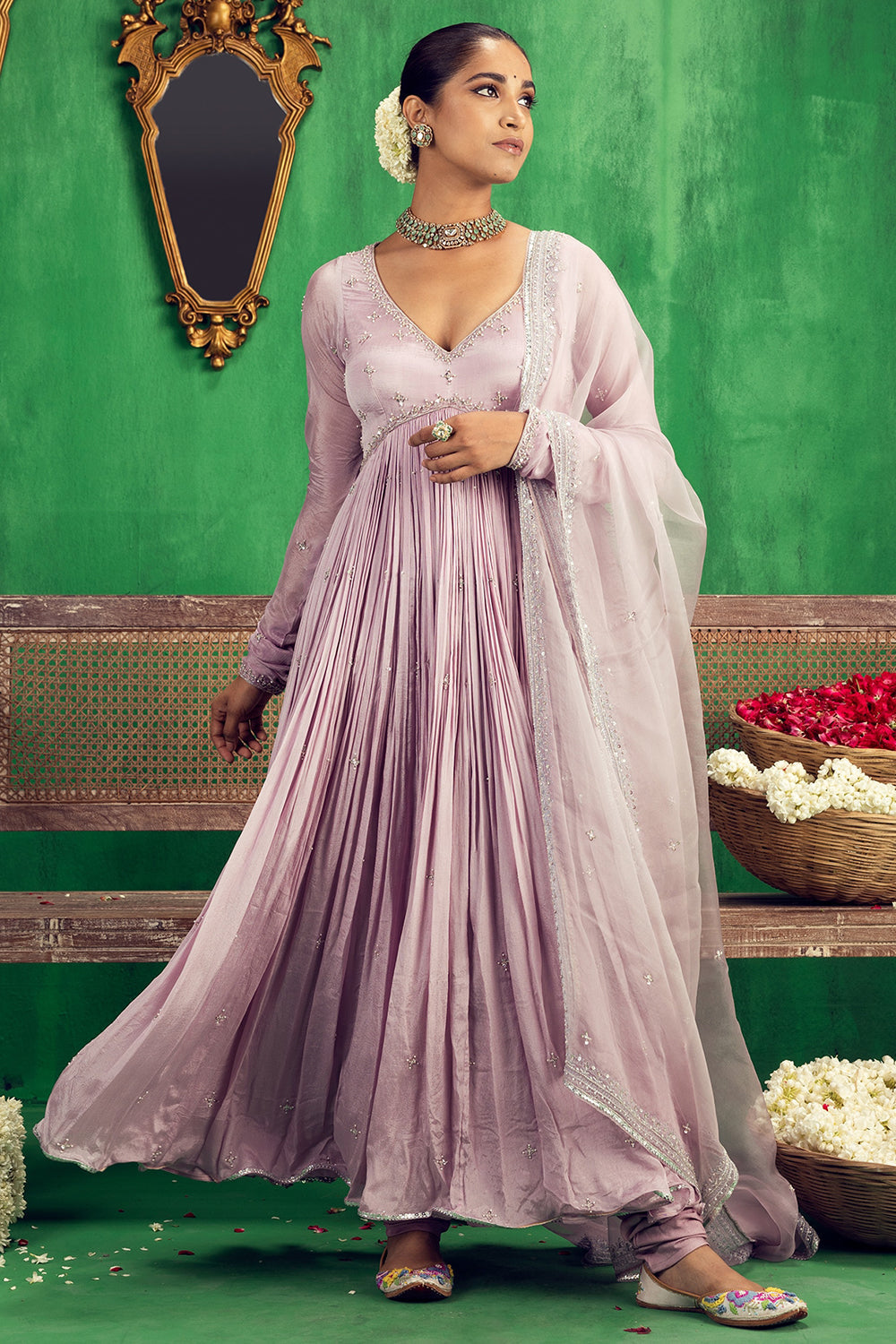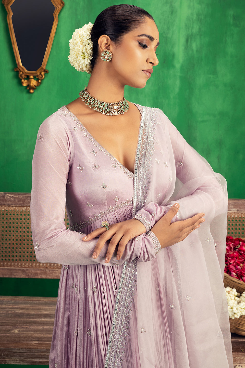 Featuring a lavender chiffon anarkali paired with cotton silk churidar and organza base dupatta with tone on tone and aari embroidery .