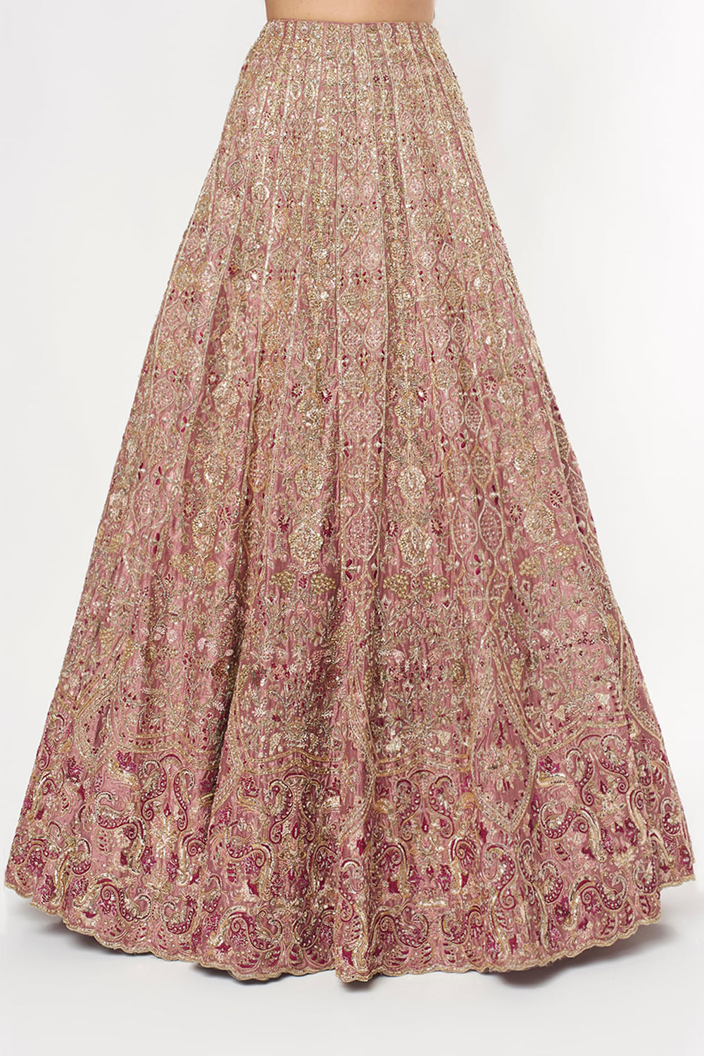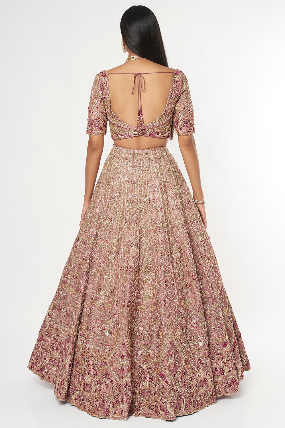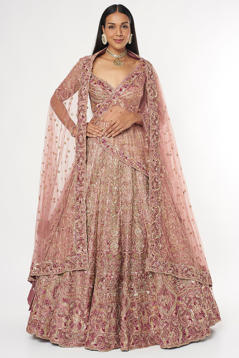 Featuring a aurora pink raw silk bridal lehenga set paired with butterfly net base dupatta with pink wine thread, rose gold zardosi and aari embroidery on it.