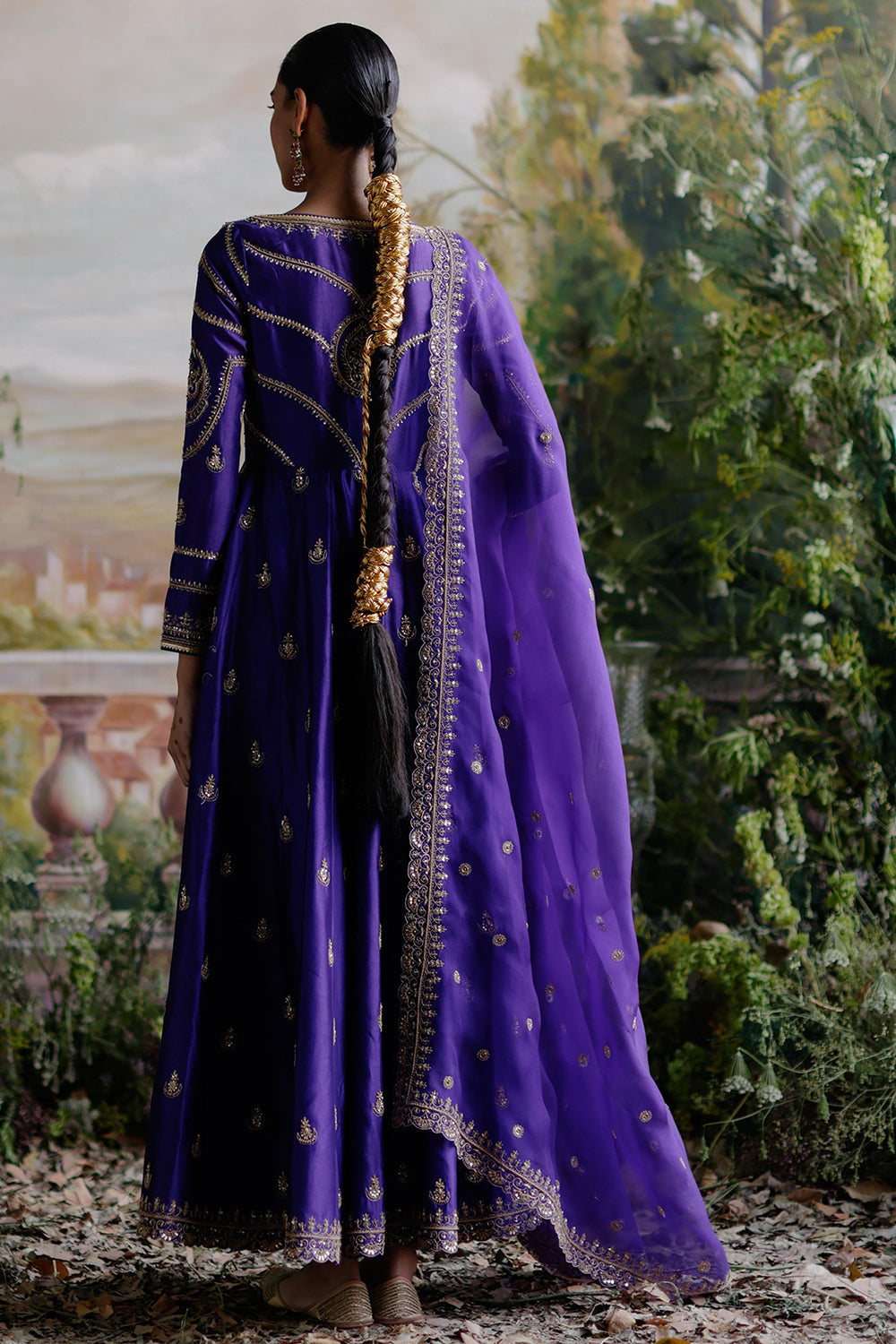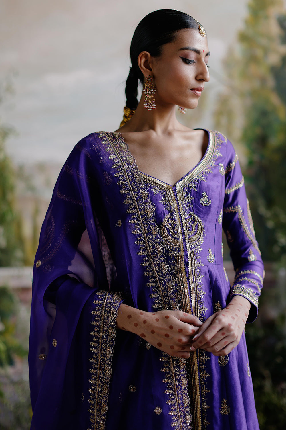 Featuring a purple chanderi jacket set paired with organza base dupatta with antique gold dori and aari embroidery.