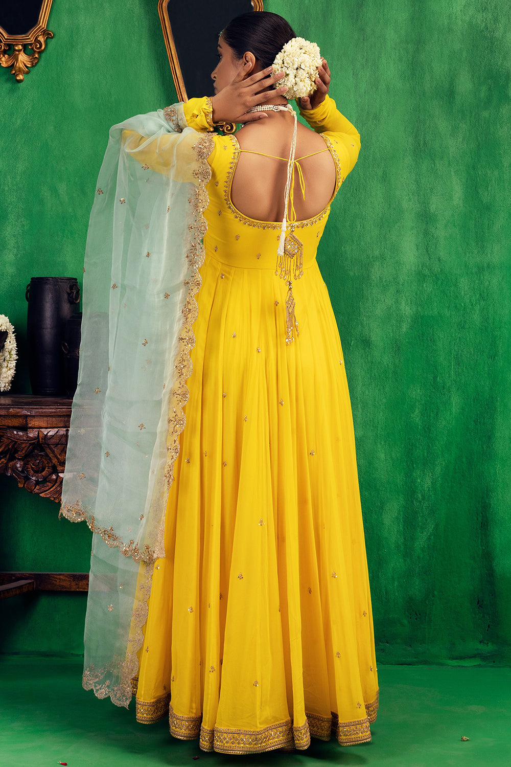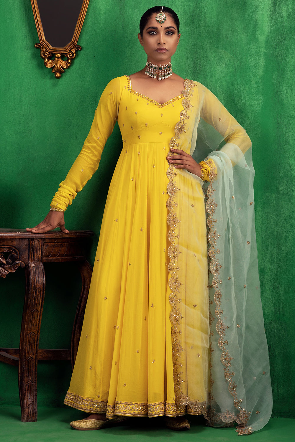 Featuring a yellow georgette anarkali paired with cotton silk churidar and aqua organza base dupatta with gold zari and aari embroidery .