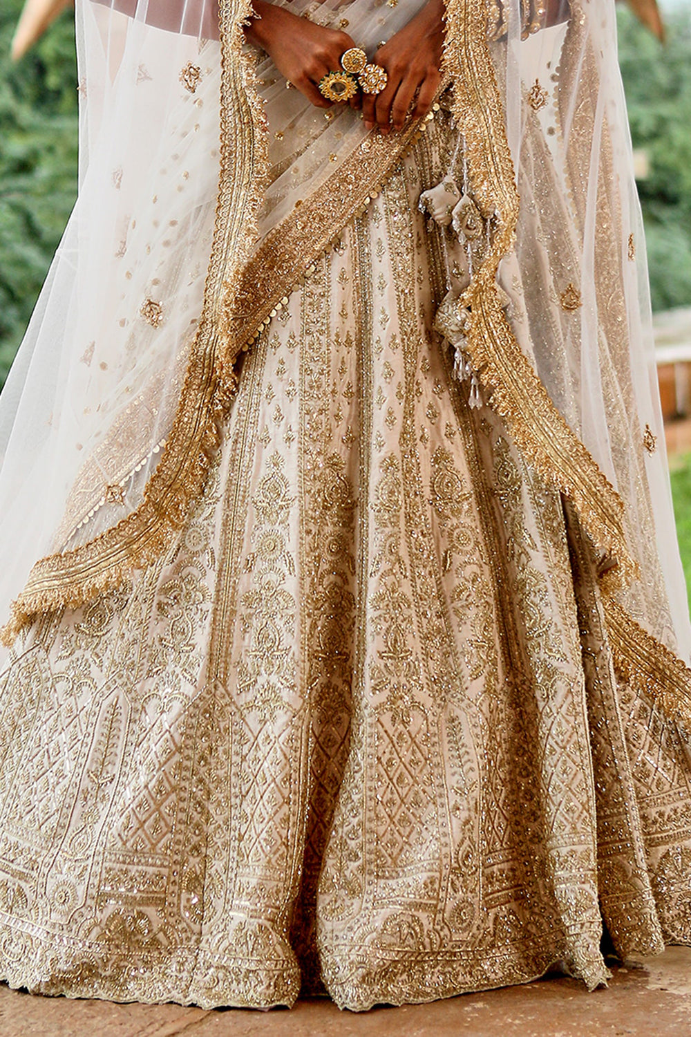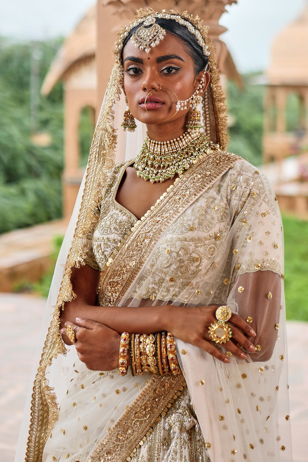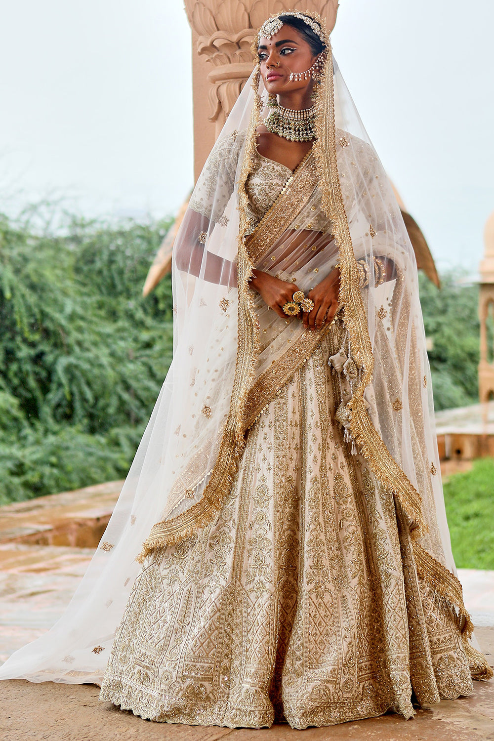 Featuring an off white raw silk bridal lehenga set paired with 2 butterfly net base dupatta with gold zardosi & aari embroidery on it.