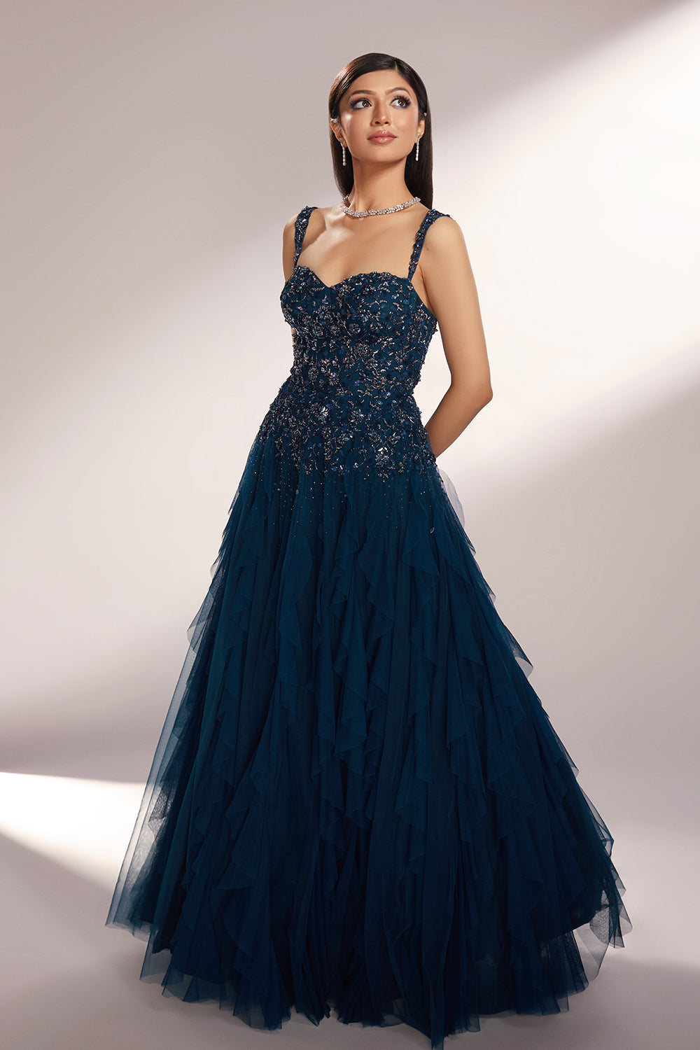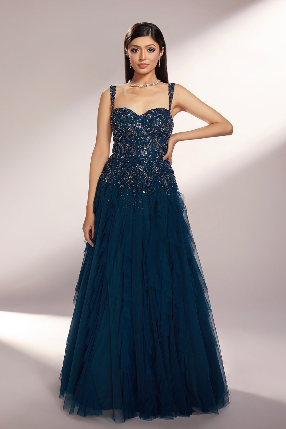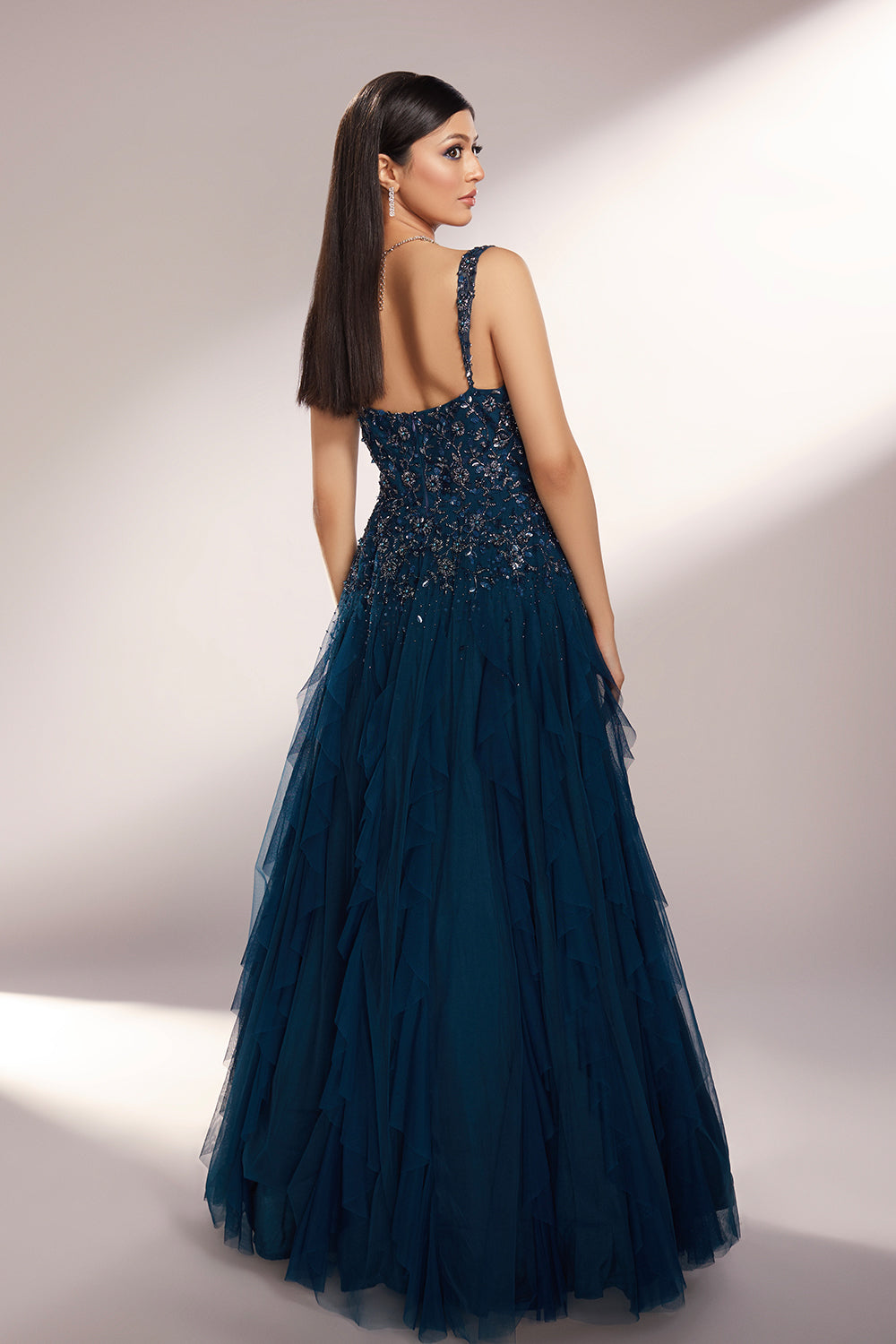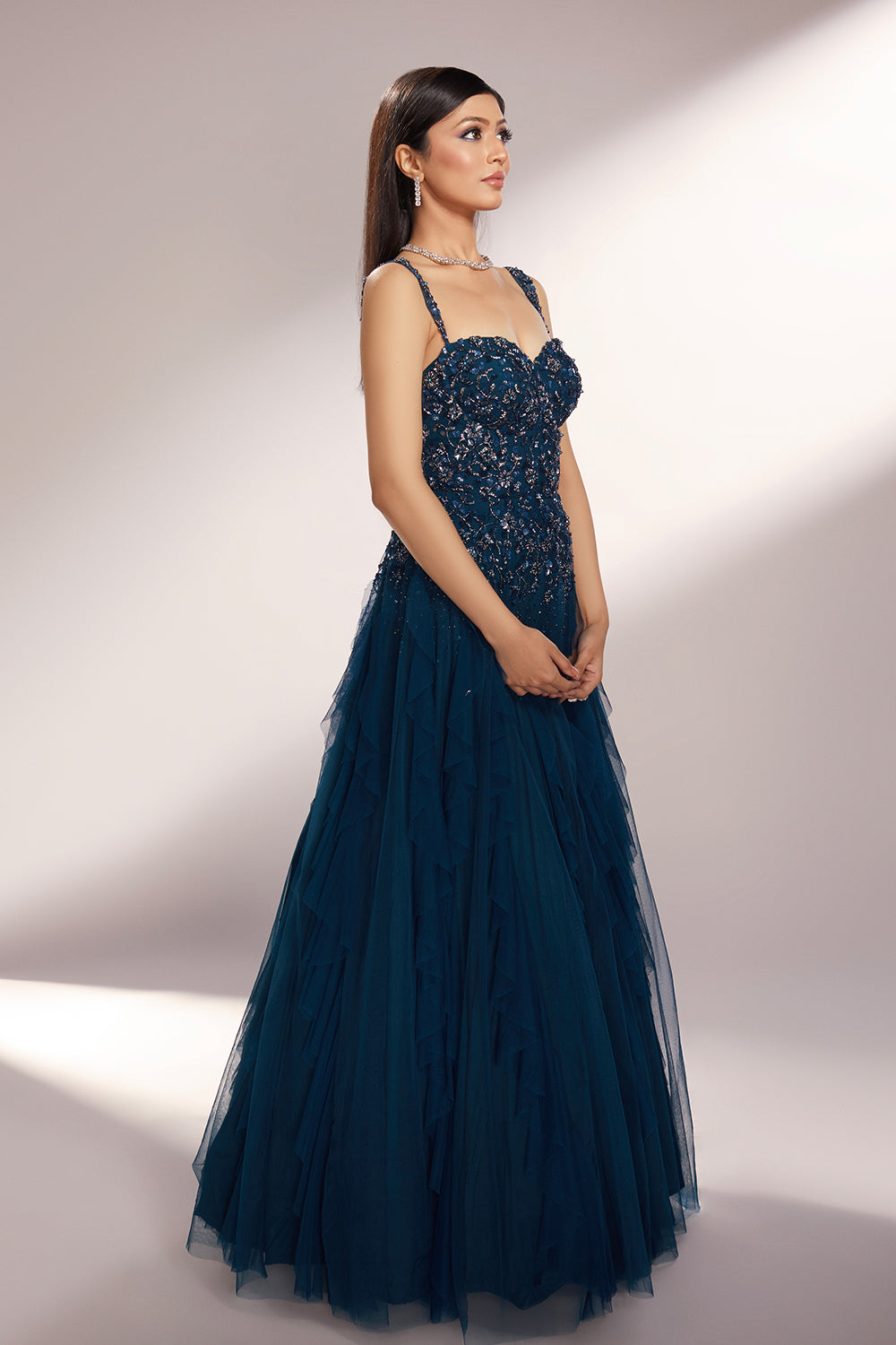 Deep teal toned ruffled gown paired with delicate floral embroidery with sequins, glass beads and pearls.