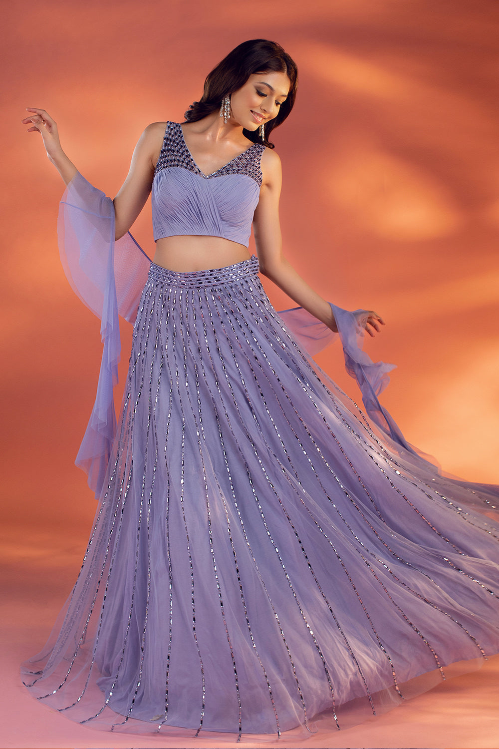 A periwinkle blue net base lehenga embroidered with flat crystal beads, paired with a ruched and embellished blouse along with a ruffled dupatta.