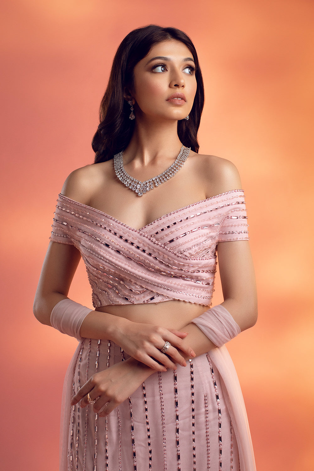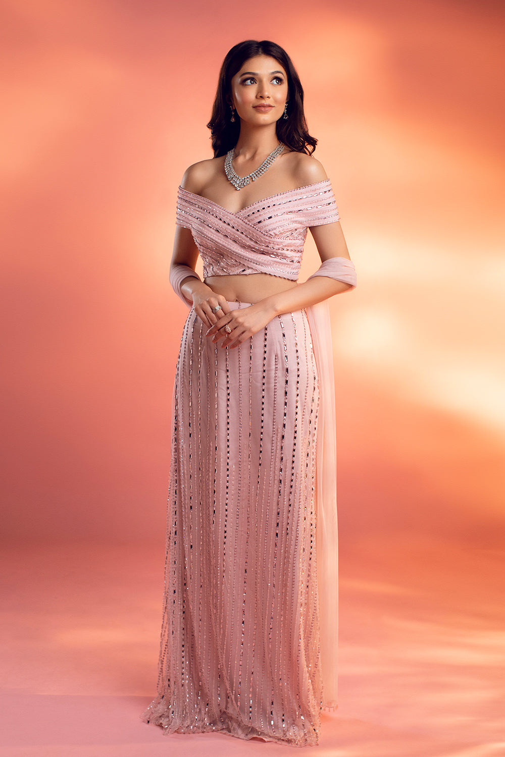 Pink skirt set embellished with flat crystal beads, glass beads, and crystal drops over a net base.
