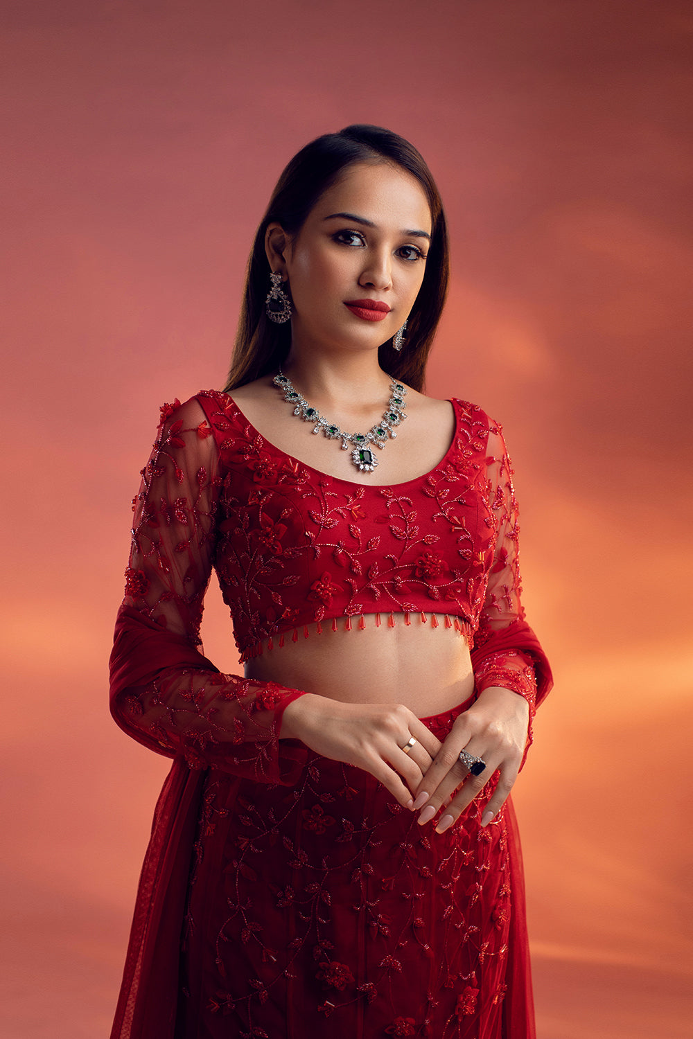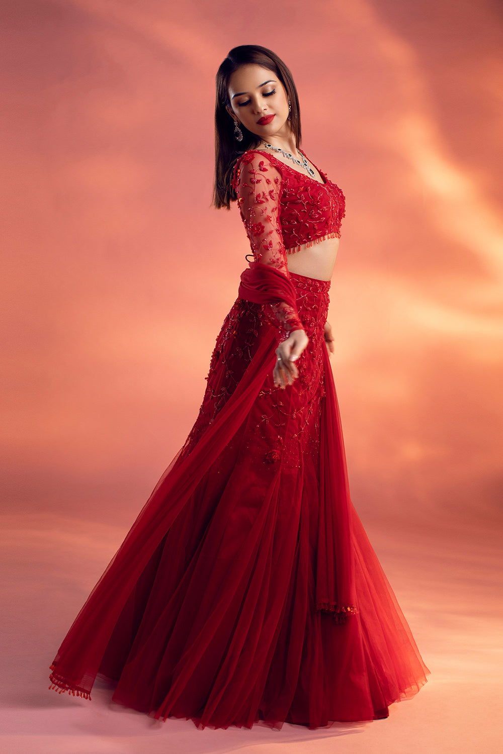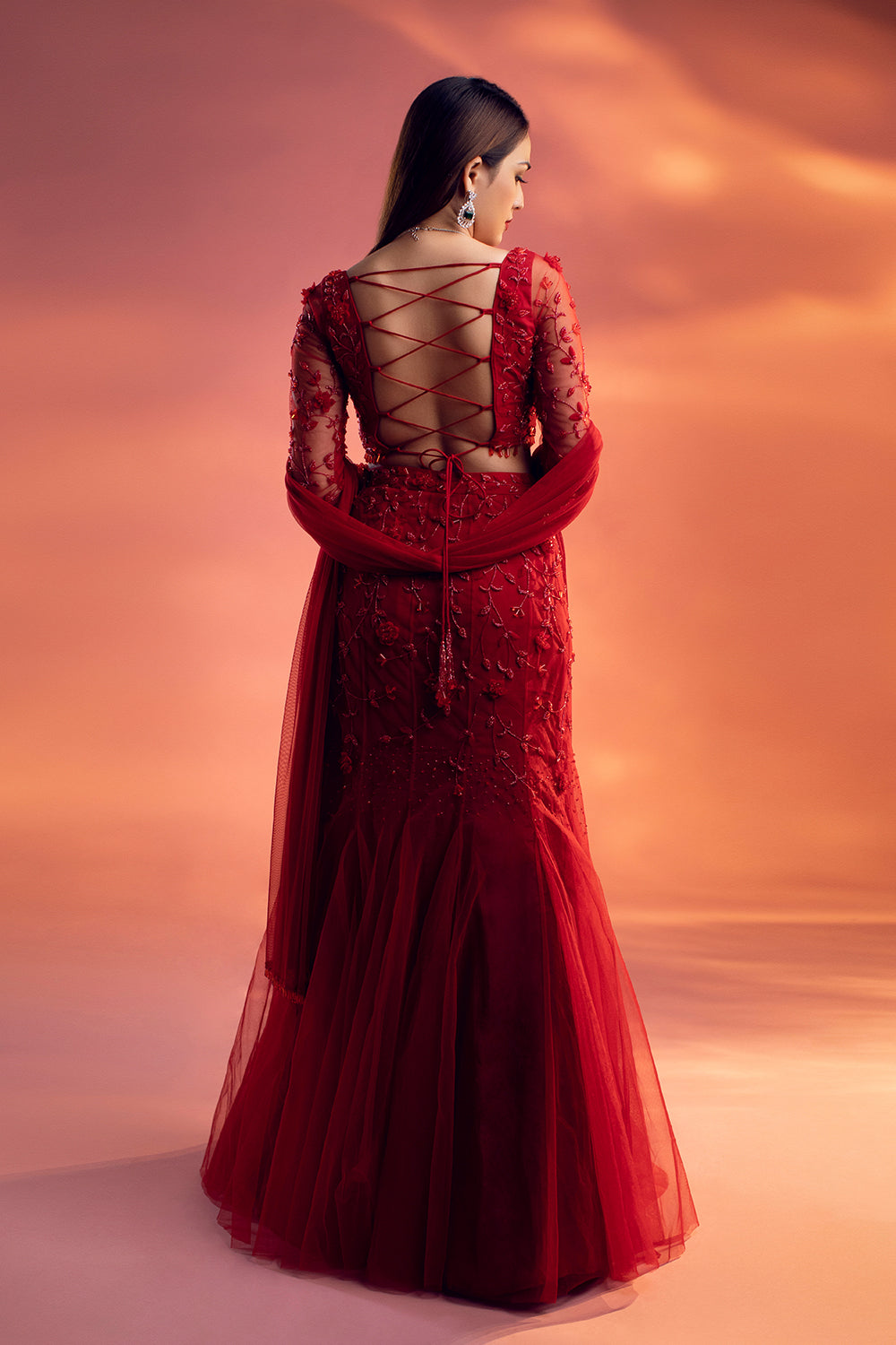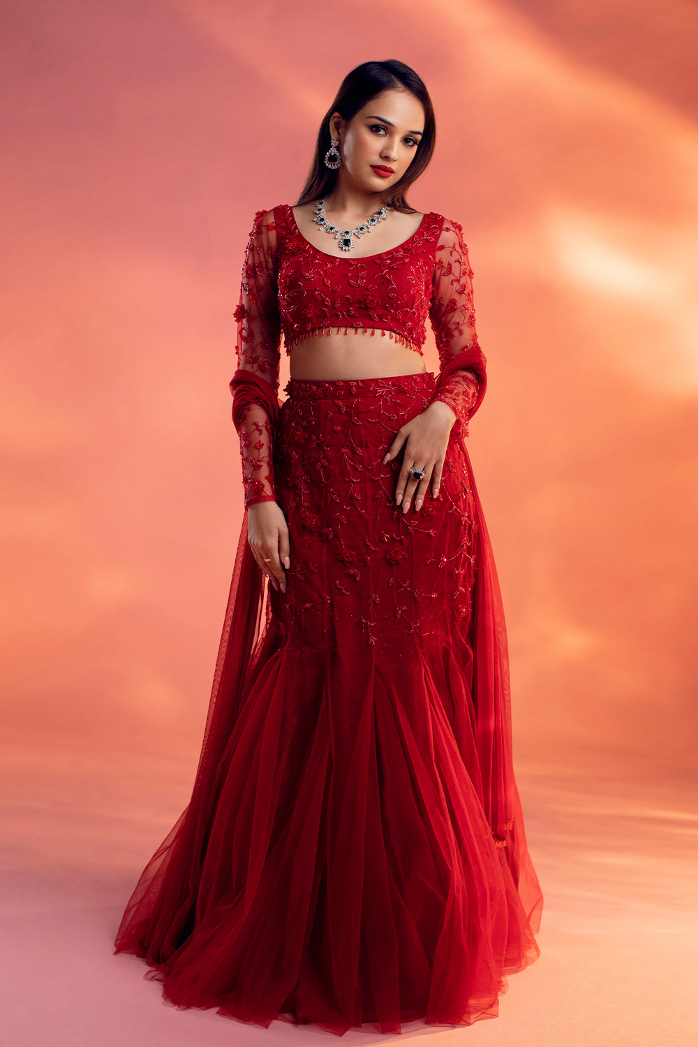 Red fishtail lehenga set embroidered with floral motifs made with net, glass beads and round crystal beads.