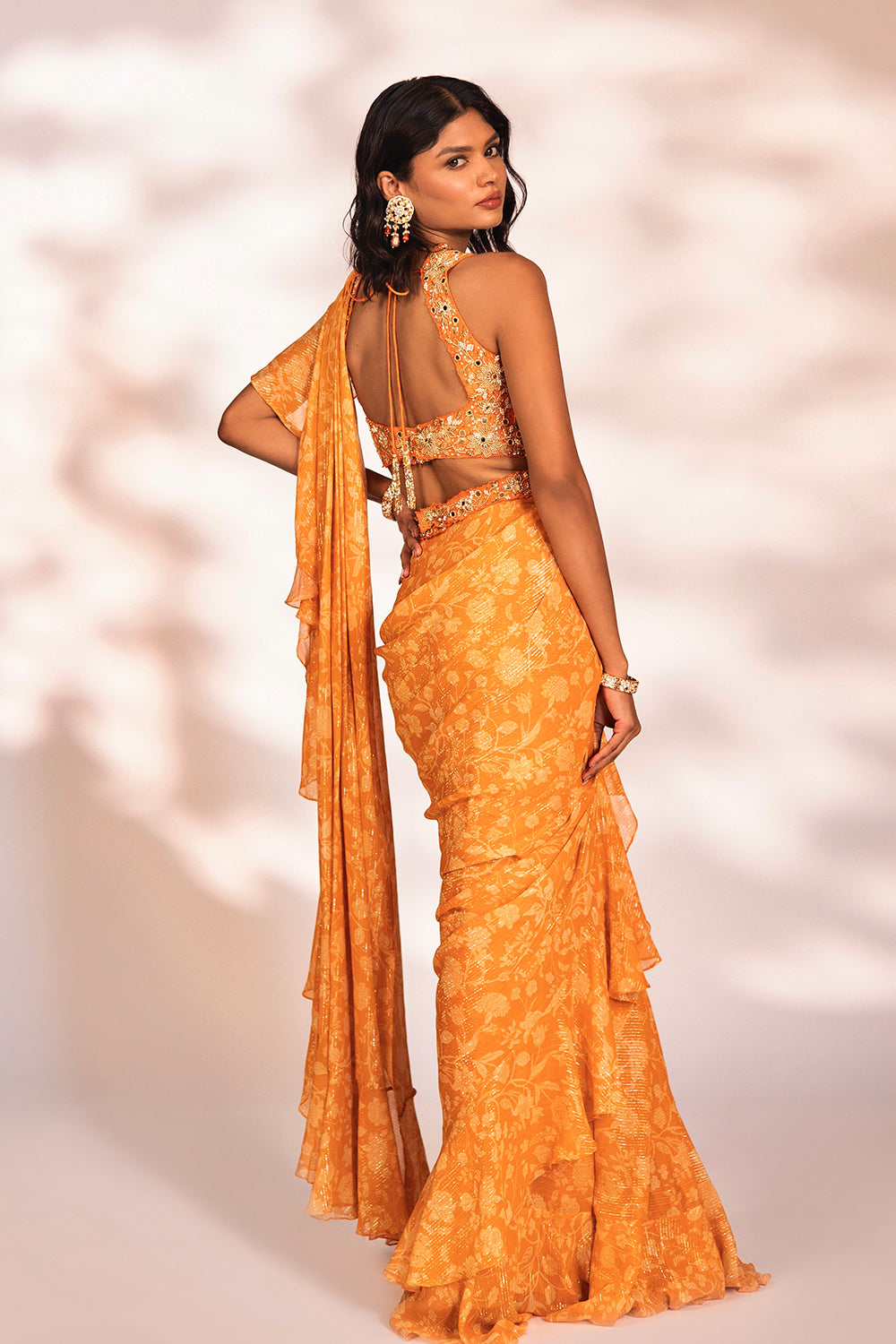 Orange printed ruffled saree with an embroidered blouse and waist belt.