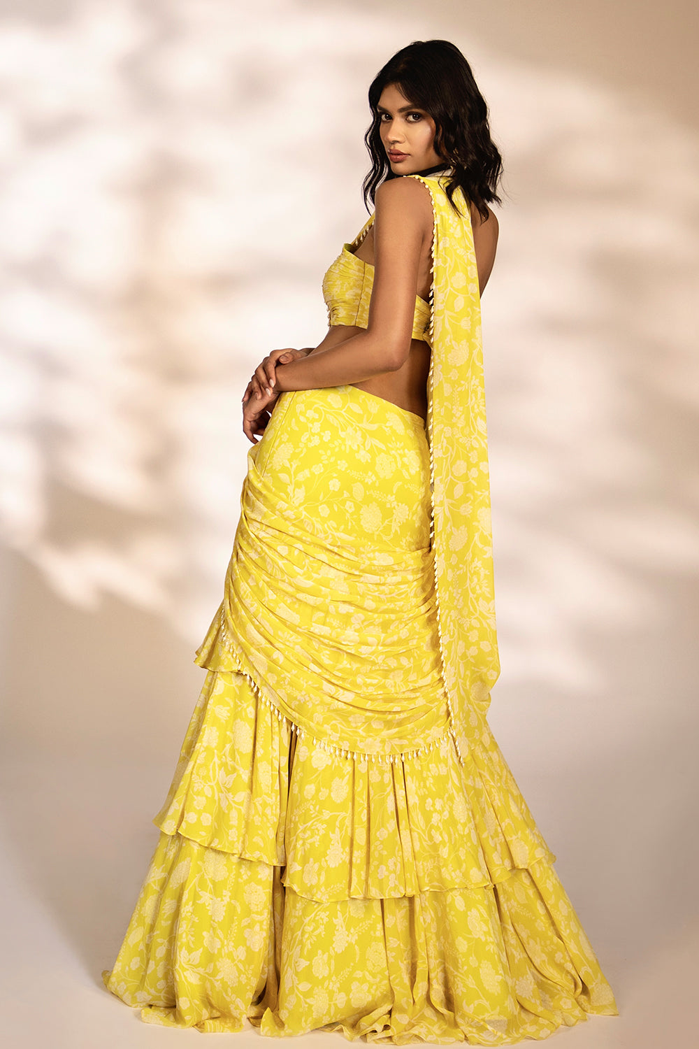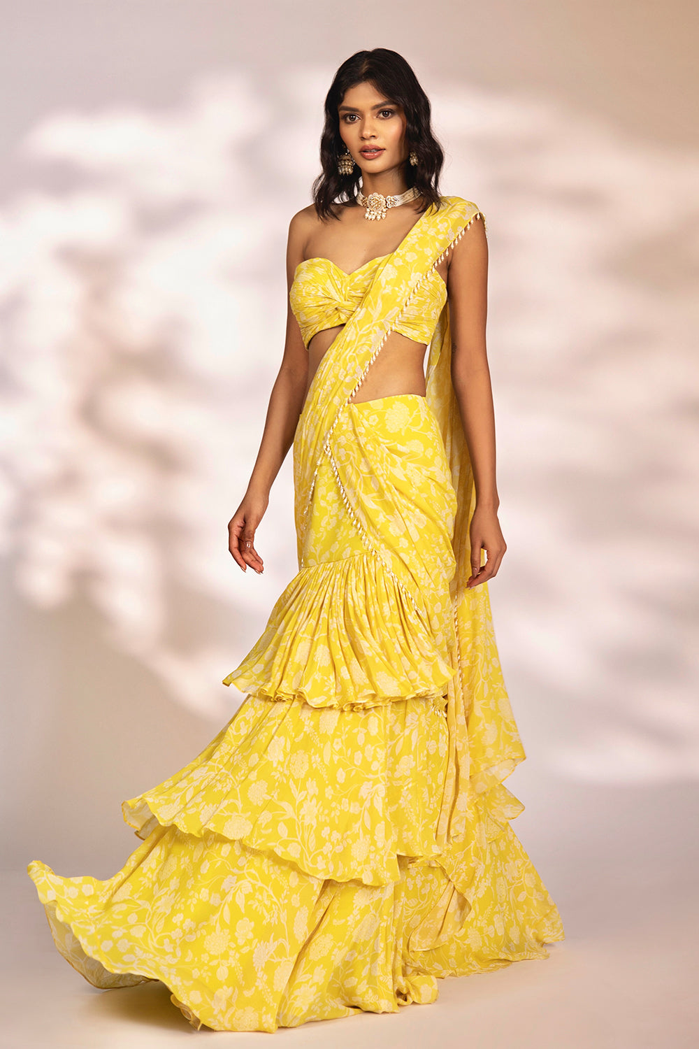Yellow printed pre-draped saree with pearl embellishments on pallu and knot style ruched blouse.