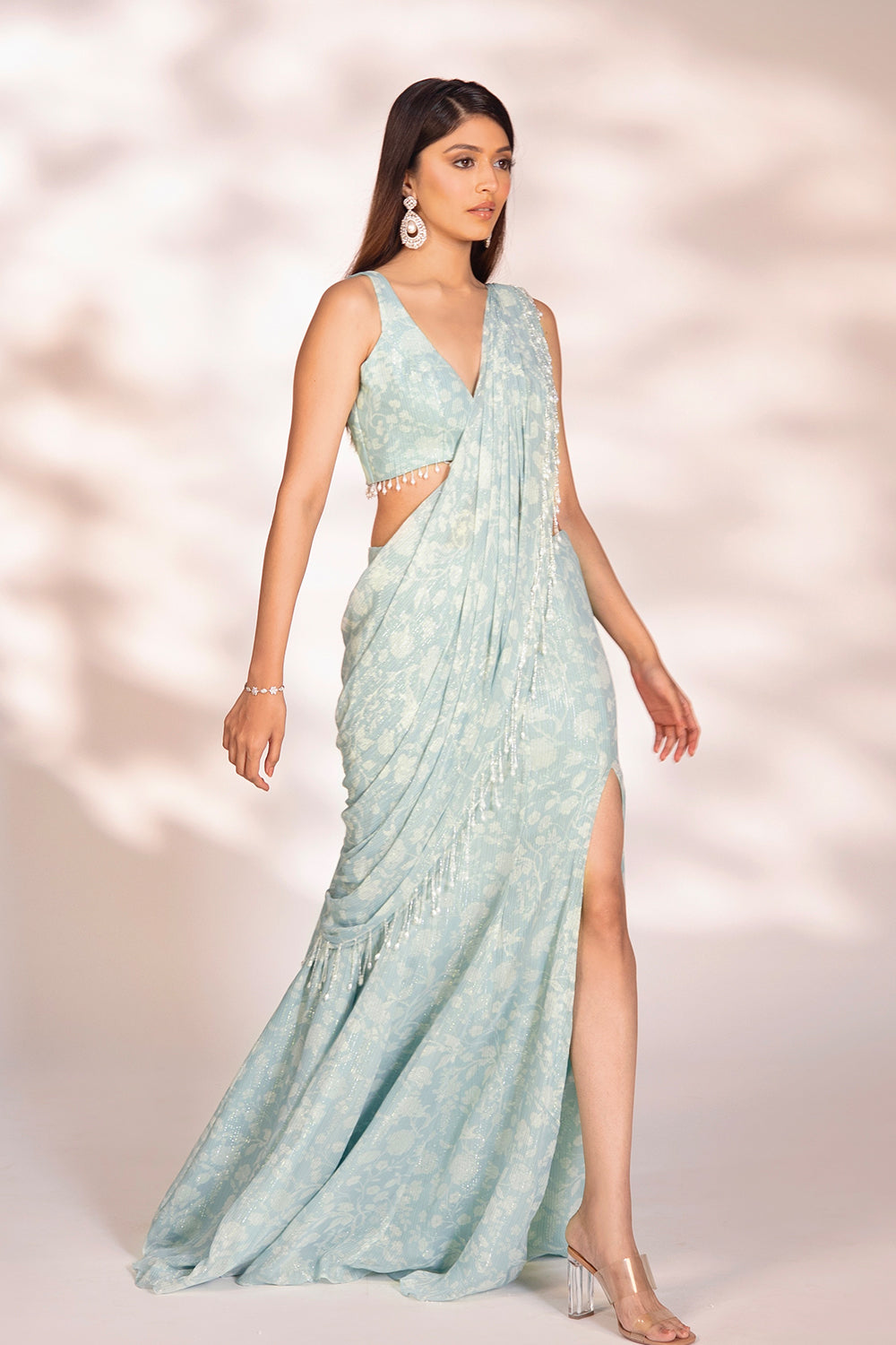 Blue printed pre-draped saree with embroidered tassels on pallu and blouse.