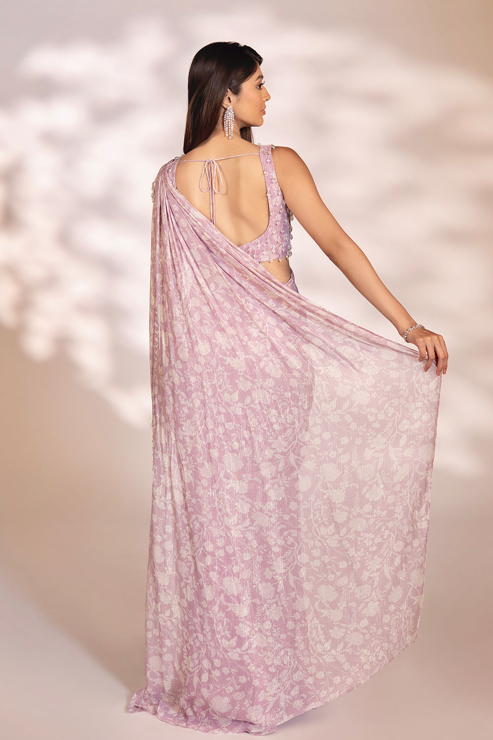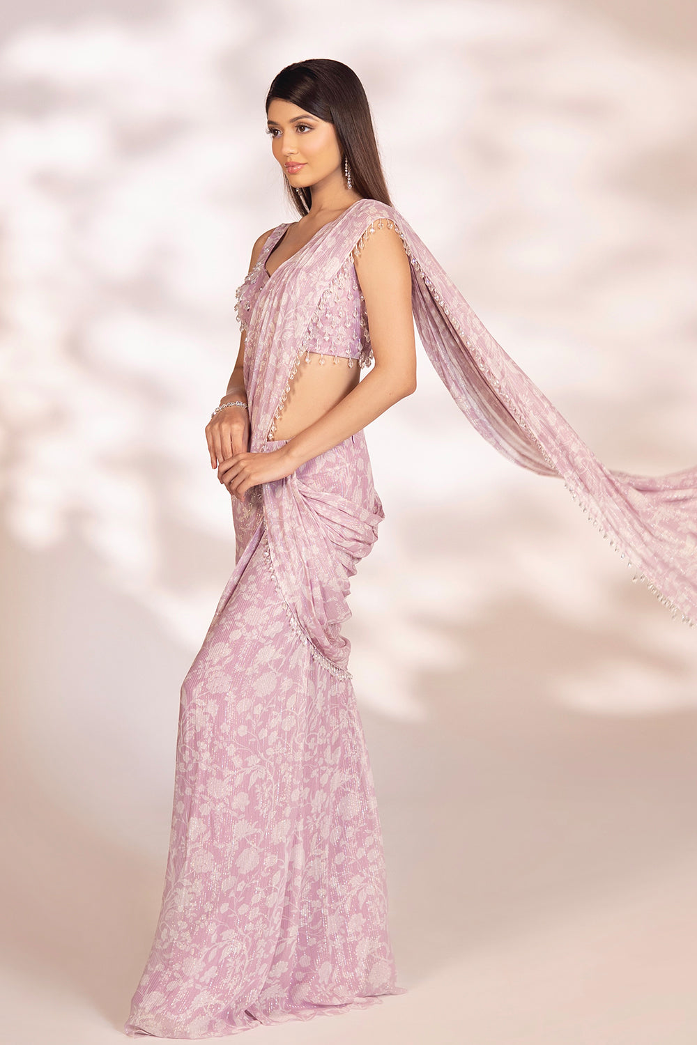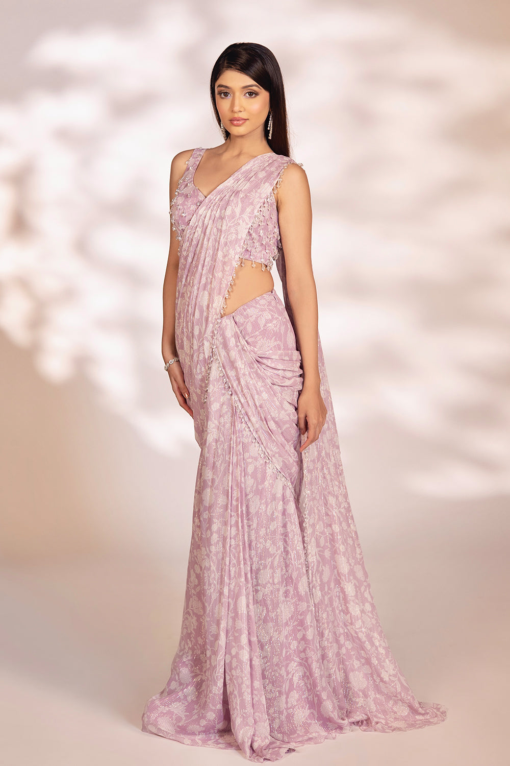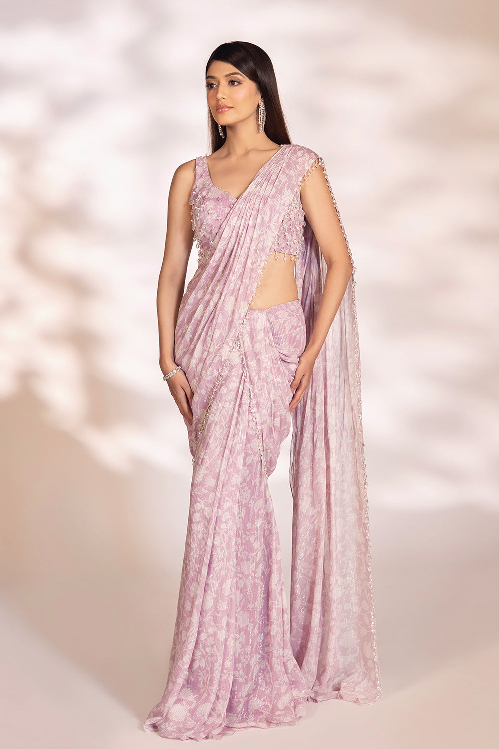 Purple pre-draped saree with glass drop hangings embellished on the blouse and pallu.