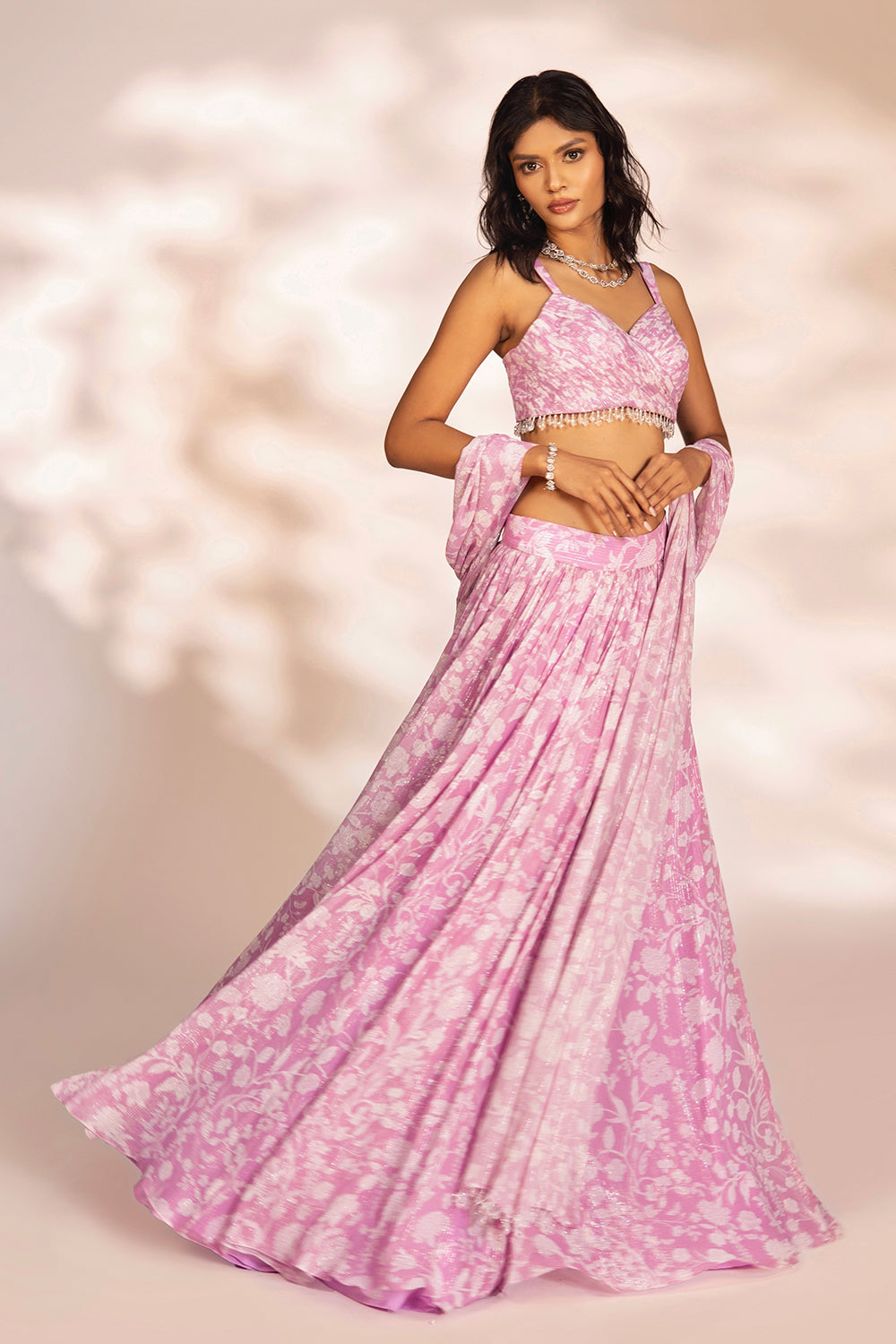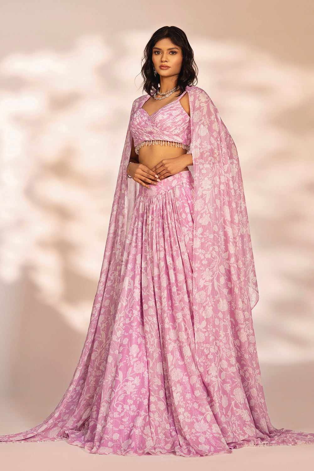 Bright lilac lehenga set with a ruched blouse and glass drops embroidery on blouse hem and dupatta.
