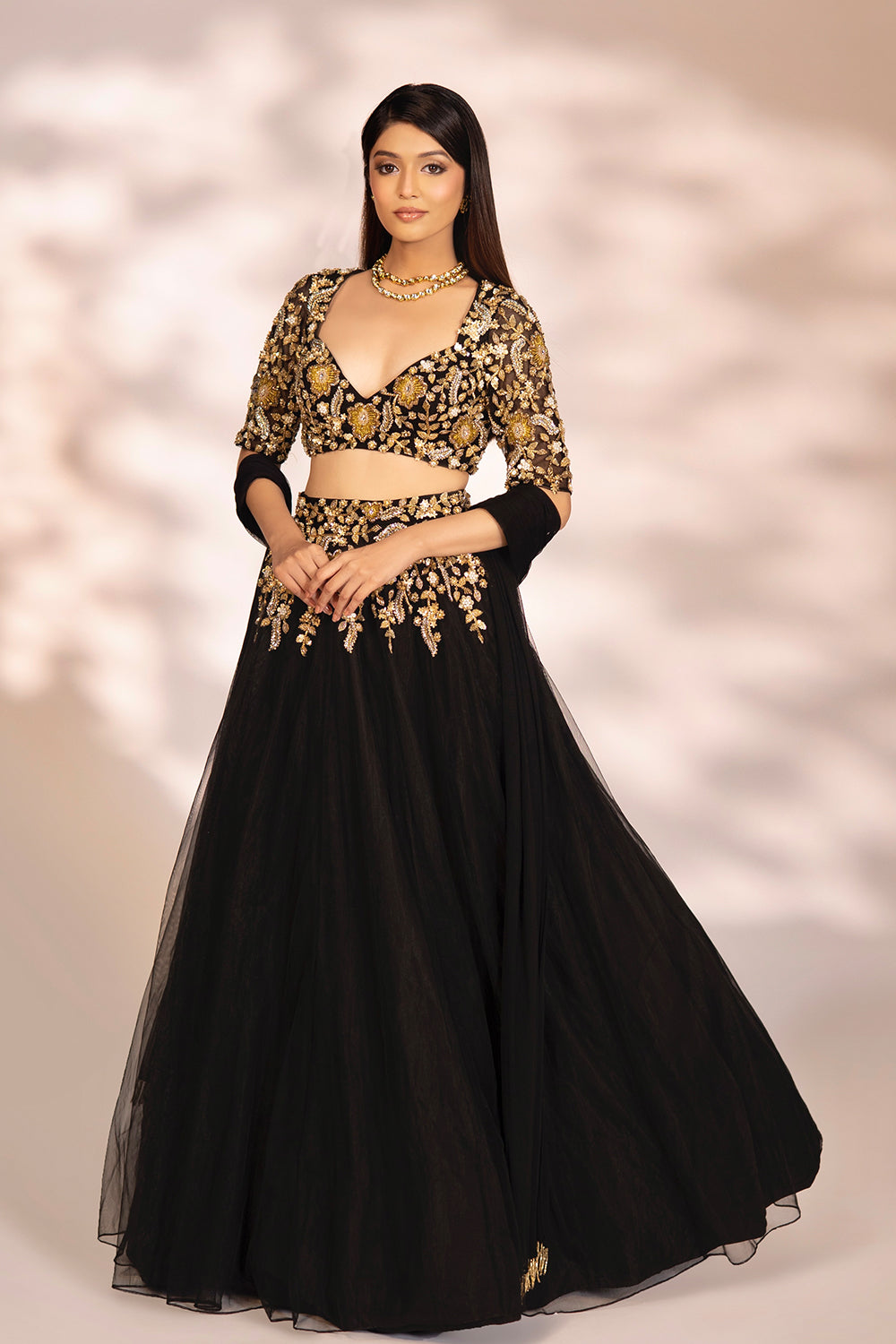 Black lehenga with embellishments on blouse, skirt and dupatta hem.