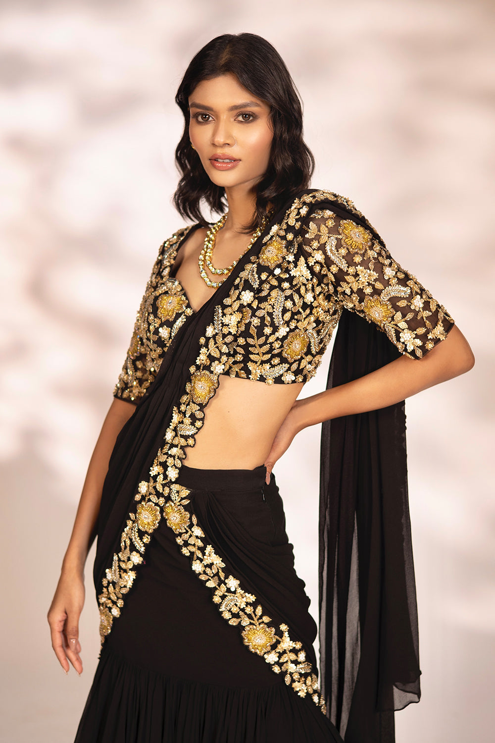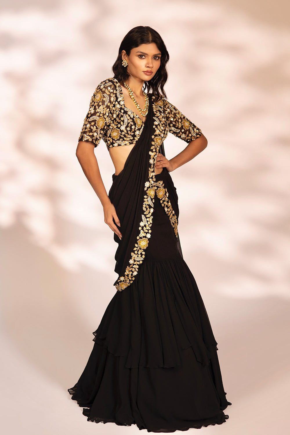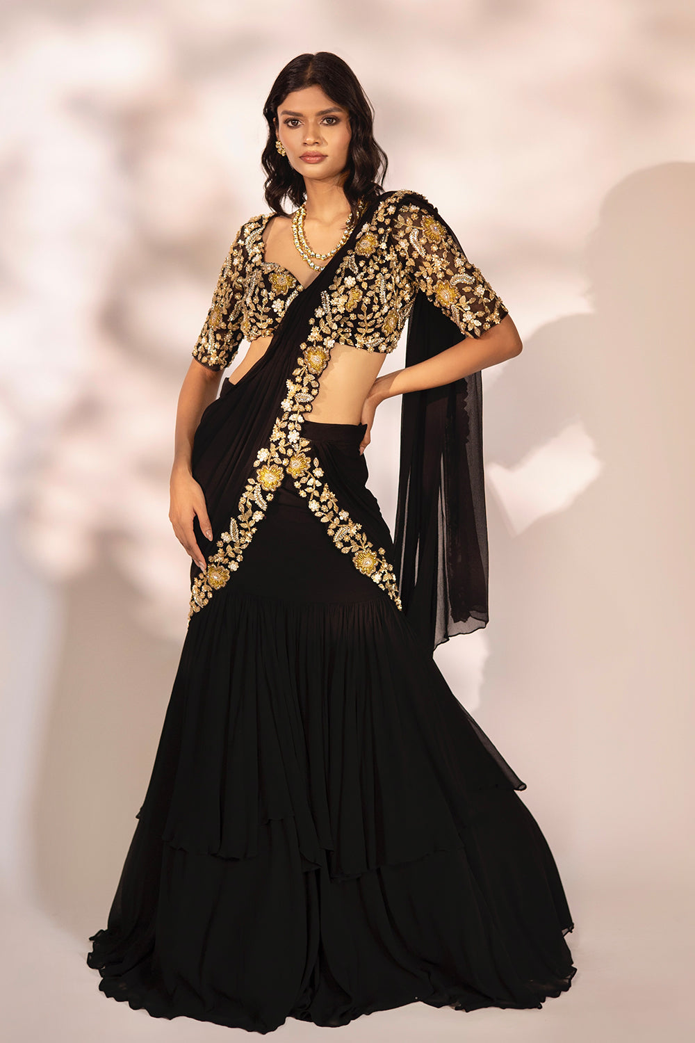 Black pre-draped saree with embroidered blouse and drape.
