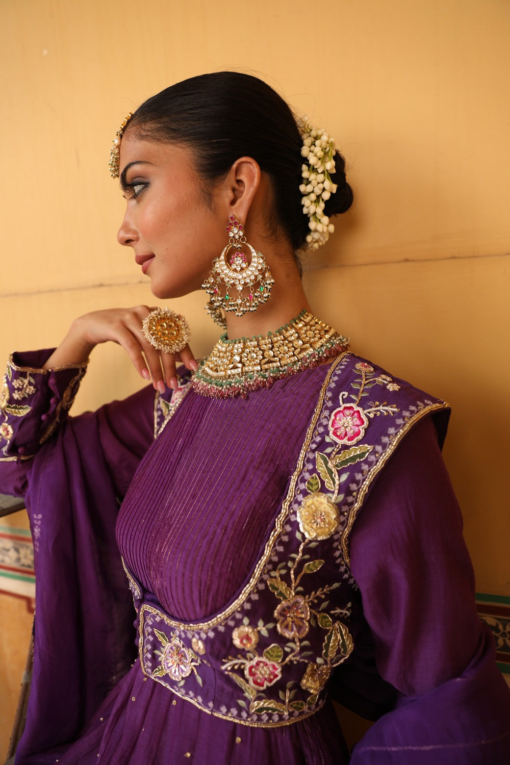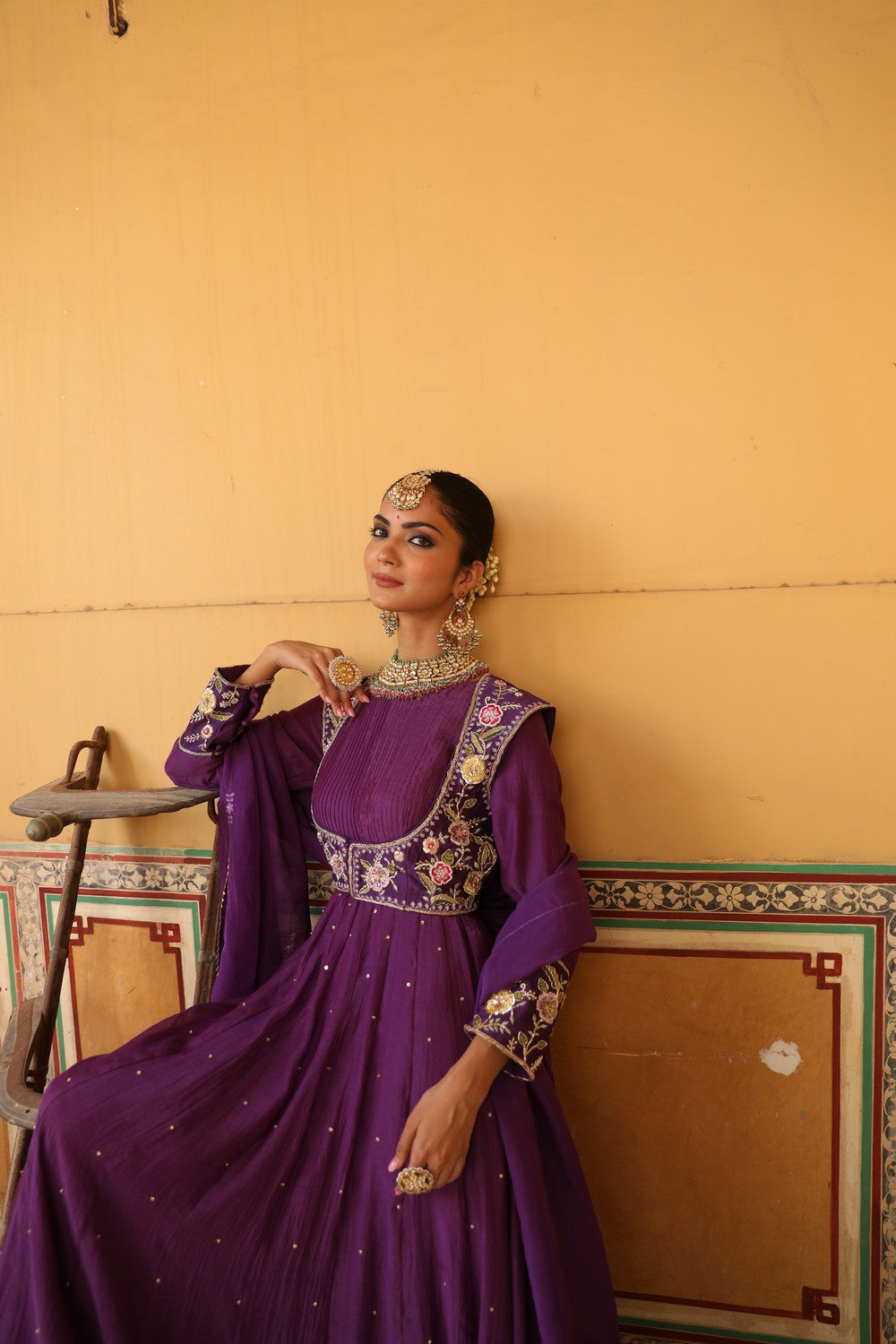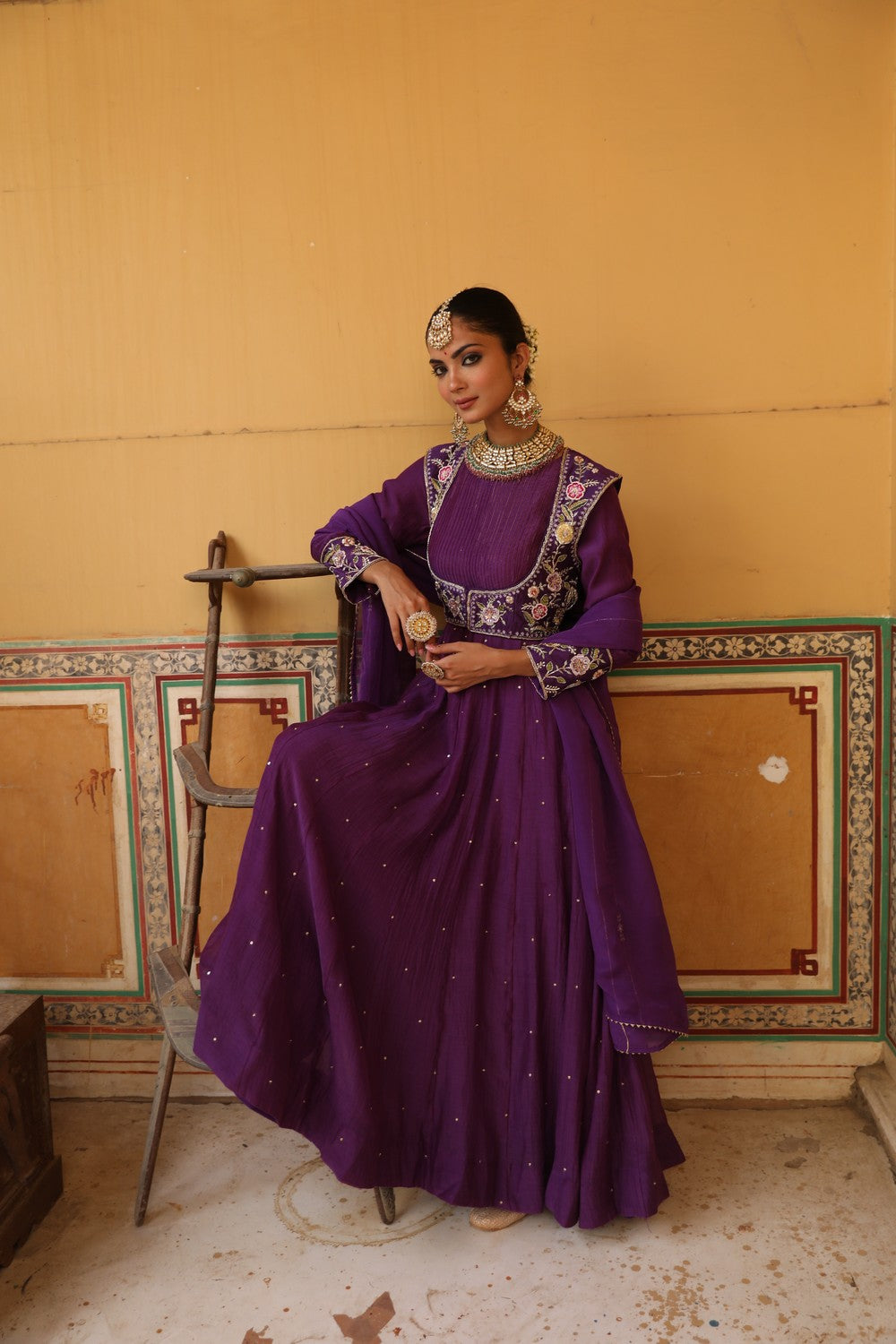 Elevate your festive wardrobe with the Kashni Anarkali Set, crafted in luxurious silk and lined with soft 100% cotton. The royal purple Anarkali features exquisite thread aari and zardosi hand embroidery, giving it a timeless and elegant appeal. This 3-piece stitched ensemble includes a flowing 54-inch Anarkali, a 15-inch jacket, and a 2.5-meter dupatta, perfect for weddings and special occasions.