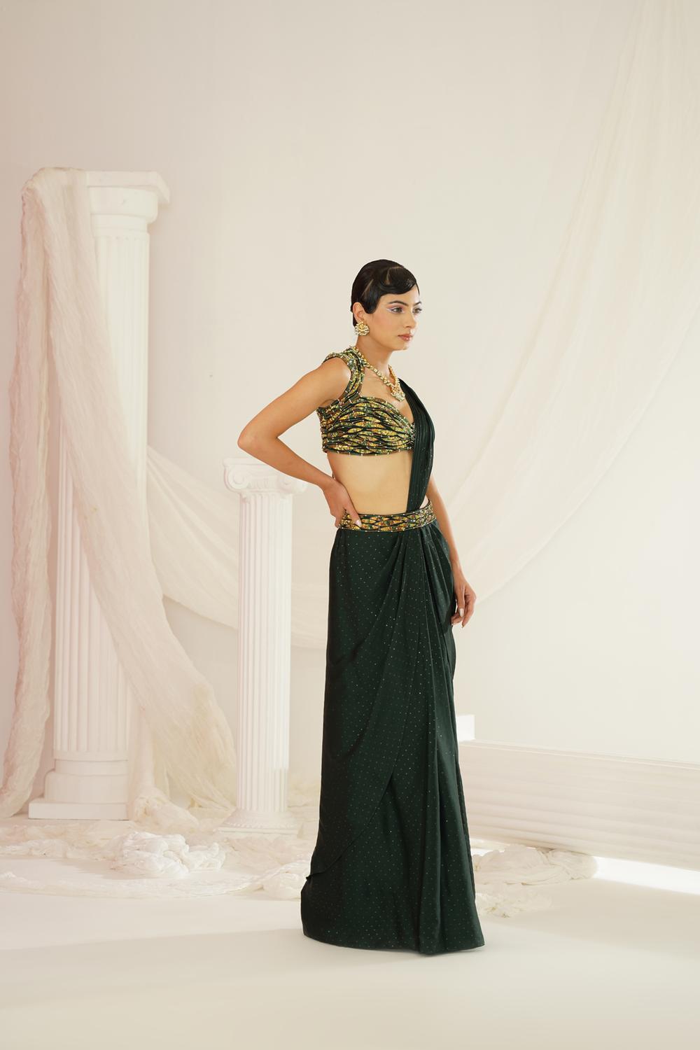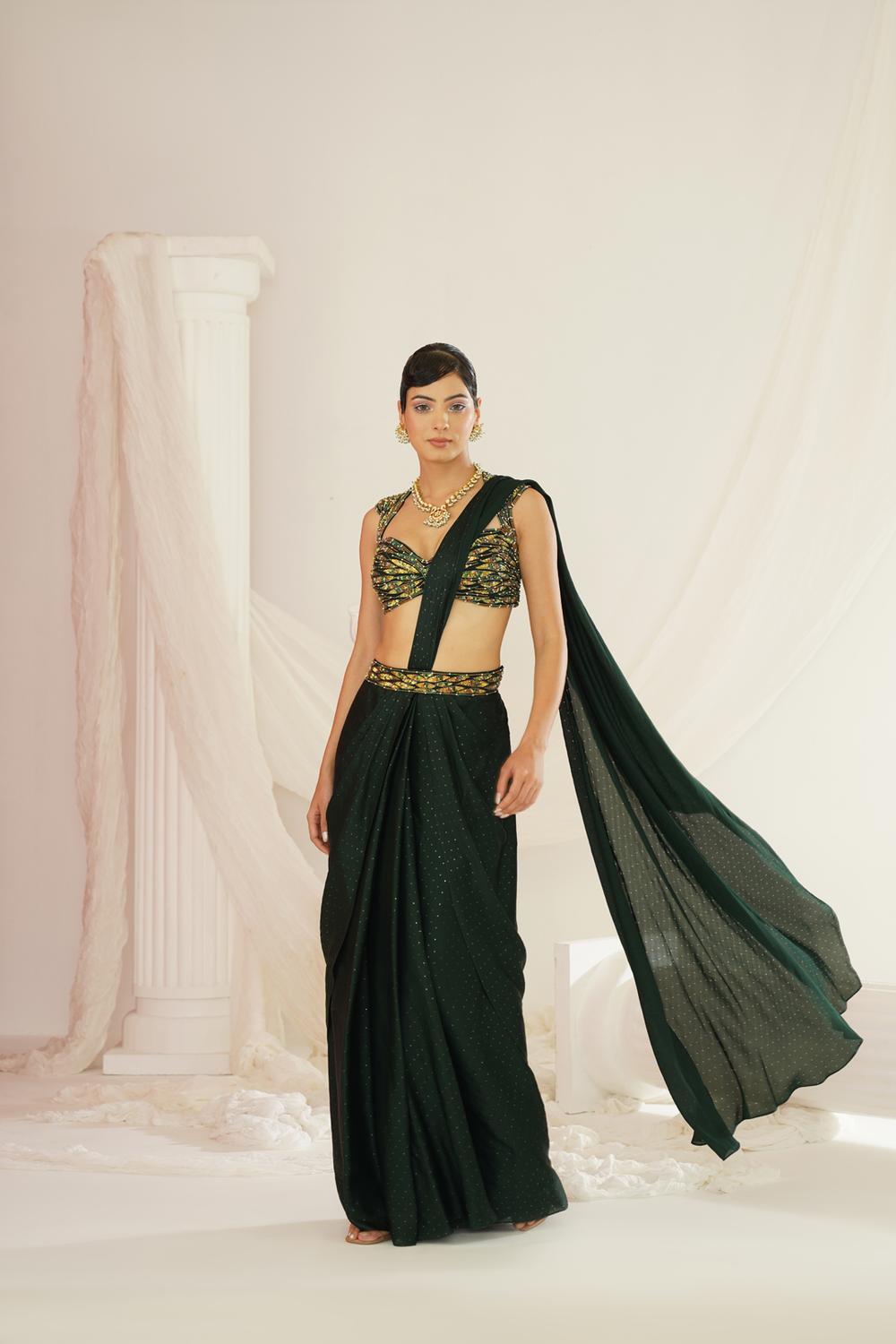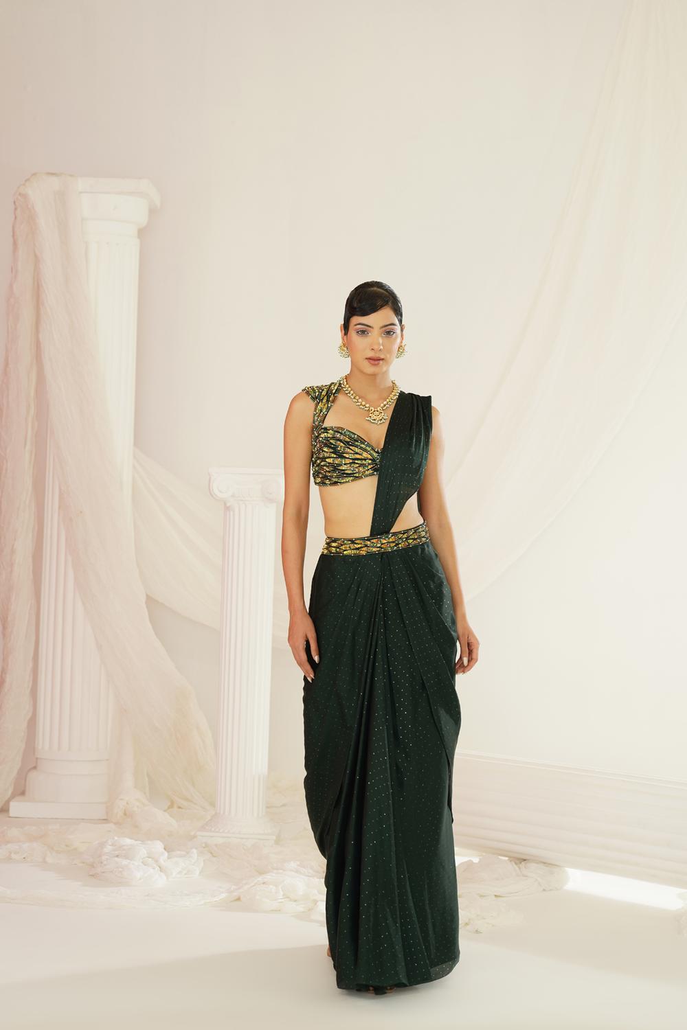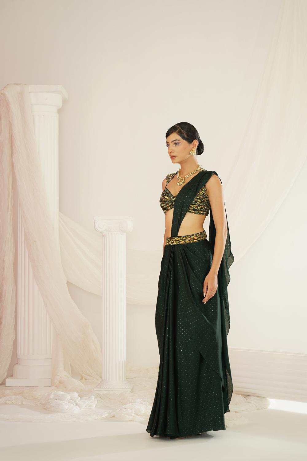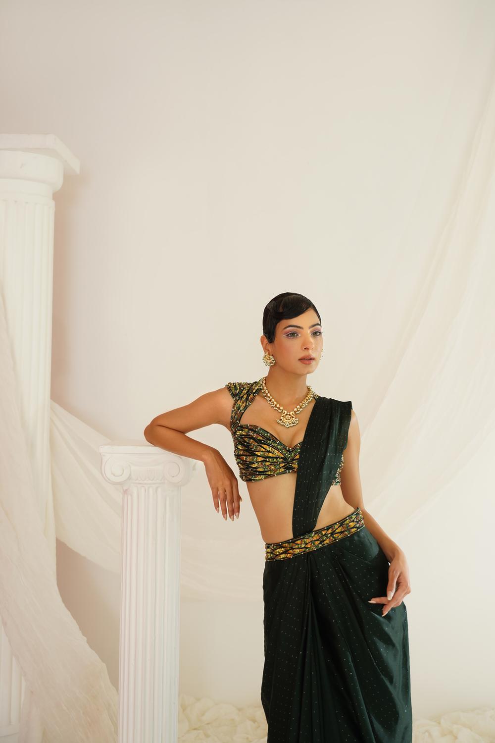 Forest Green Embroidered Blouse With Ready To Wear Drape Saree Set