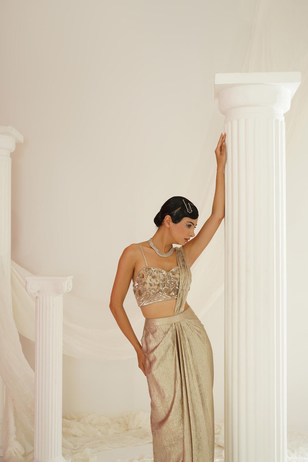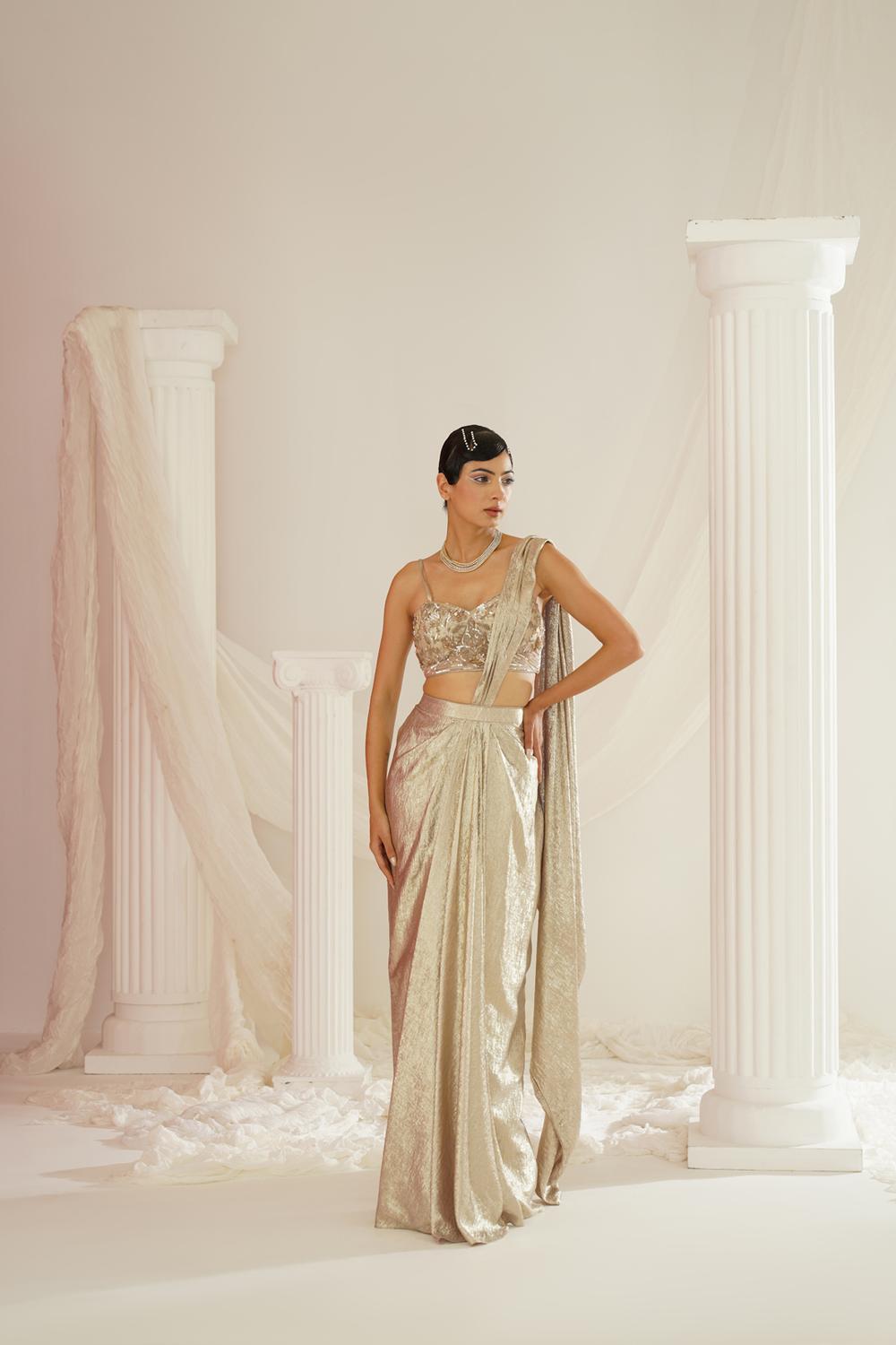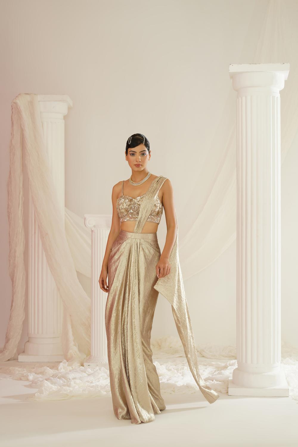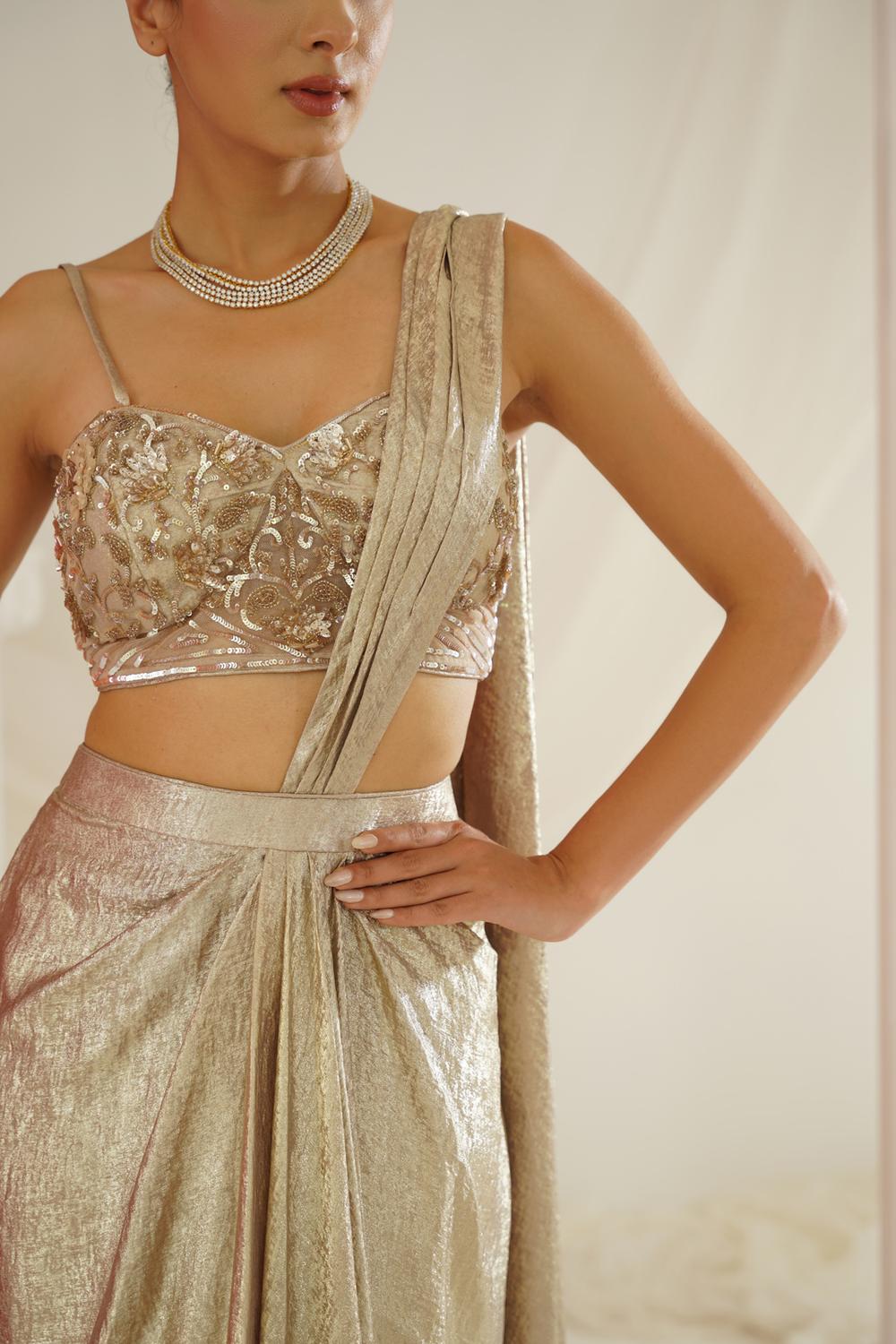 Gold Embroidered Blouse With Ready To Wear Drape Saree Set