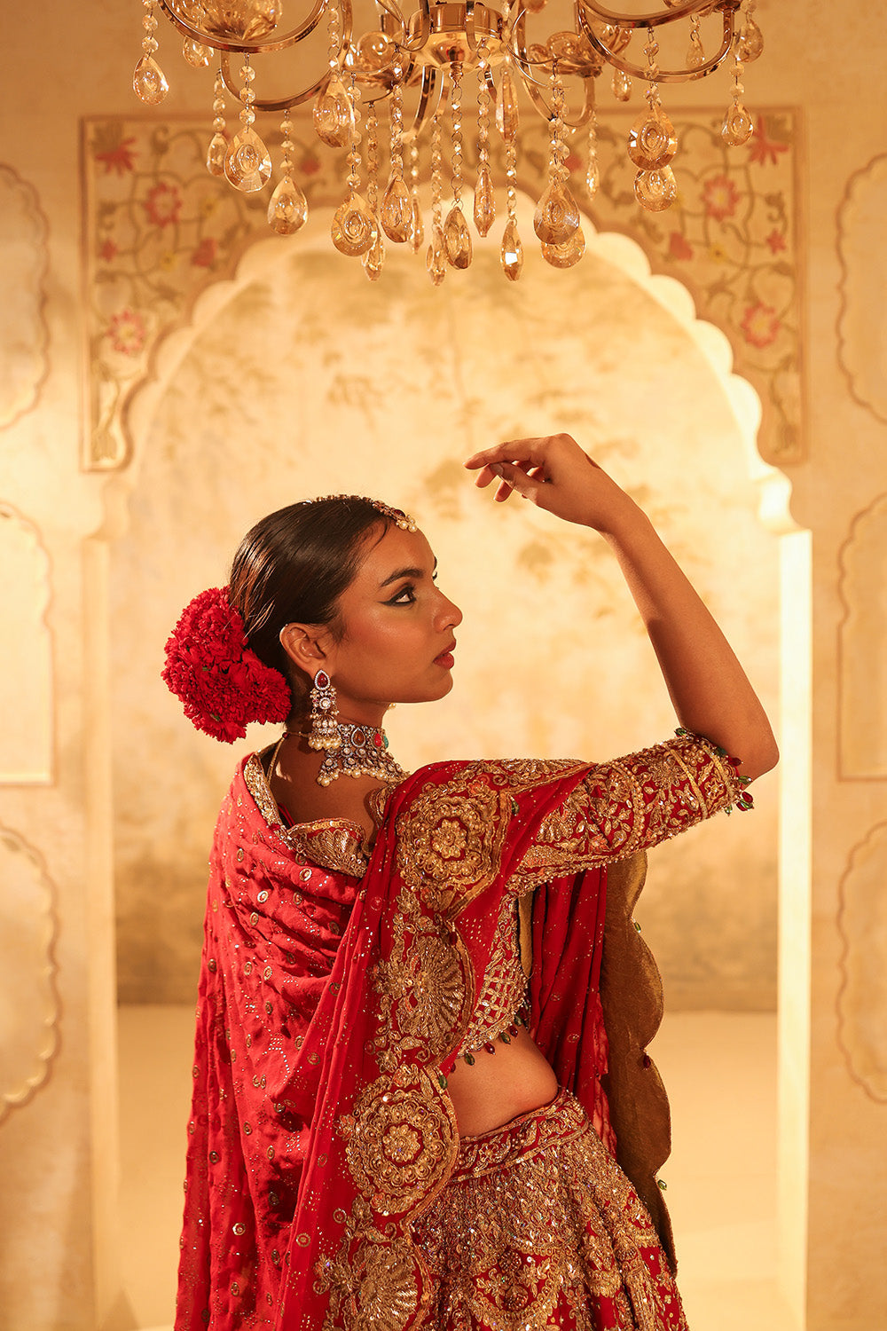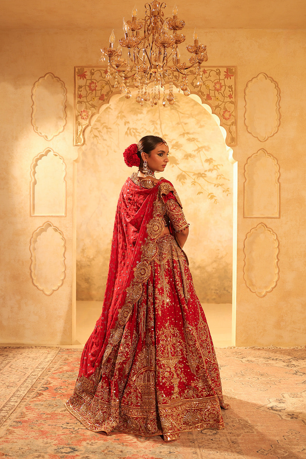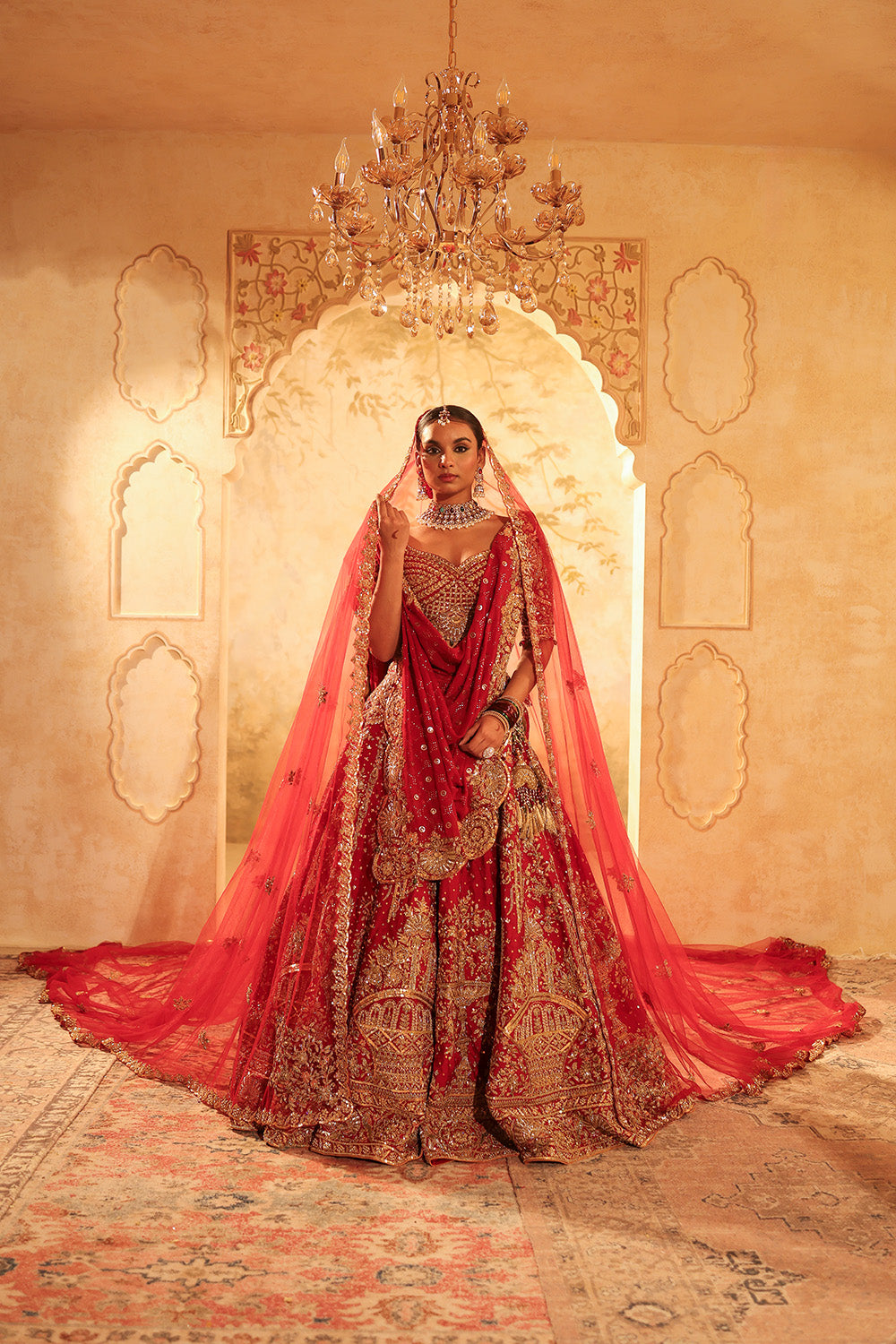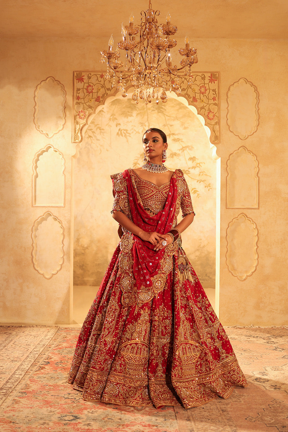 Kapda Dori's luxury look is a Maroon bridal lehenga crafted with rich Pure Dupion silk fabric beautifully adorned with intricate dori, nakshi, dabka, resham, cutdana and sequins embroidery. This exquisite ensemble is designed to make a statement with vibrant maroon hue designs with an extravagant look for the new-age bride. The lehenga features a flowing, full-length structured look. It is styled with a red pure silk embroidered blouse, shimmer organza red dupatta adorned with tessels detailing. It comes with a complimentory net veil to complete the look for our Indian modern bride.