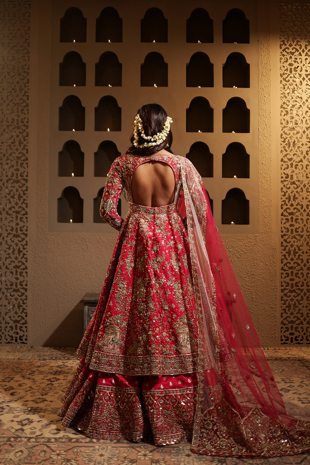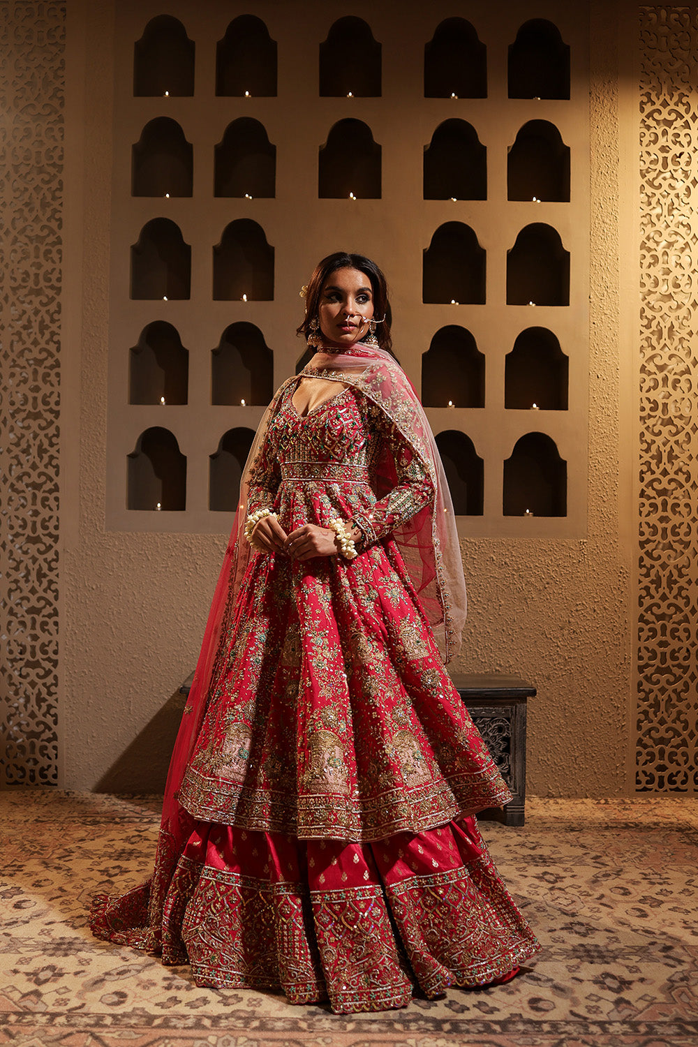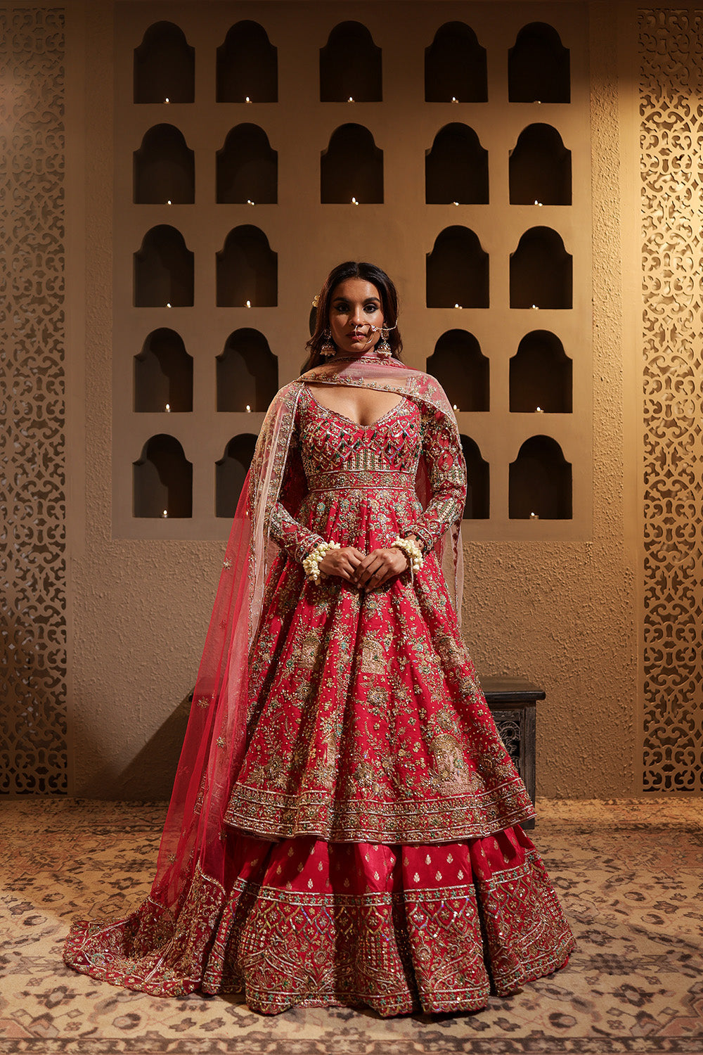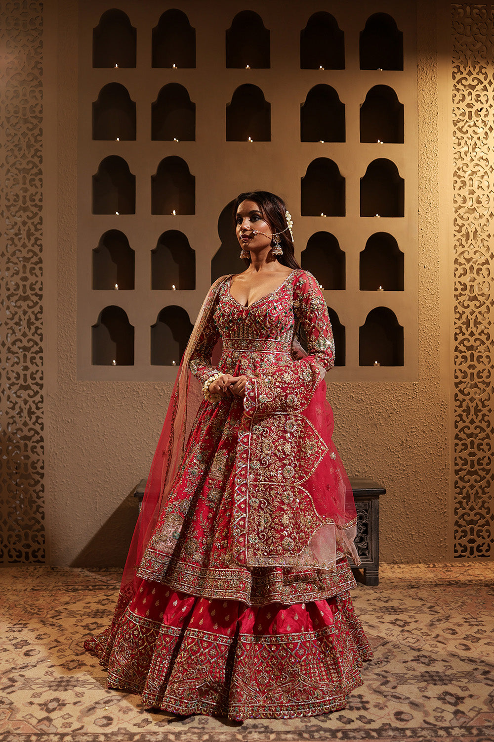 Kapda Dori's luxury look is a Fusia bridal lehenga crafted with rich Banarsi booti silk fabric beautifully adorned with intricate dori, nakshi, resham, pearls, cutdana and colorful sequins embroidery. This exquisite ensemble is designed to make a statement with vibrant fusia hue designs with an extravagant look for the new-age bride. The lehenga features a flowing full-length structured look. It is styled with a fusia pure silk embroidered Anarkali with tessels detailing. It comes with a complimentory net dupatta to complete the look for our Indian modern bride.
