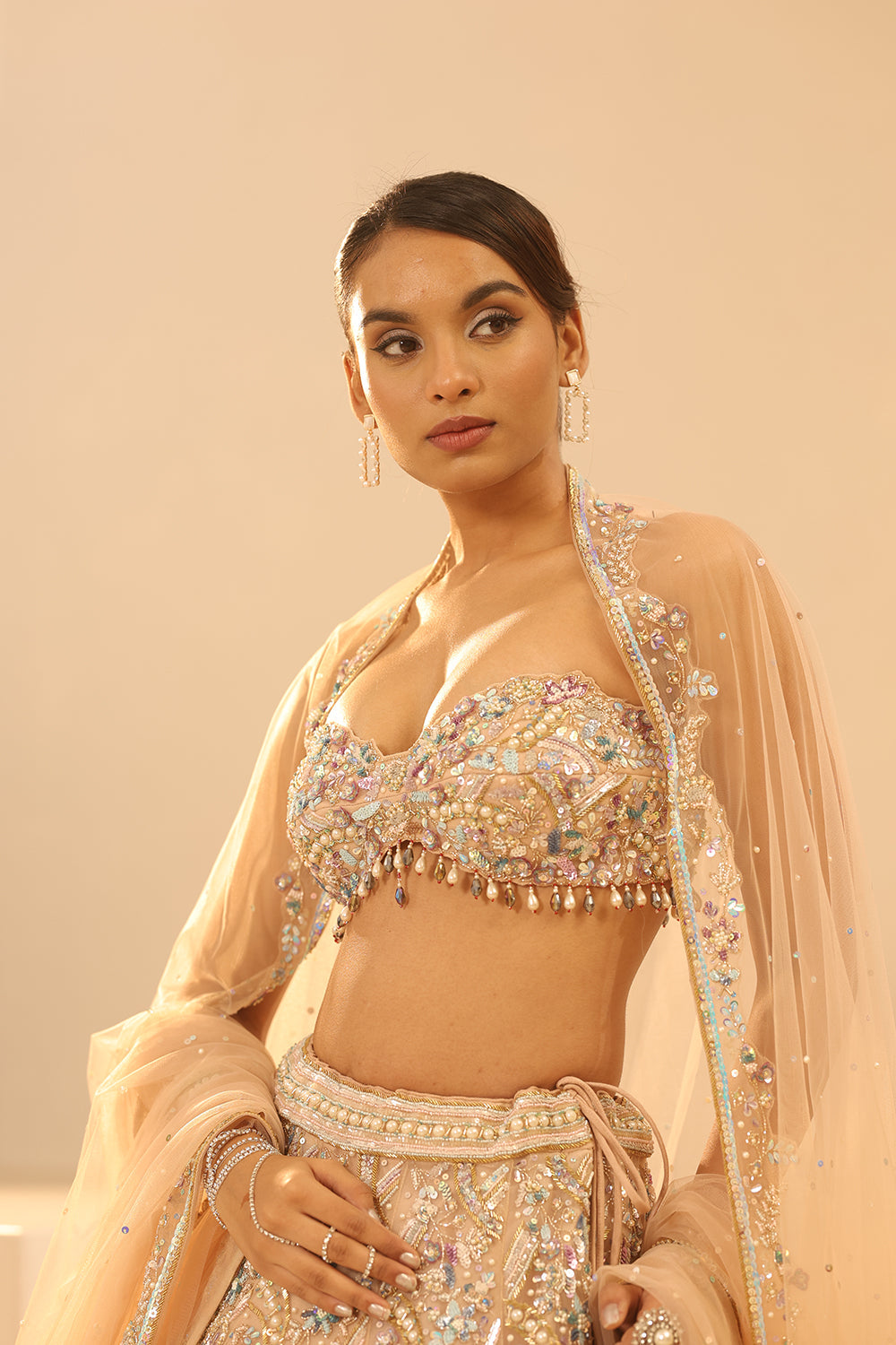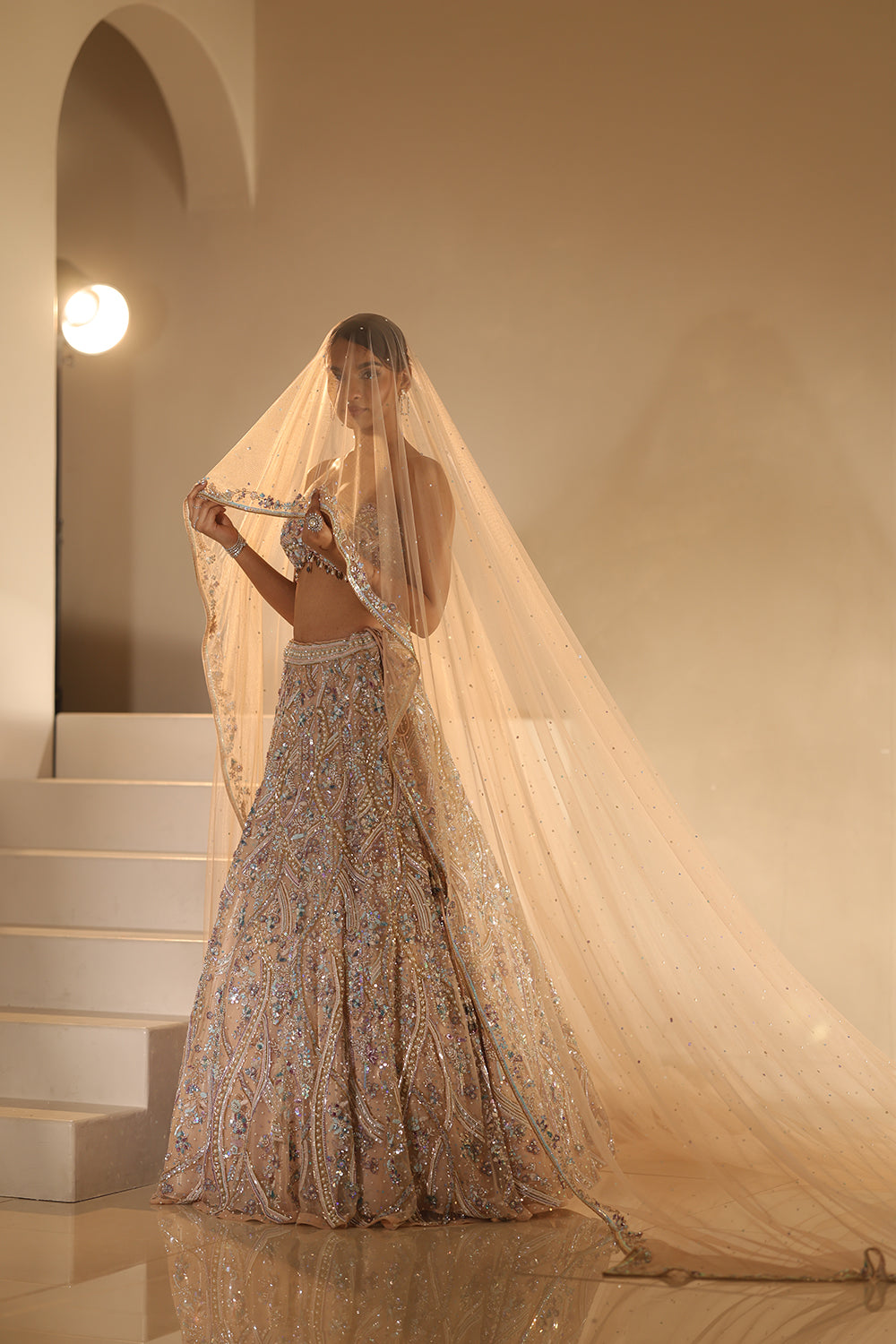 Kapda Dori's stunning nude net fabric lehenga with shimmer glass tissue lining, beautifully adorned with intricate pearls, multocolor sequins and cutdana embroidery. The lehenga features a flowy yet structured look. The nude color adds a touch of glamour and sophistication to your look, while the soft net texture ensures you feel comfortable all day or night long. It is styled with a nude tube embroidered net blouse. Pair it with long embroidered soft net veil.