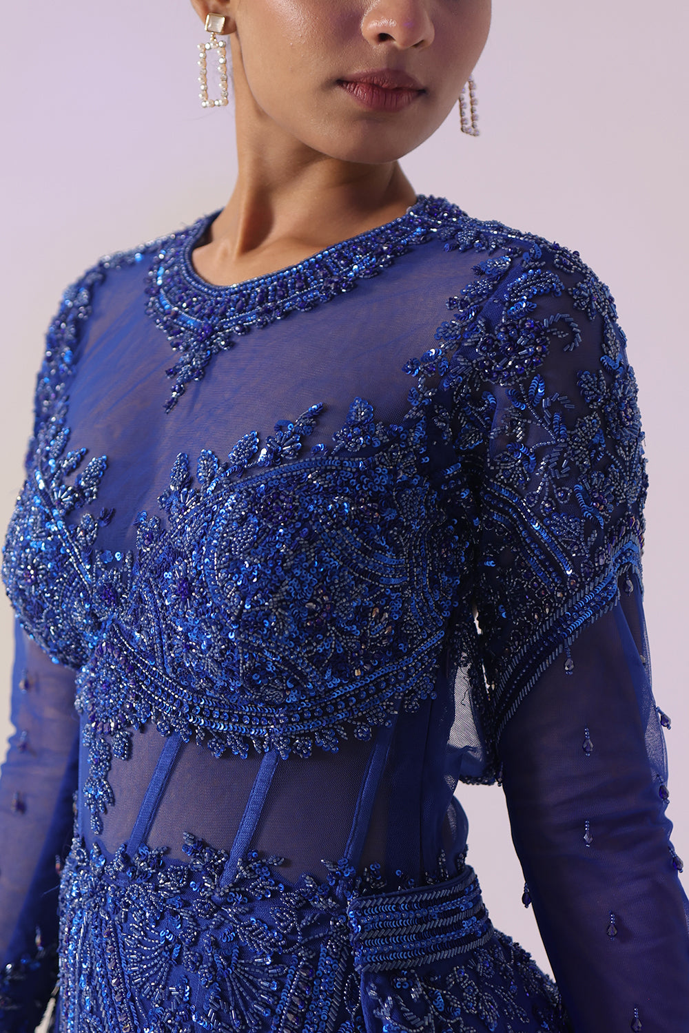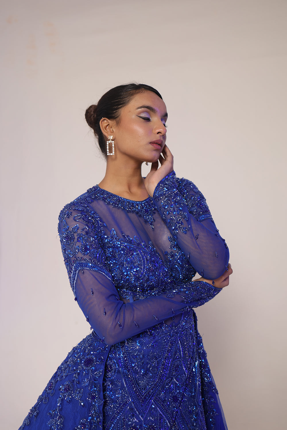 Kapda Dori's stunning royal blue net fabric gown, beautifully adorned with intricate crystals, sequins, beads and cutdana embroidery. The lehenga features a flowy yet structured look with high thigh slit. The royal blue color adds a touch of glamour and sophistication to your look, while the soft net texture ensures you feel comfortable all day or night long. It is styled with a blue lace net embroidered detachable outer skirt.